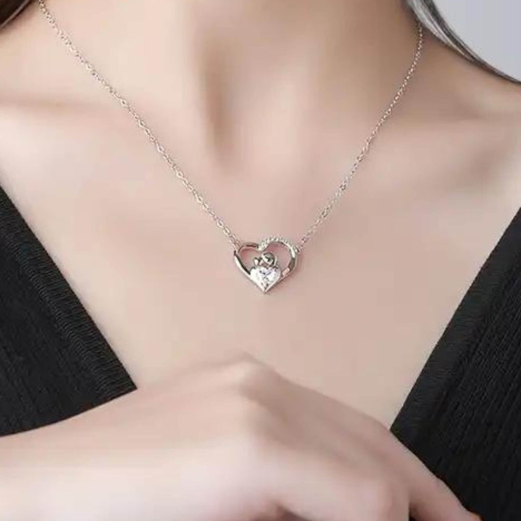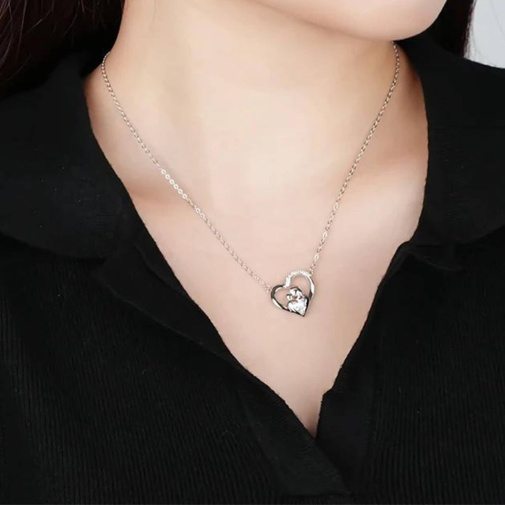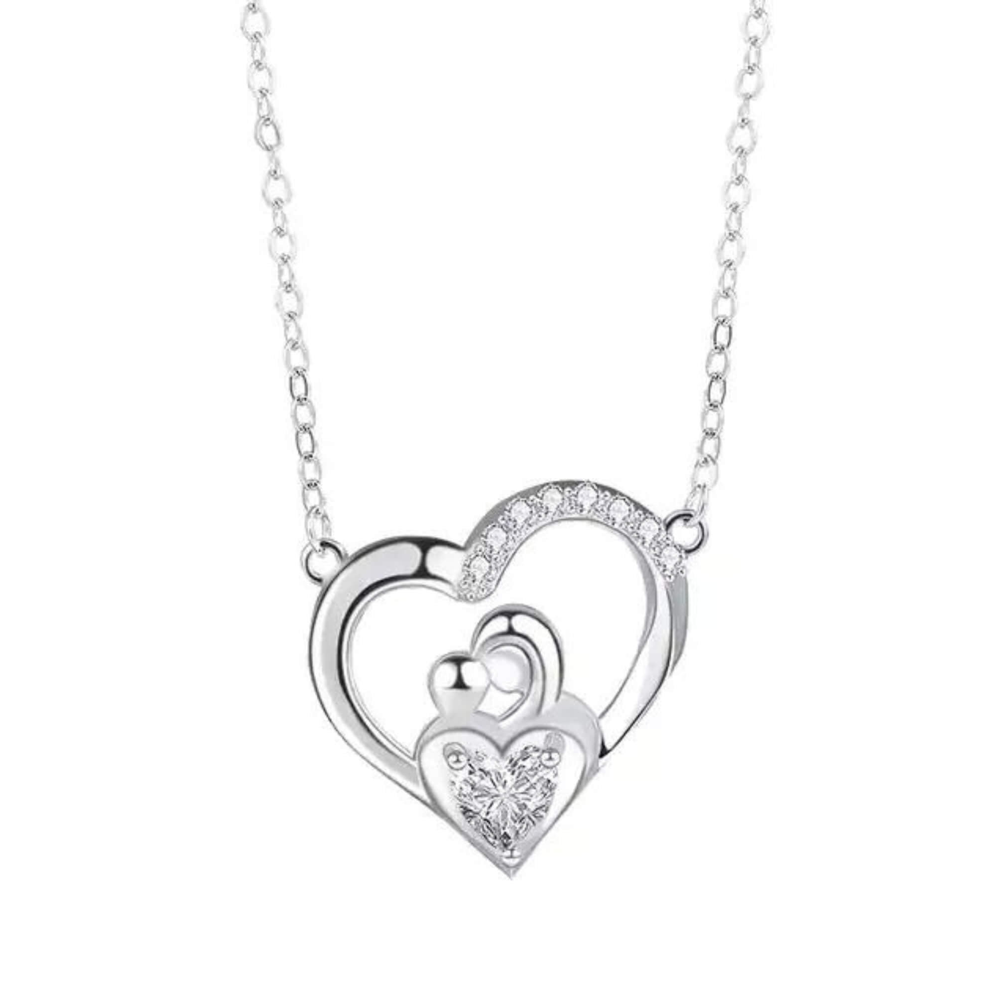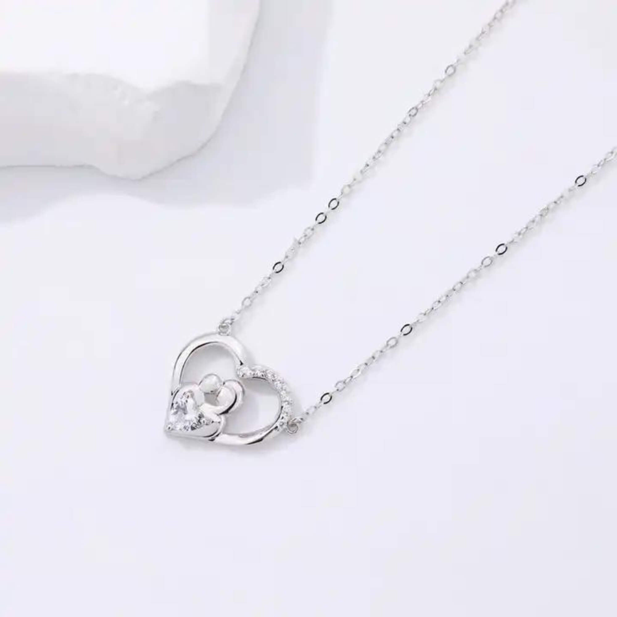 Sterling silver necklace with a double-heart pendant symbolizing the bond between a mother and child. One heart is adorned with small cubic zirconia stones, while the other holds a larger heart-shaped stone at its center. A meaningful design that makes a thoughtful gift for mothers, grandmothers, or anyone you wish to honor for their love and care.