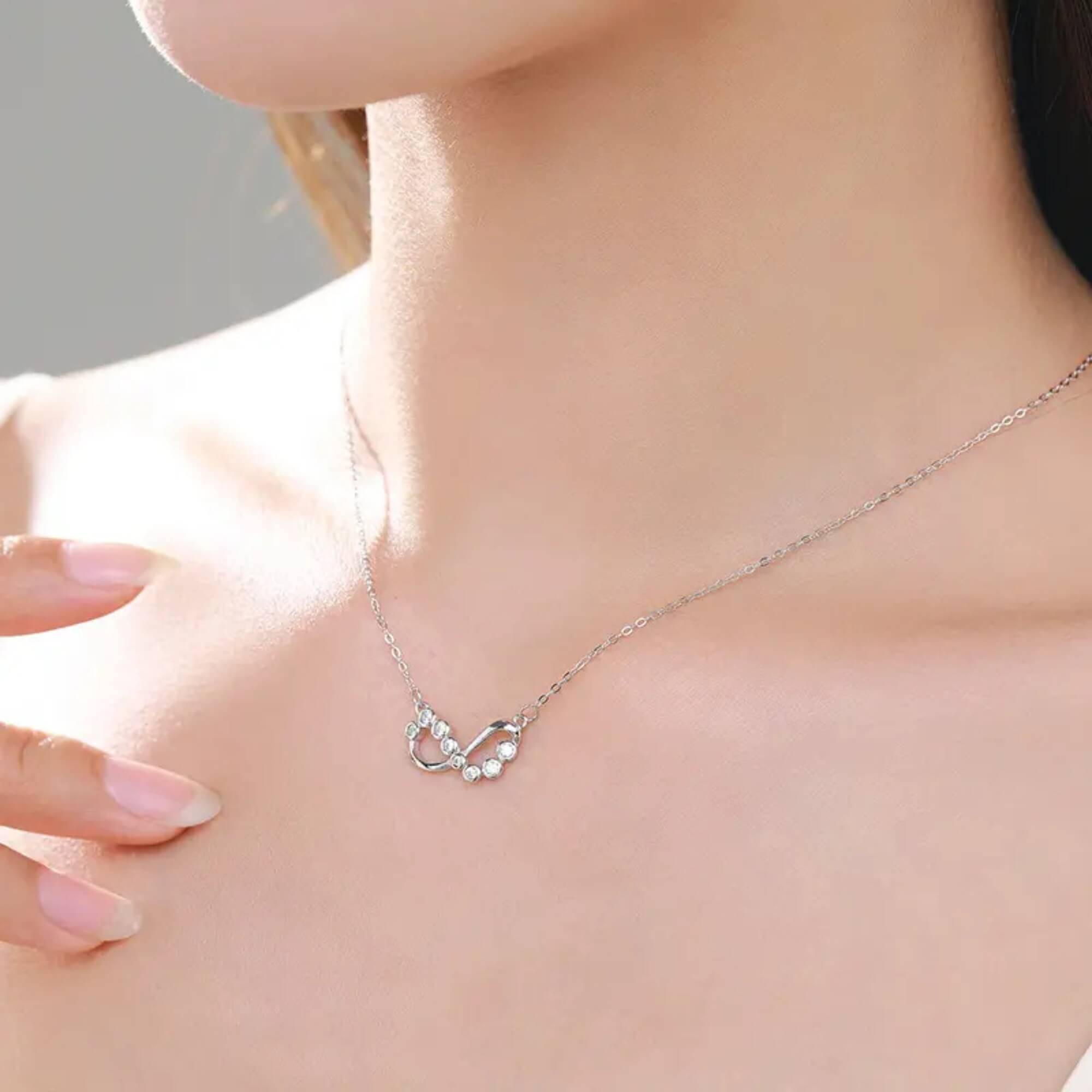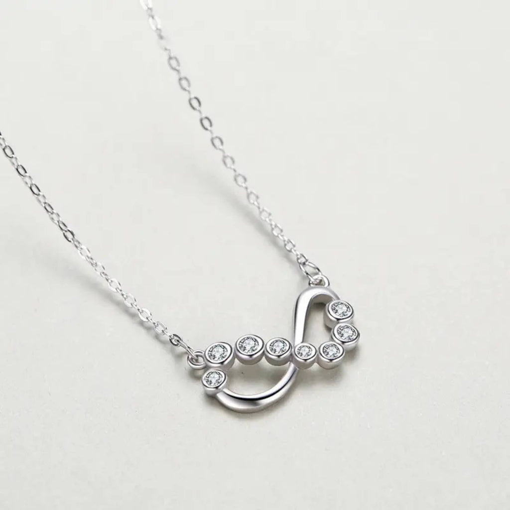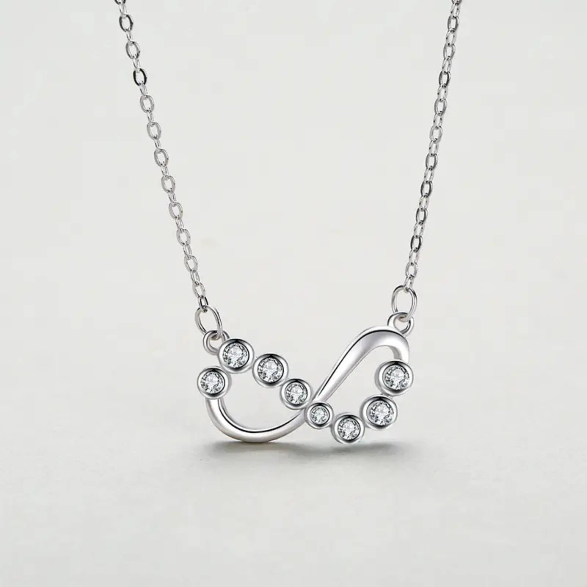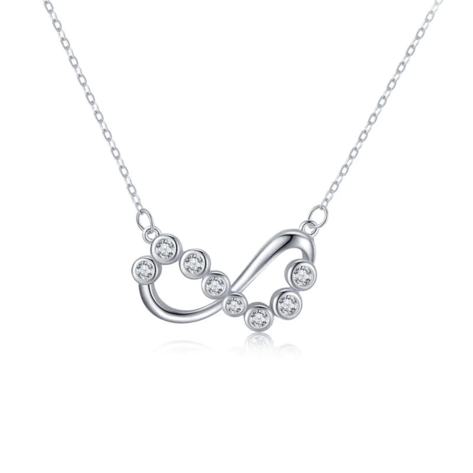 Sterling silver necklace reimagining the infinity symbol with a fresh, contemporary shape. Eight cubic zirconia stones are set along one side, bringing subtle sparkle and a touch of asymmetry to the design. A meaningful piece that blends symbolism with modern style.