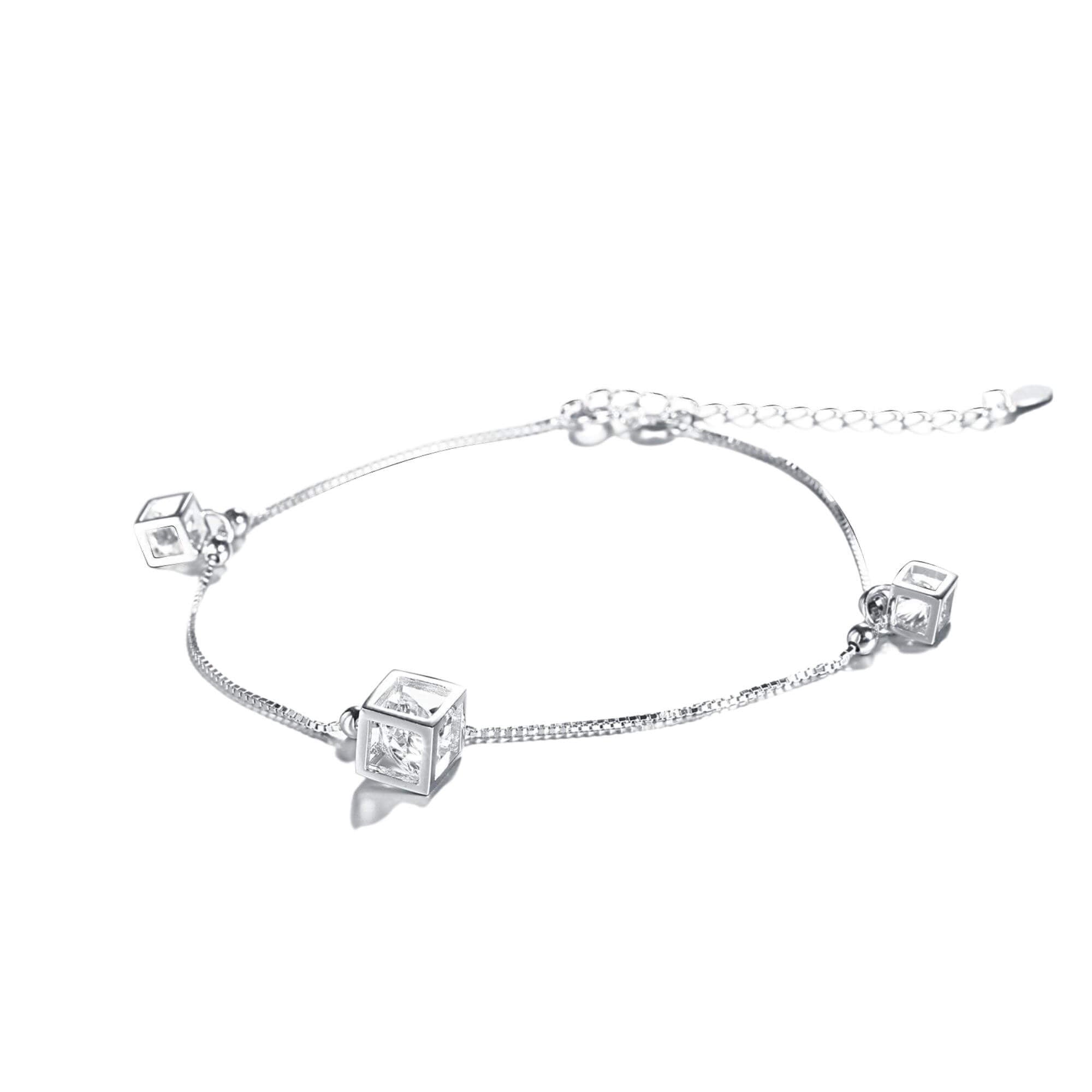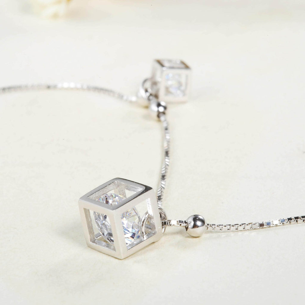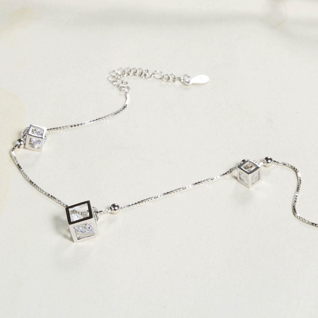 This eye-catching anklet features three cube-shaped charms set with cubic zirconia. The slightly larger middle cube draws subtle attention, while the light plays across the stones with every step. It is a modern design with just the right amount of sparkle.