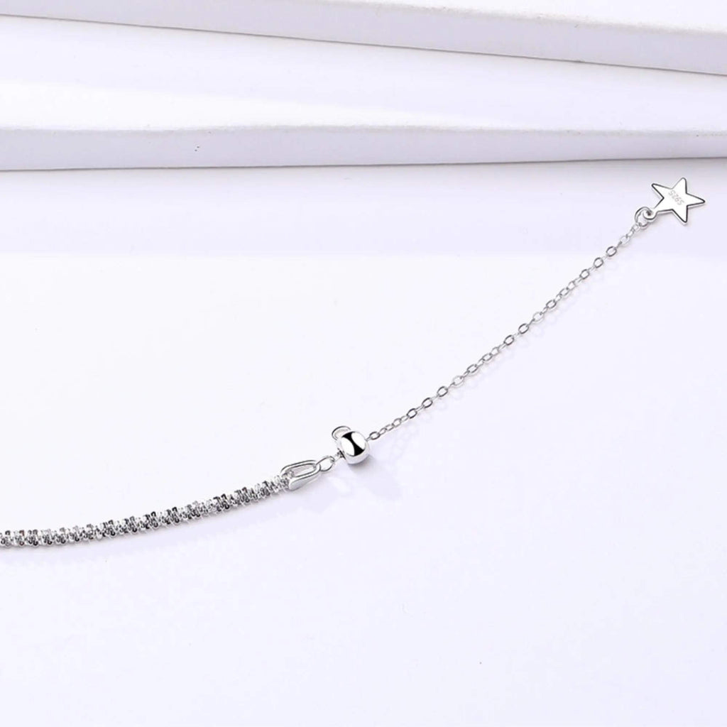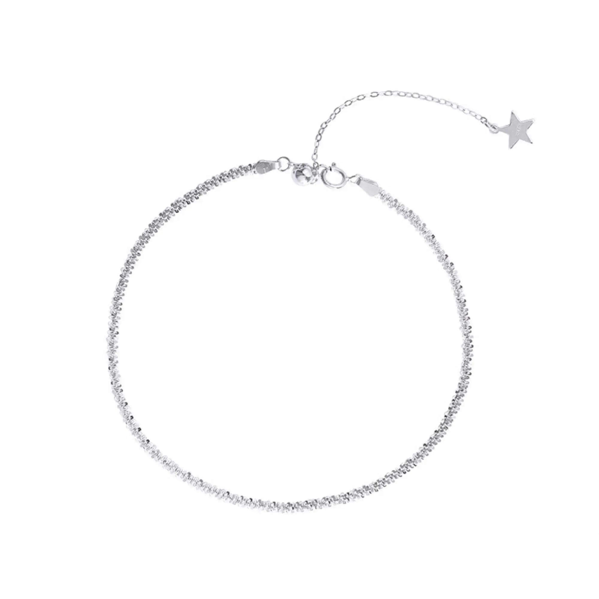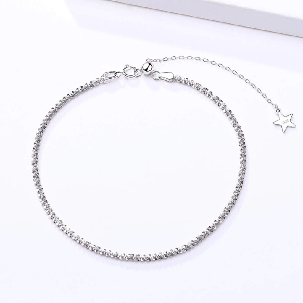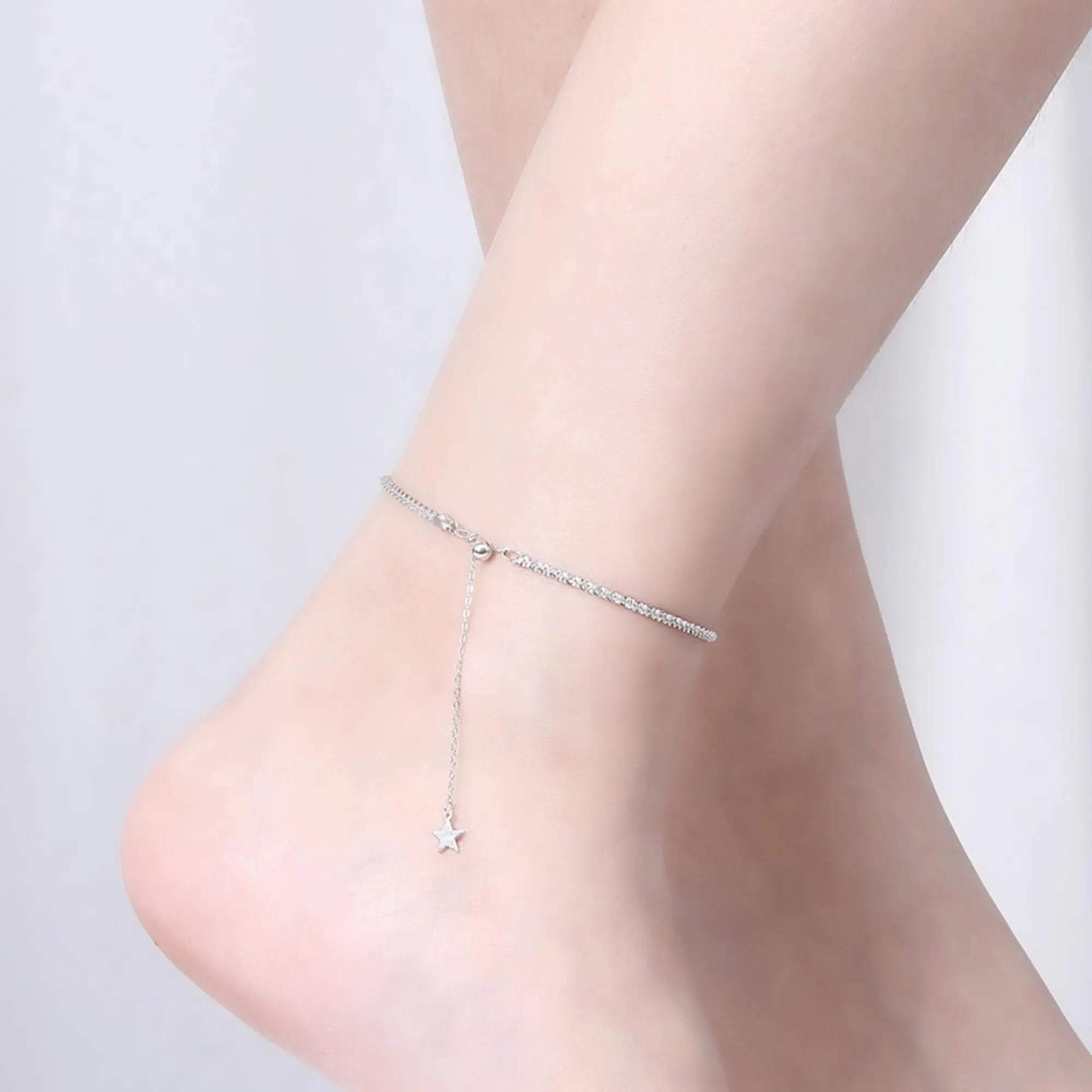 This silver anklet blends celestial inspiration with modern style. Featuring an intricate braided chain and a single star-shaped pendant, it brings a touch of magic to your look. The adjustable fit ensures comfort, making it a dreamy choice for stargazers and style lovers alike.