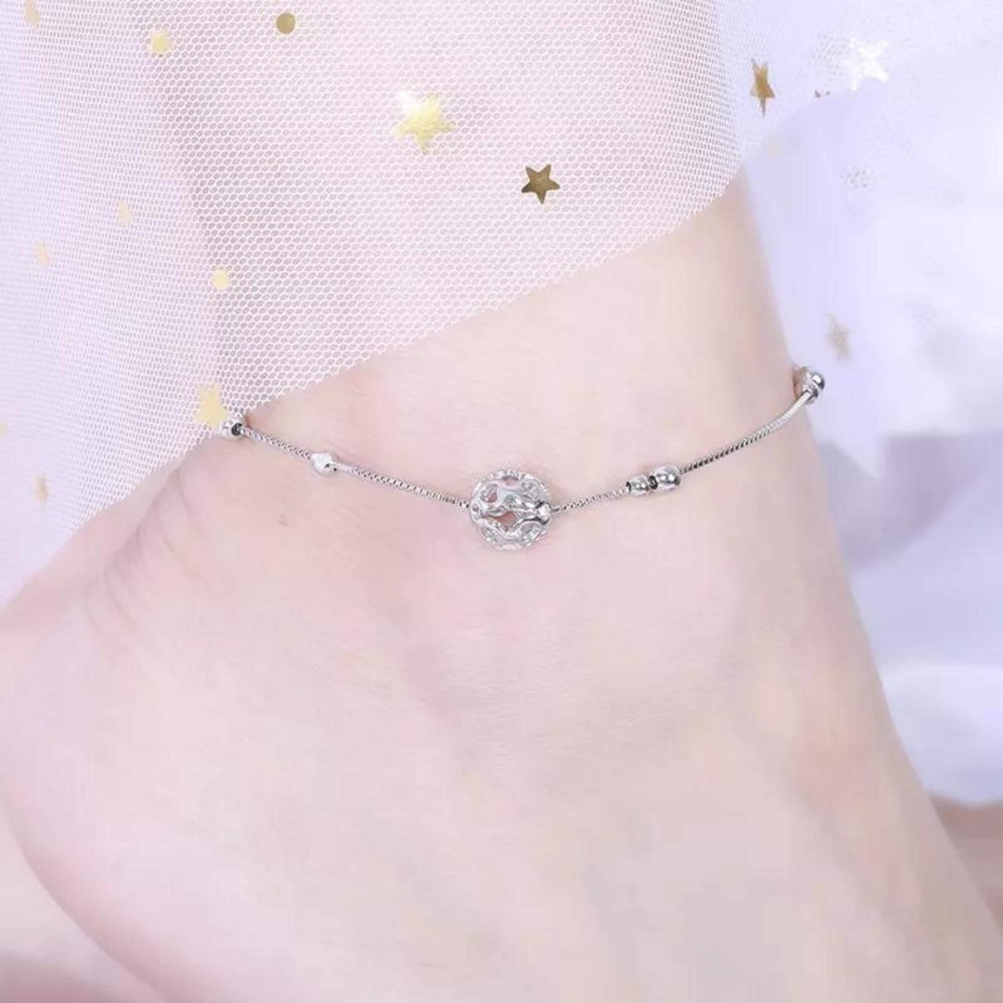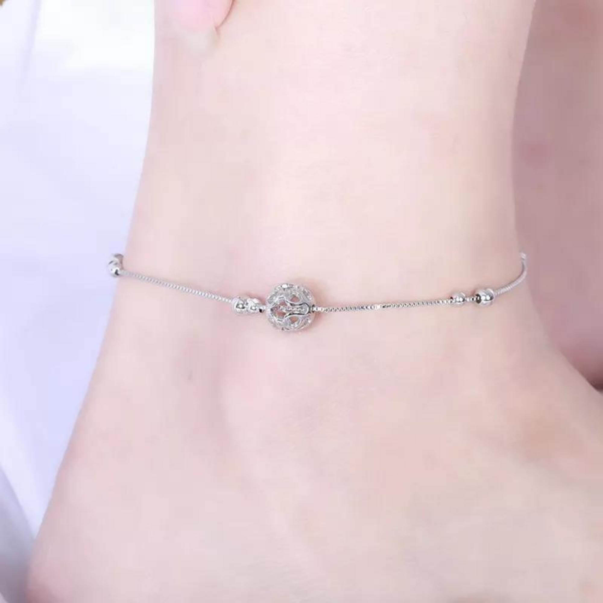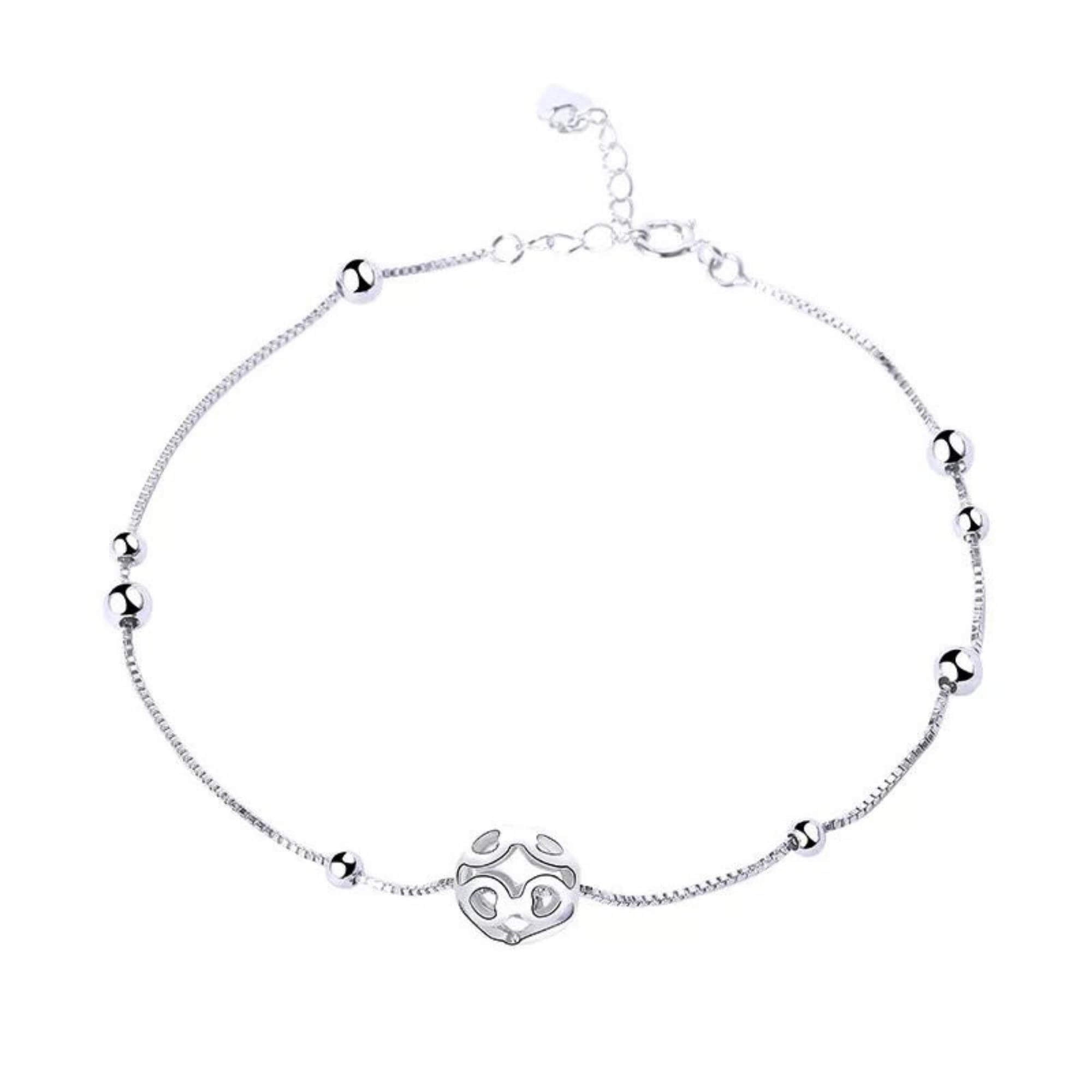 This silver anklet features a round charm with tiny heart-shaped cutouts, framed by eight evenly spaced beads. The design speaks to balance, love, and graceful style – a meaningful piece that feels thoughtful and refined without trying too hard.