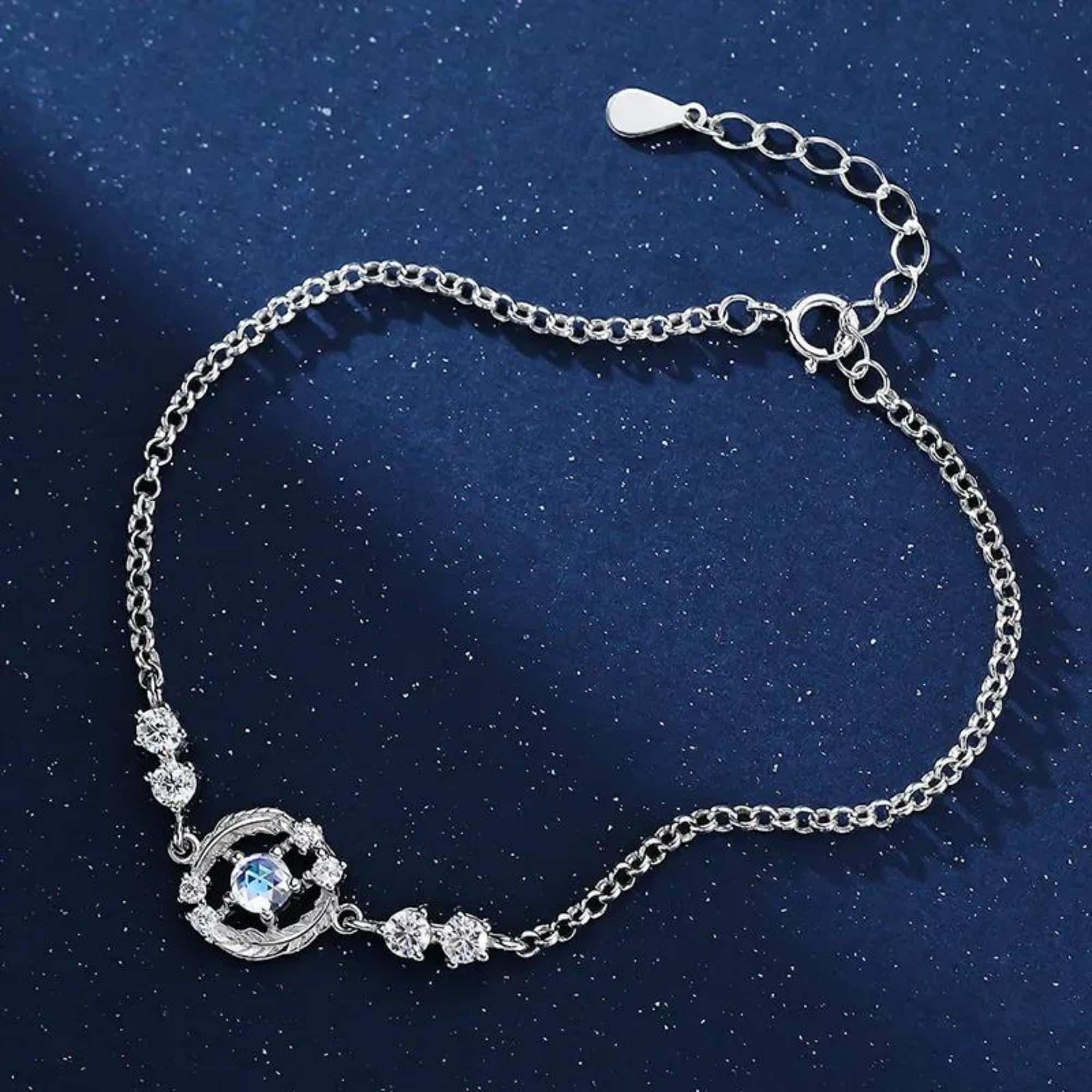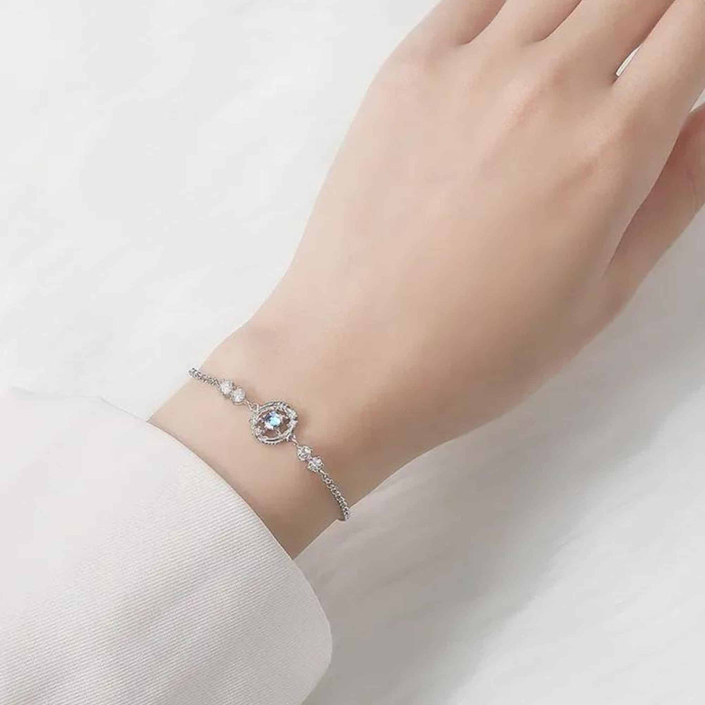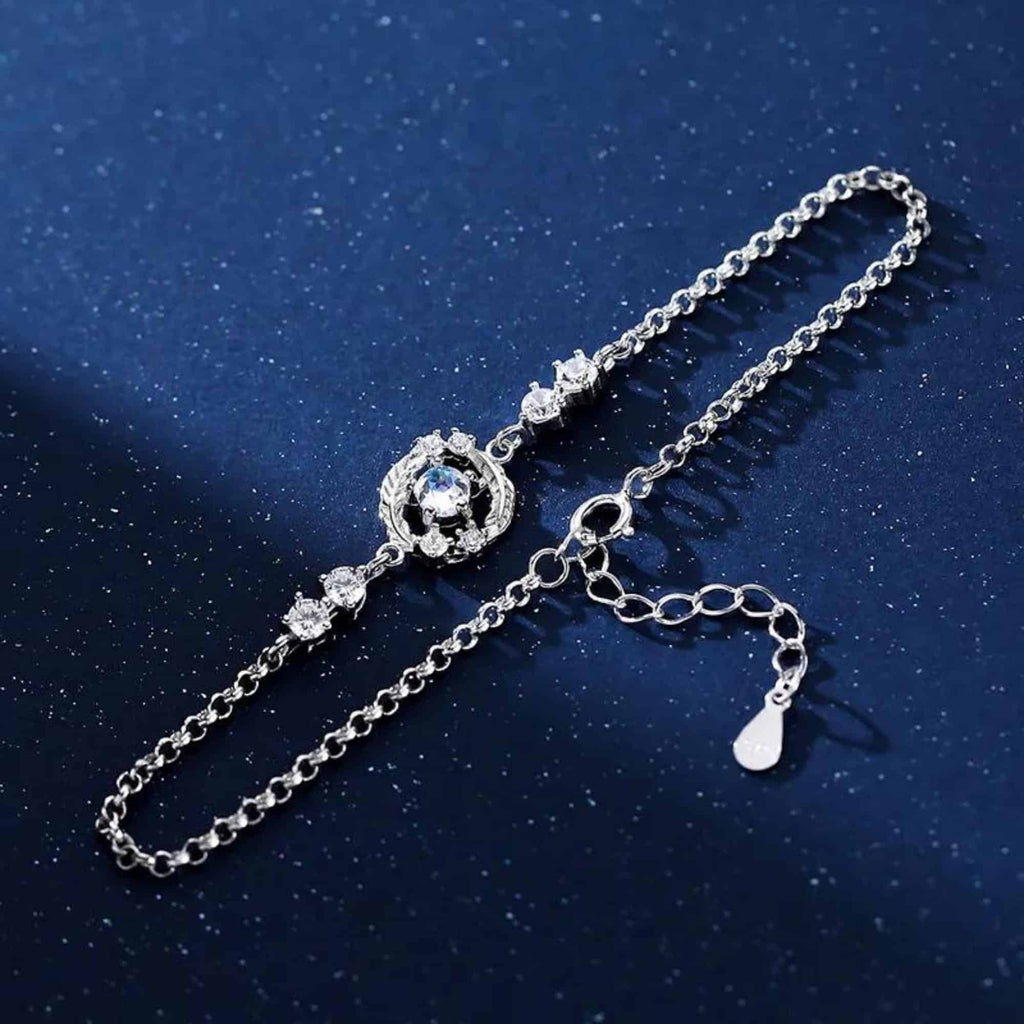 Sterling silver bracelet featuring a fine chain and a centerpiece with a crystal set inside a circular frame. A delicate piece with a clear focal point, perfect for anyone drawn to unique details and thoughtful design.