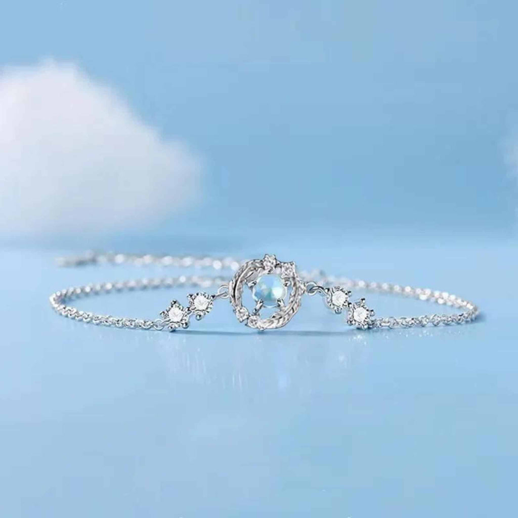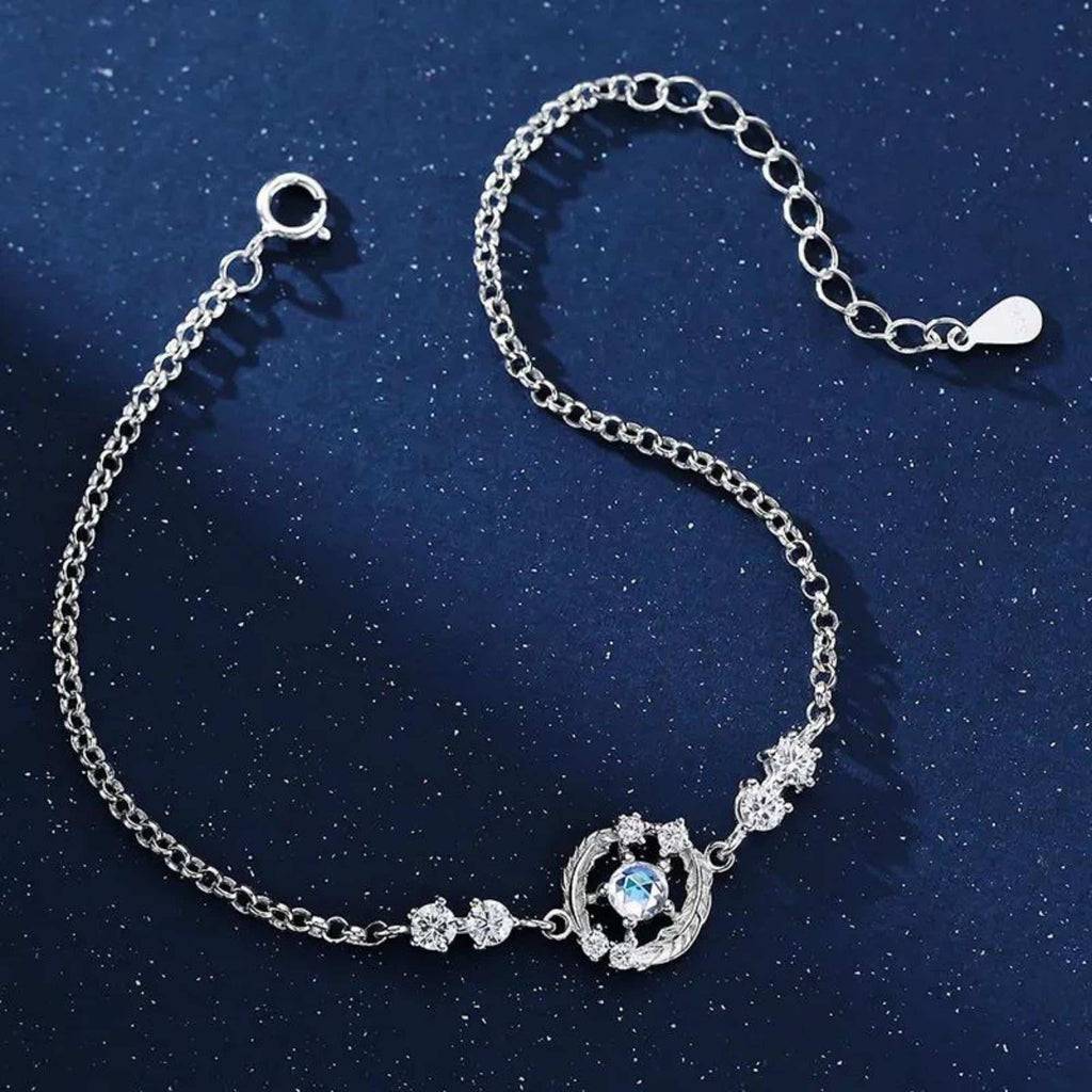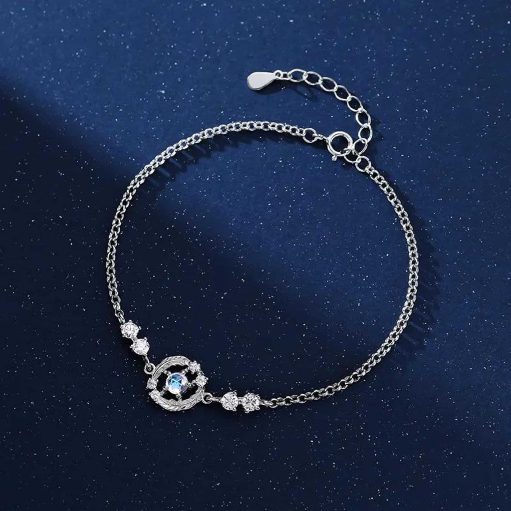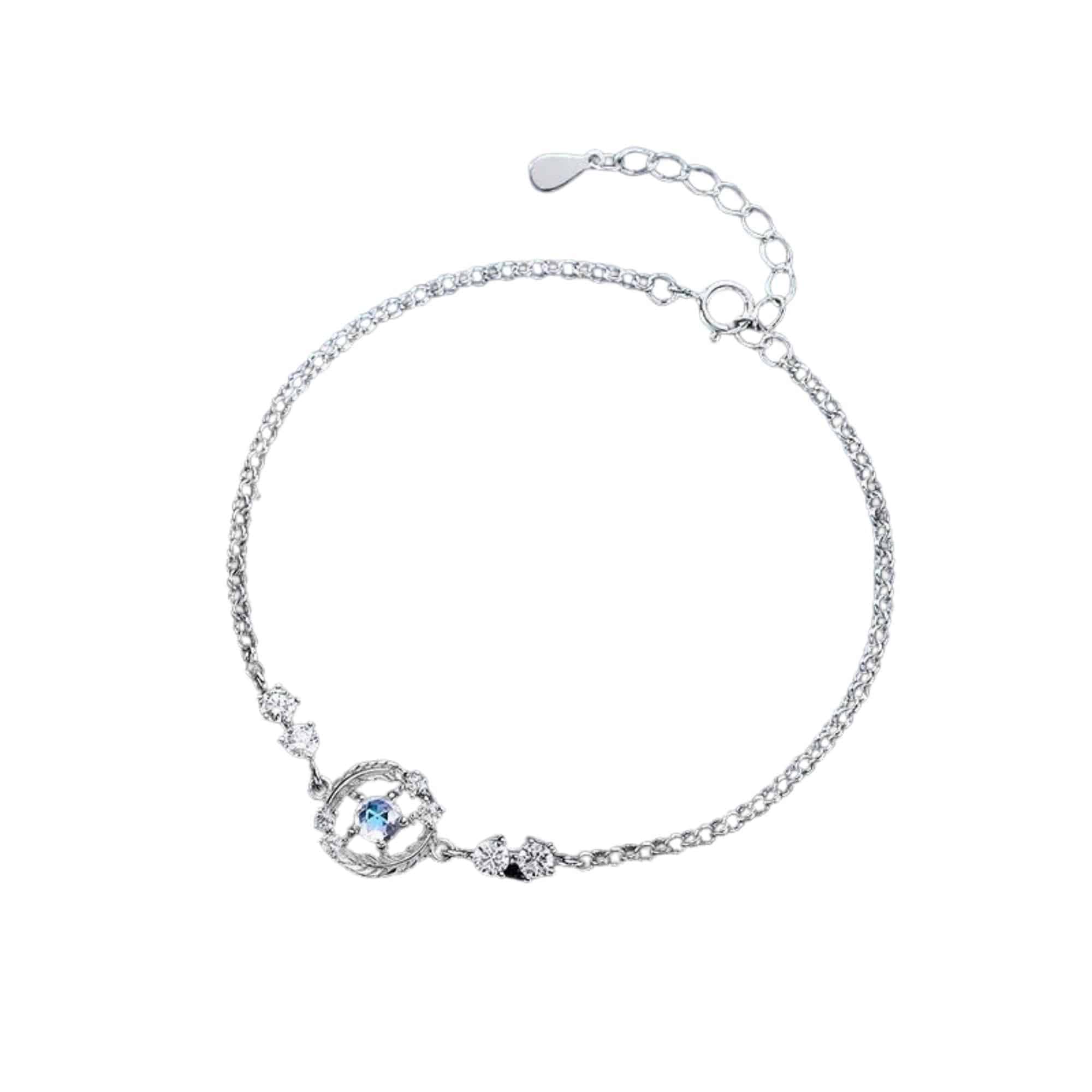 Sterling silver bracelet featuring a fine chain and a centerpiece with a crystal set inside a circular frame. A delicate piece with a clear focal point, perfect for anyone drawn to unique details and thoughtful design.