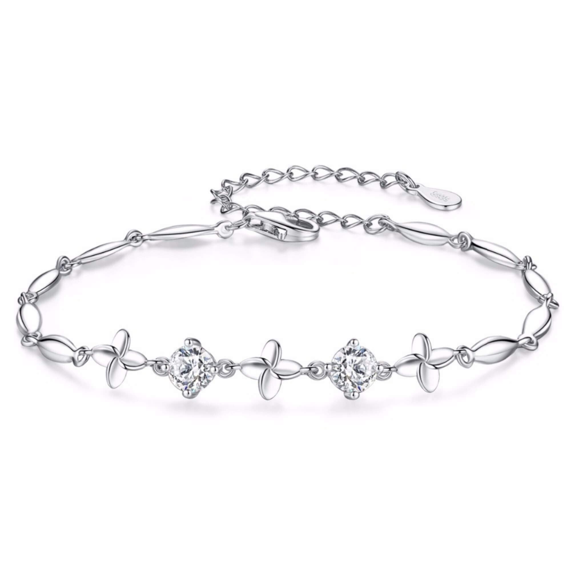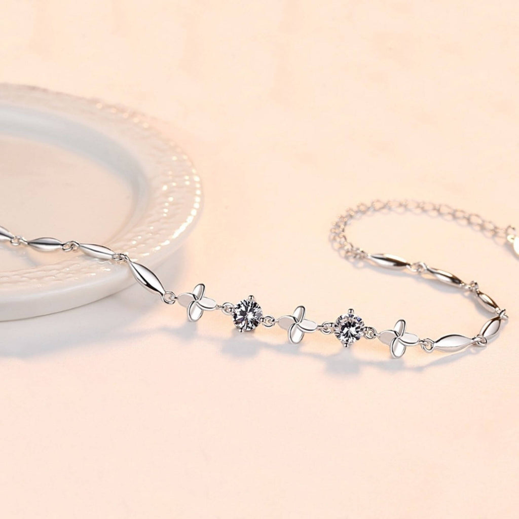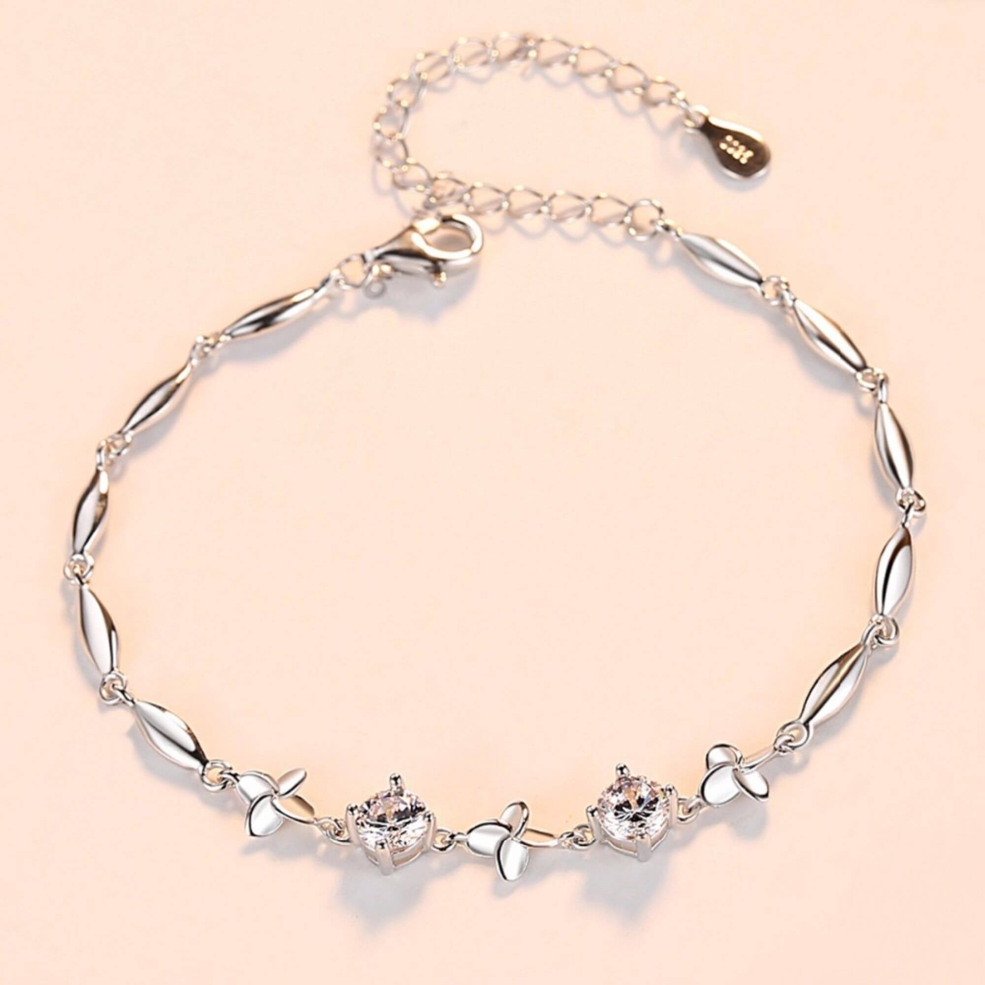 Sterling silver bracelet that features three delicate floral shapes, each set with a cubic zirconia stone for a soft touch of sparkle. The design feels easy and natural, offering a quiet detail that works across a range of personal styles.