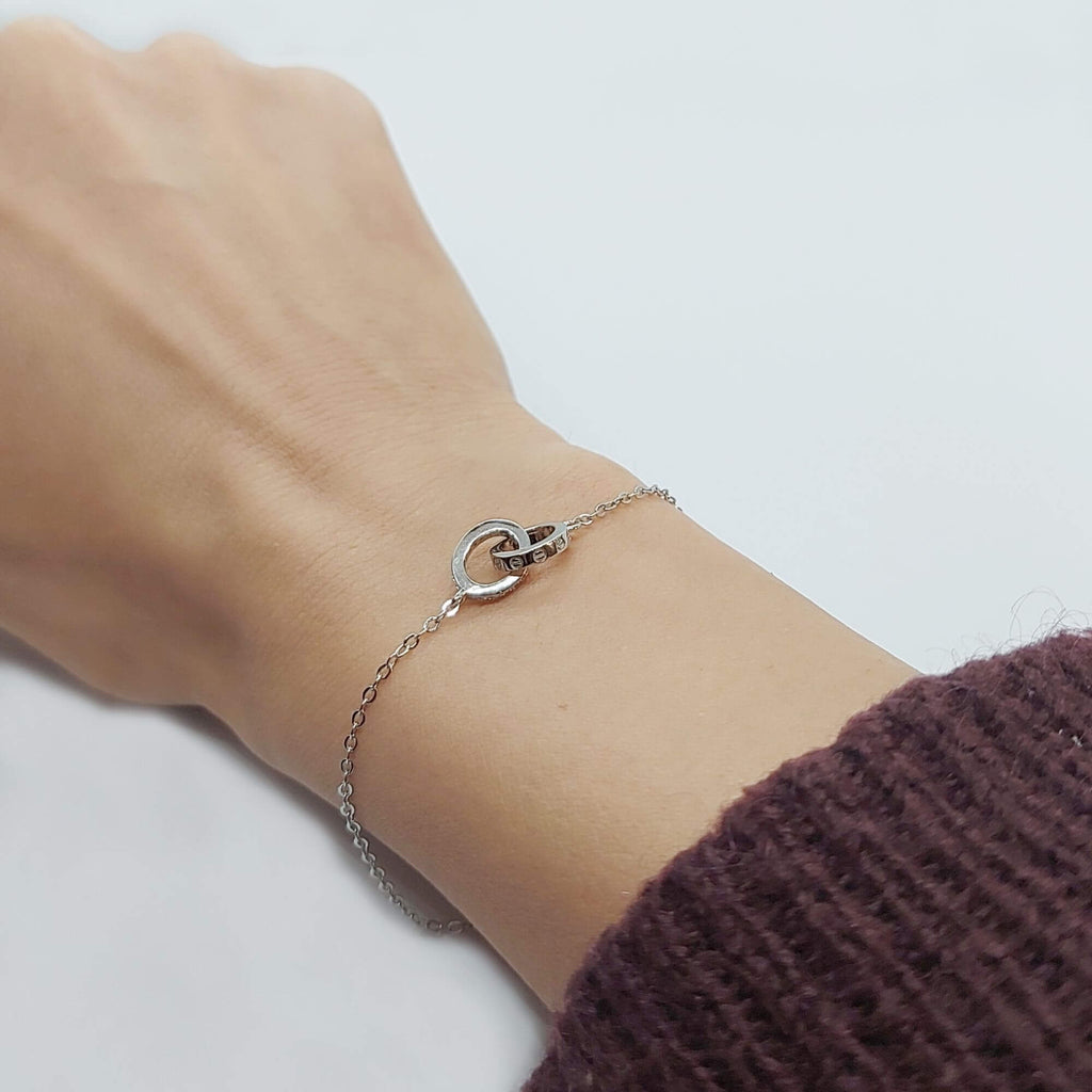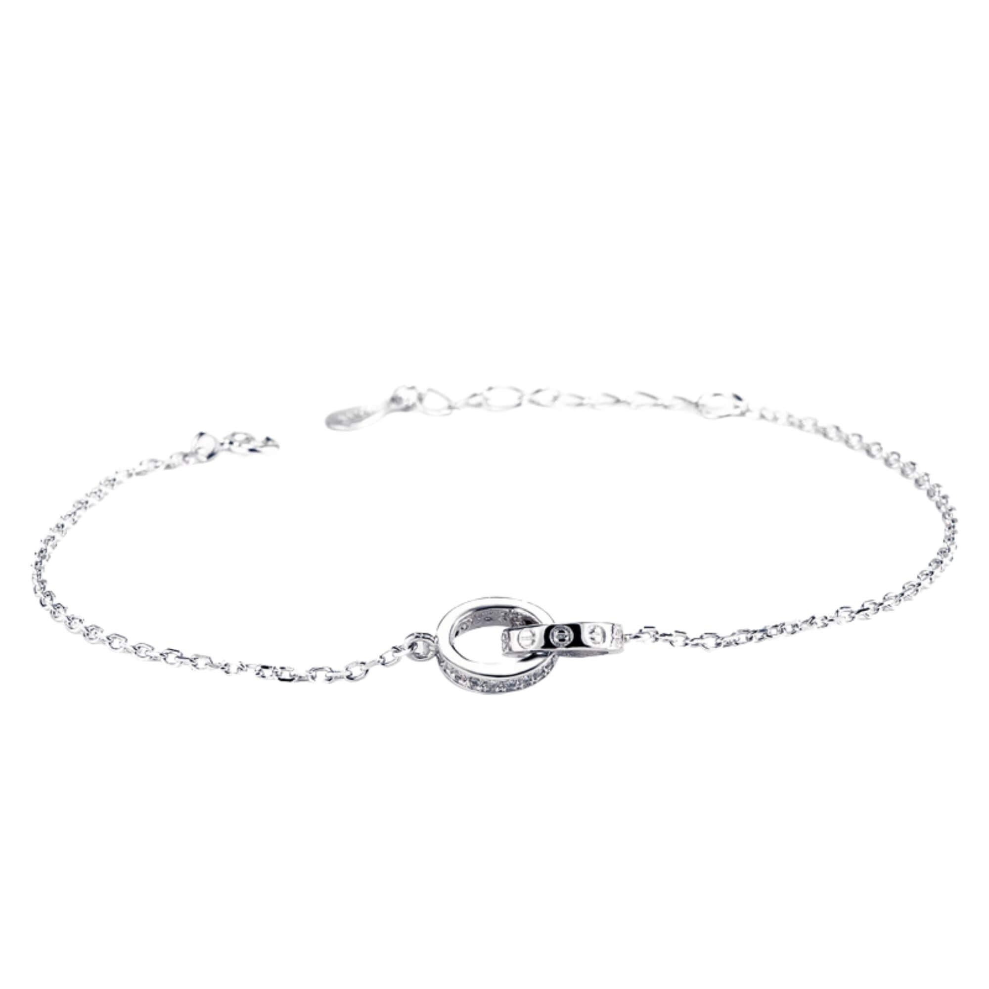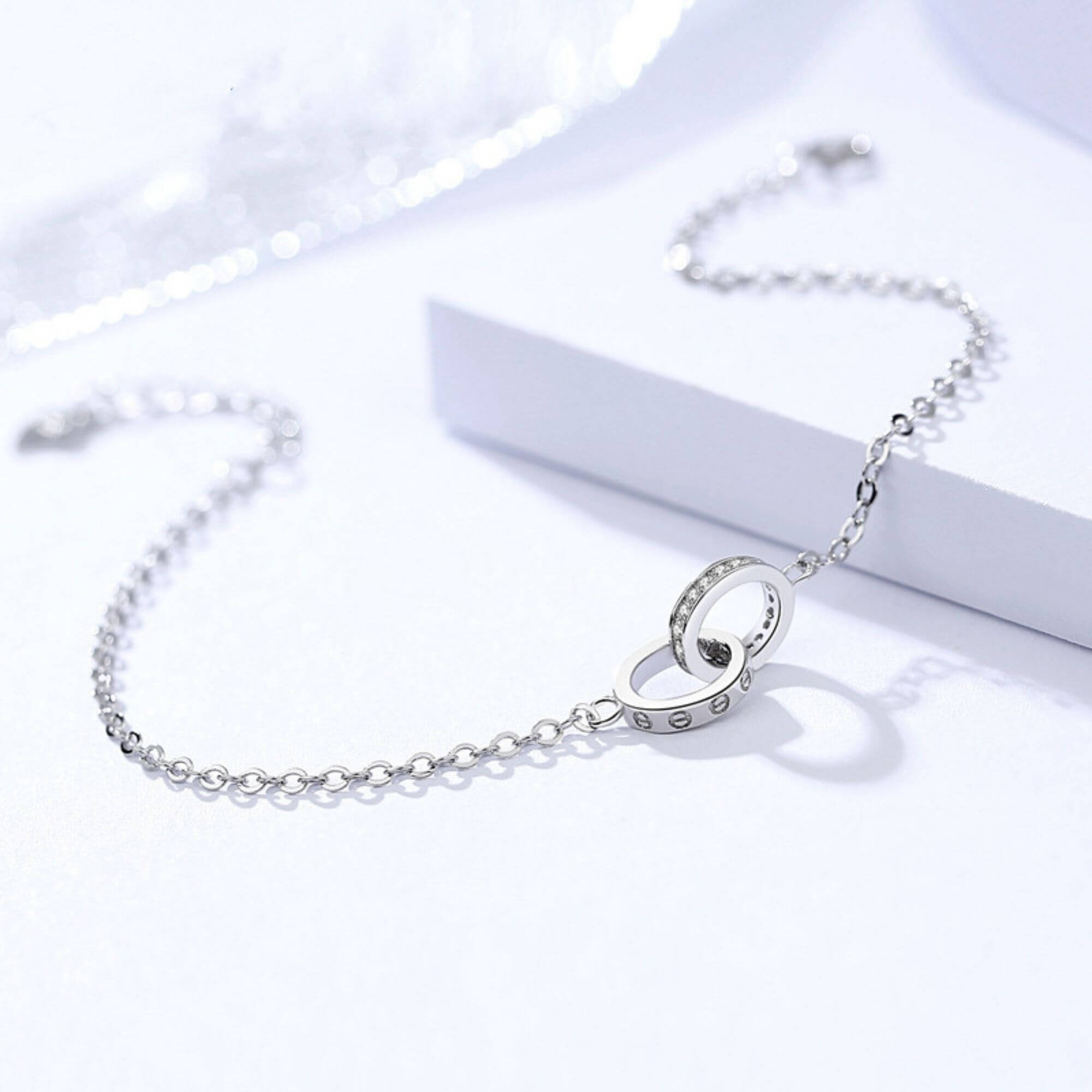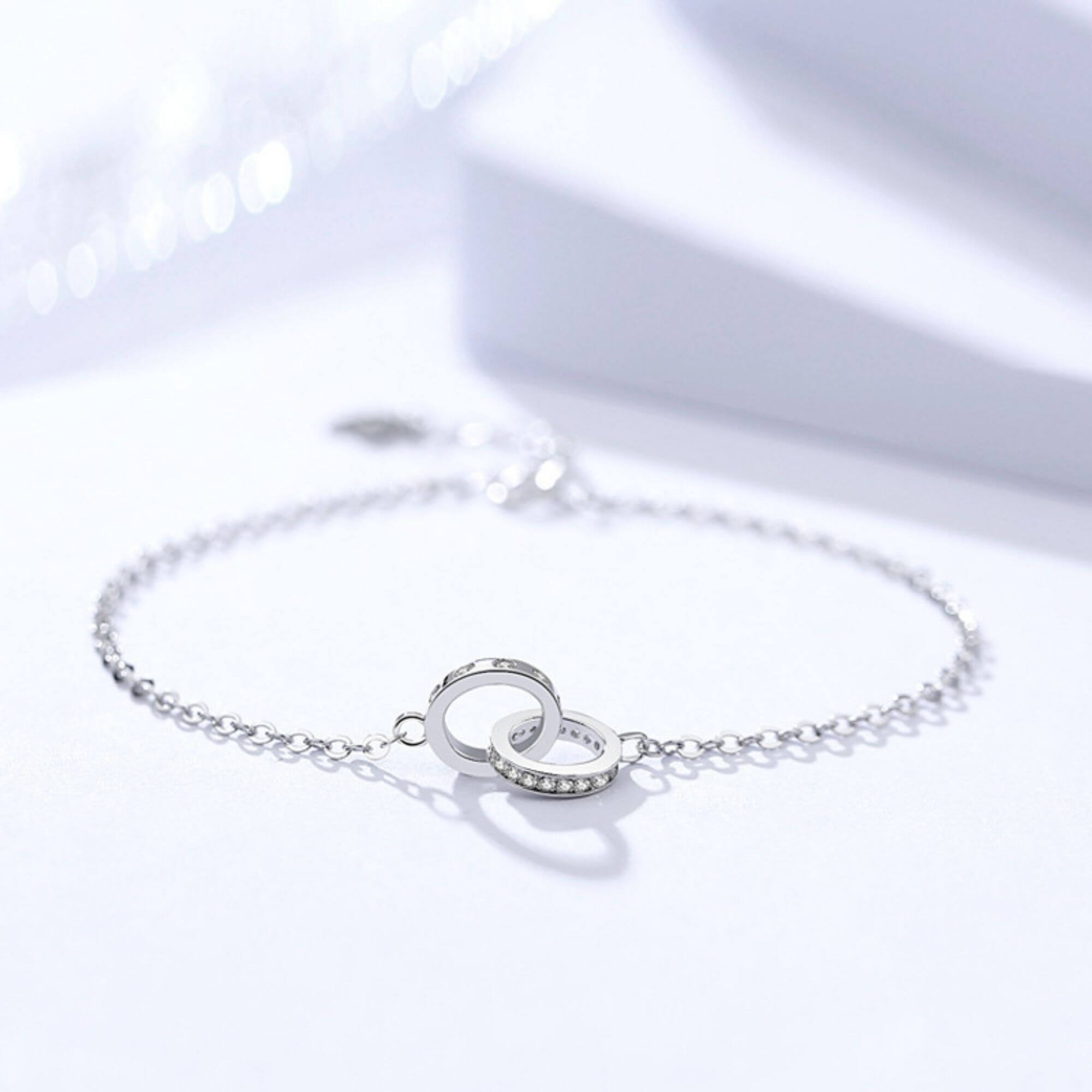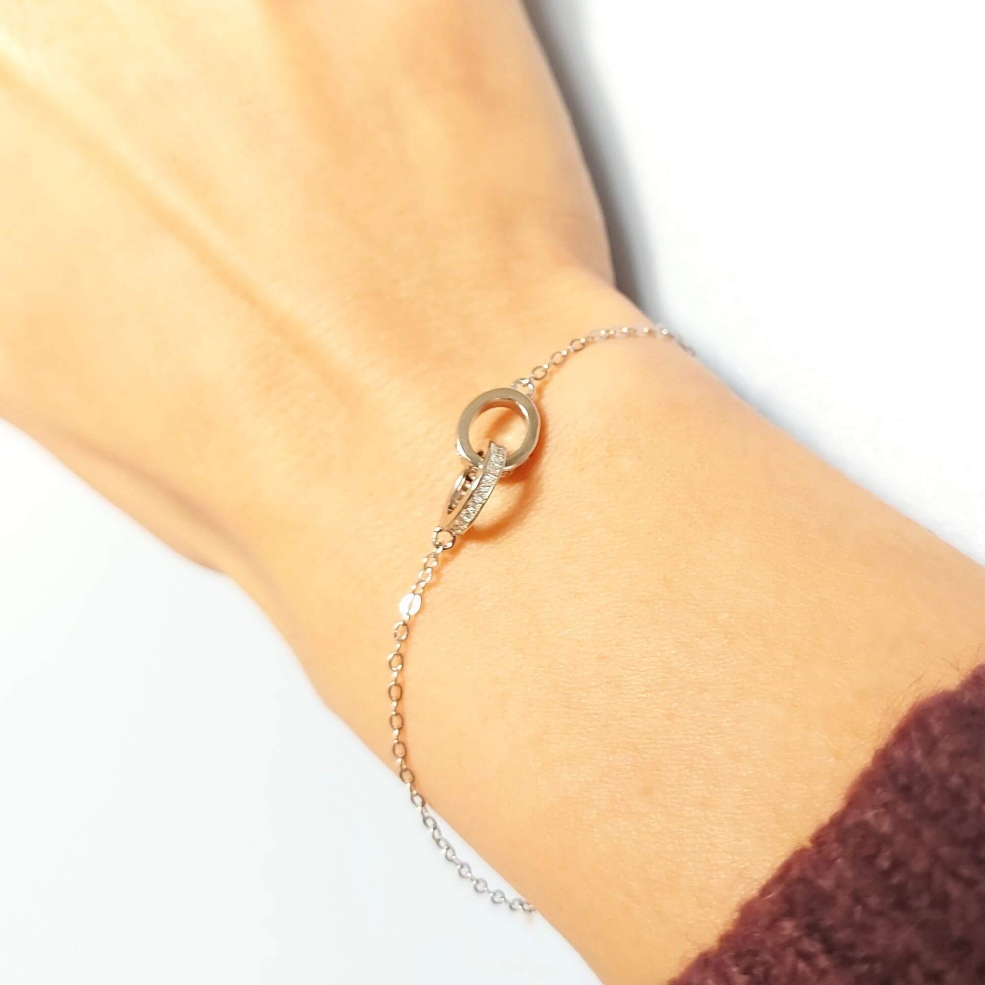 Sterling silver bracelet that features two smooth spheres joined at the center, accented with cubic zirconia stones for a gentle hint of shine. The linked design reflects harmony and closeness, offering a quiet nod to the strength of lasting connections. Thoughtful and understated, it carries both style and meaning.