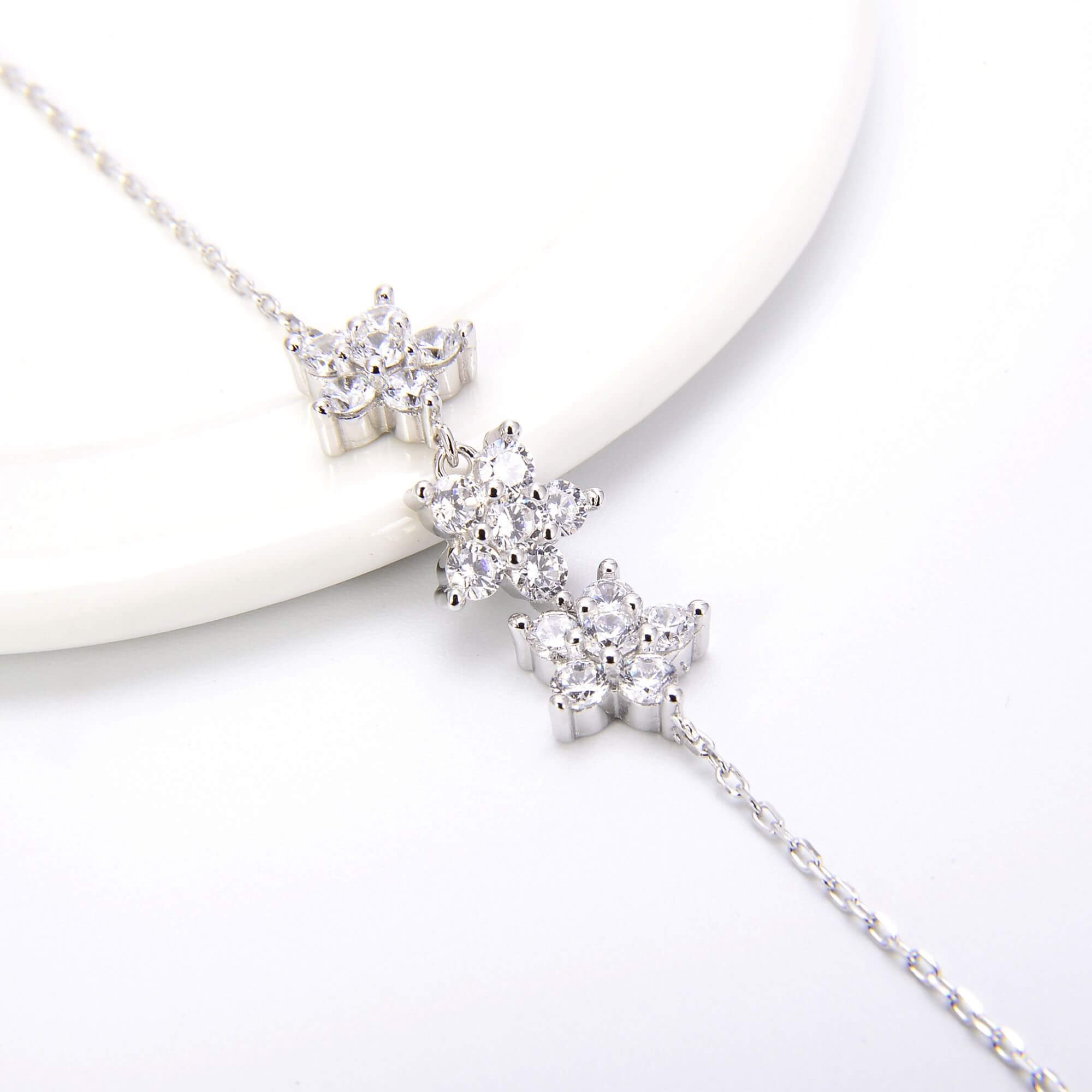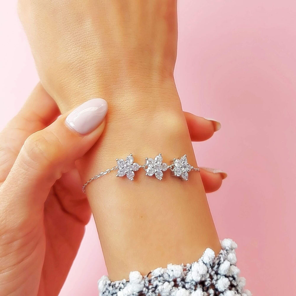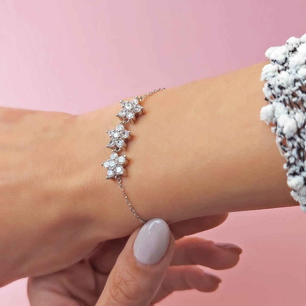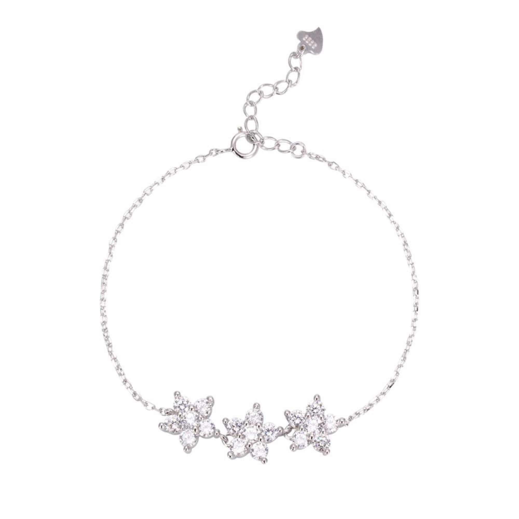Sterling silver bracelet that highlights three delicately shaped floral motifs. The soft curves and gentle shimmer of the design bring a light, natural feel, inspired by the quiet beauty of blooming flowers. Balanced and feminine, it offers a fresh take on classic floral jewelry.