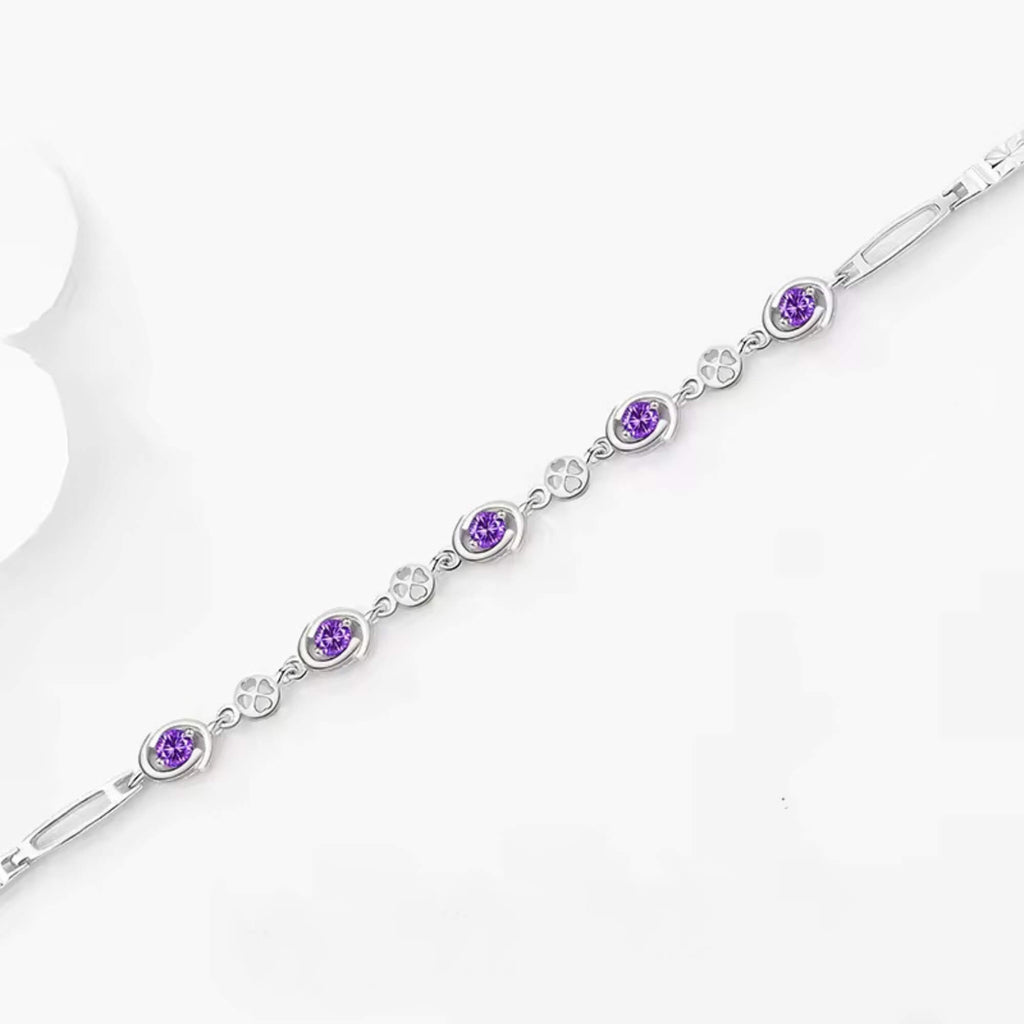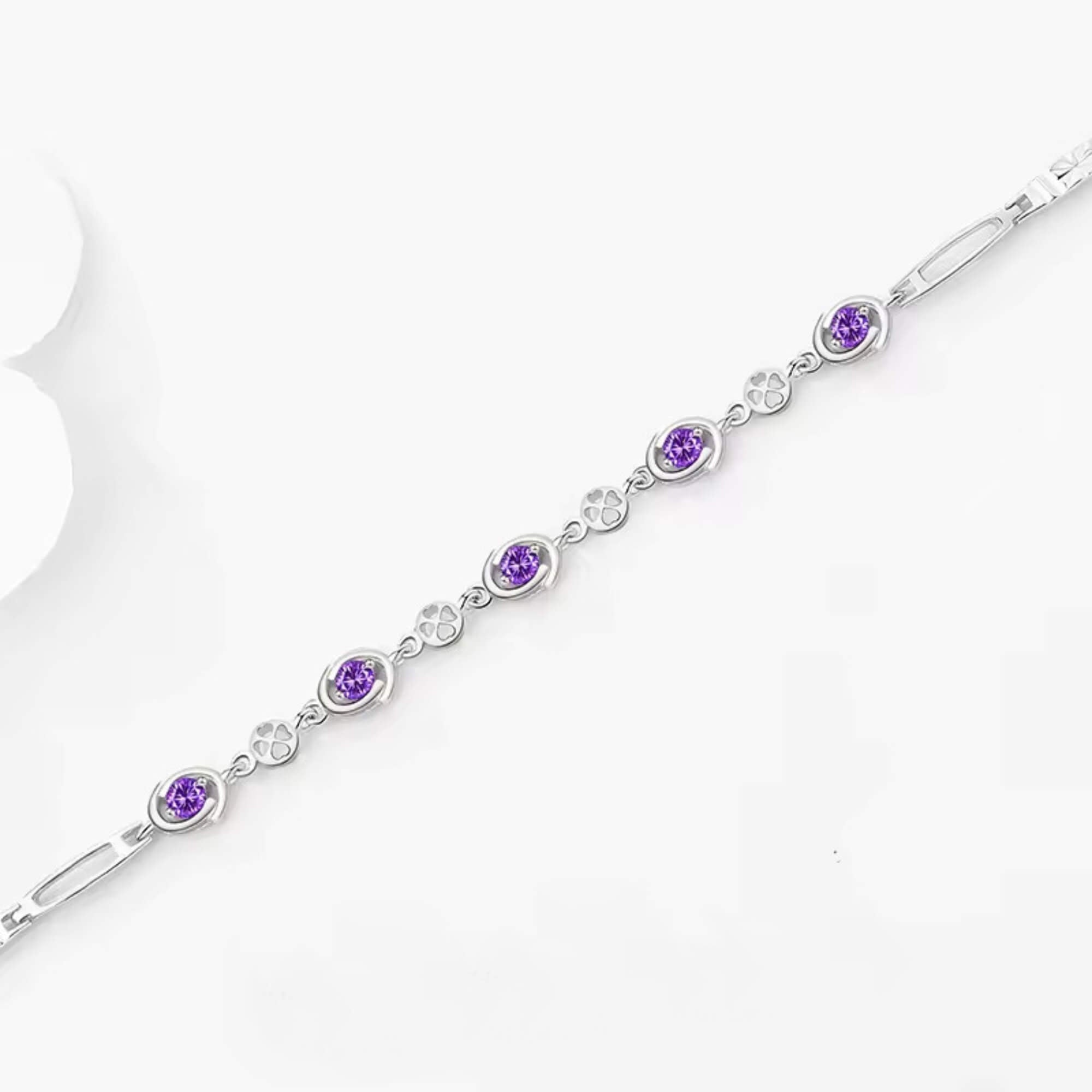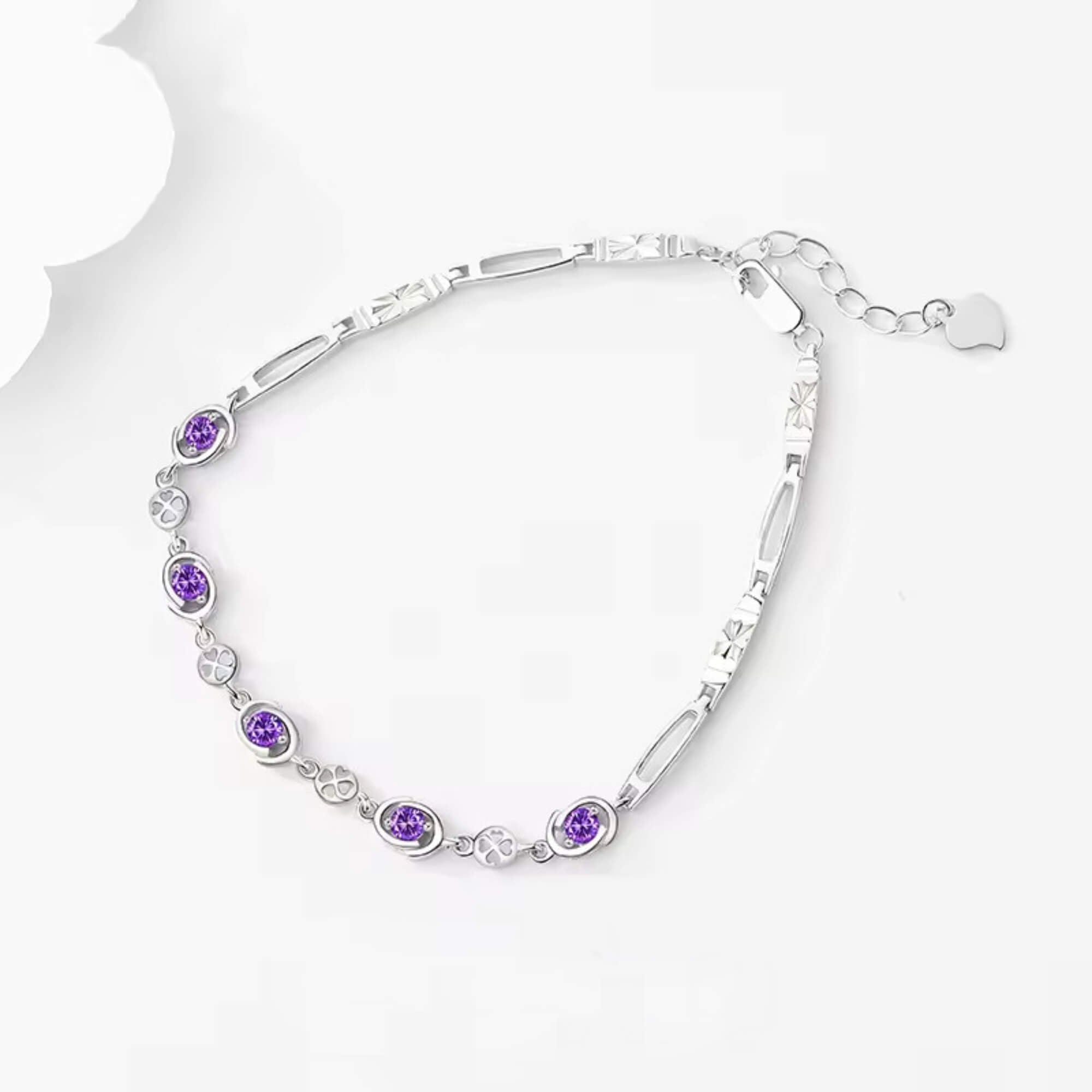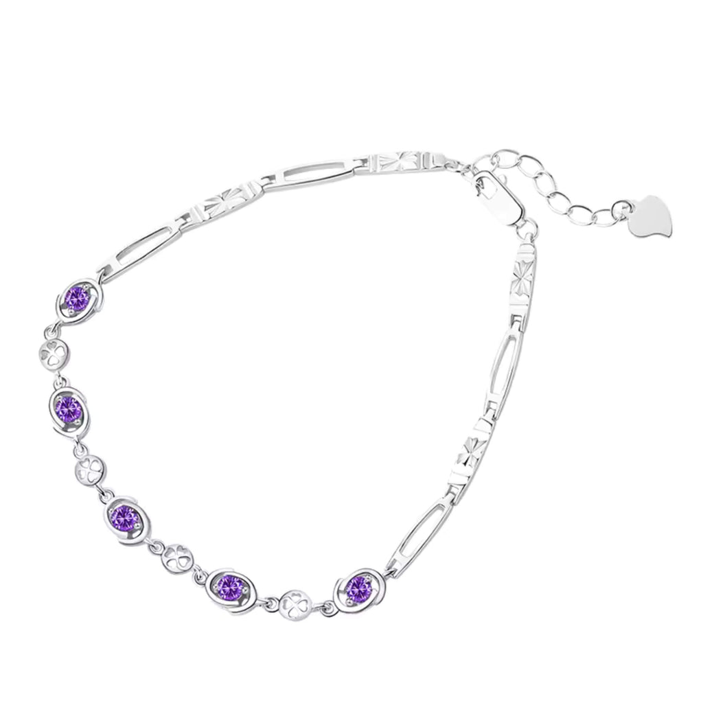 Sterling silver bracelet featuring solid links that alternate with cubic zirconia stones and rounded four-leaf clover motifs. Available in classic silver or with soft purple accents, it offers a versatile style with a hint of good luck.