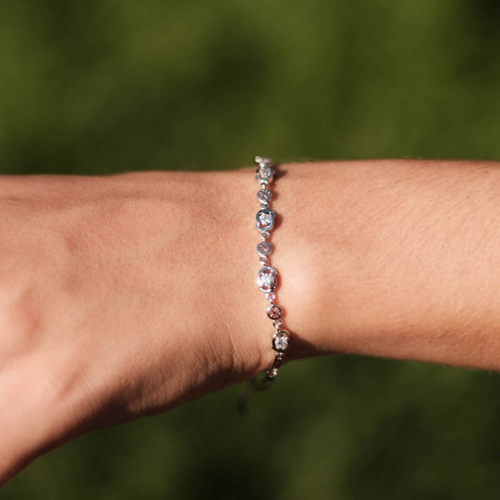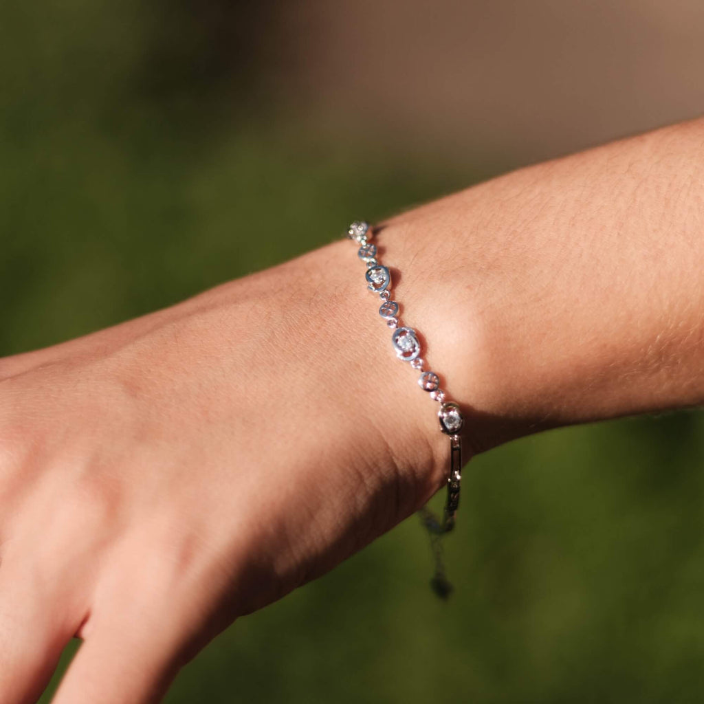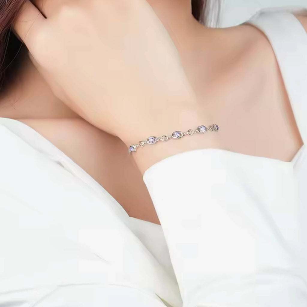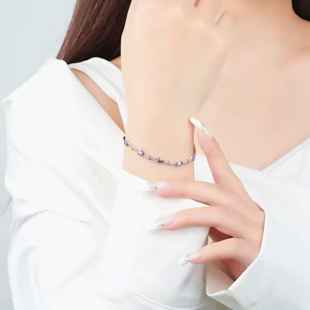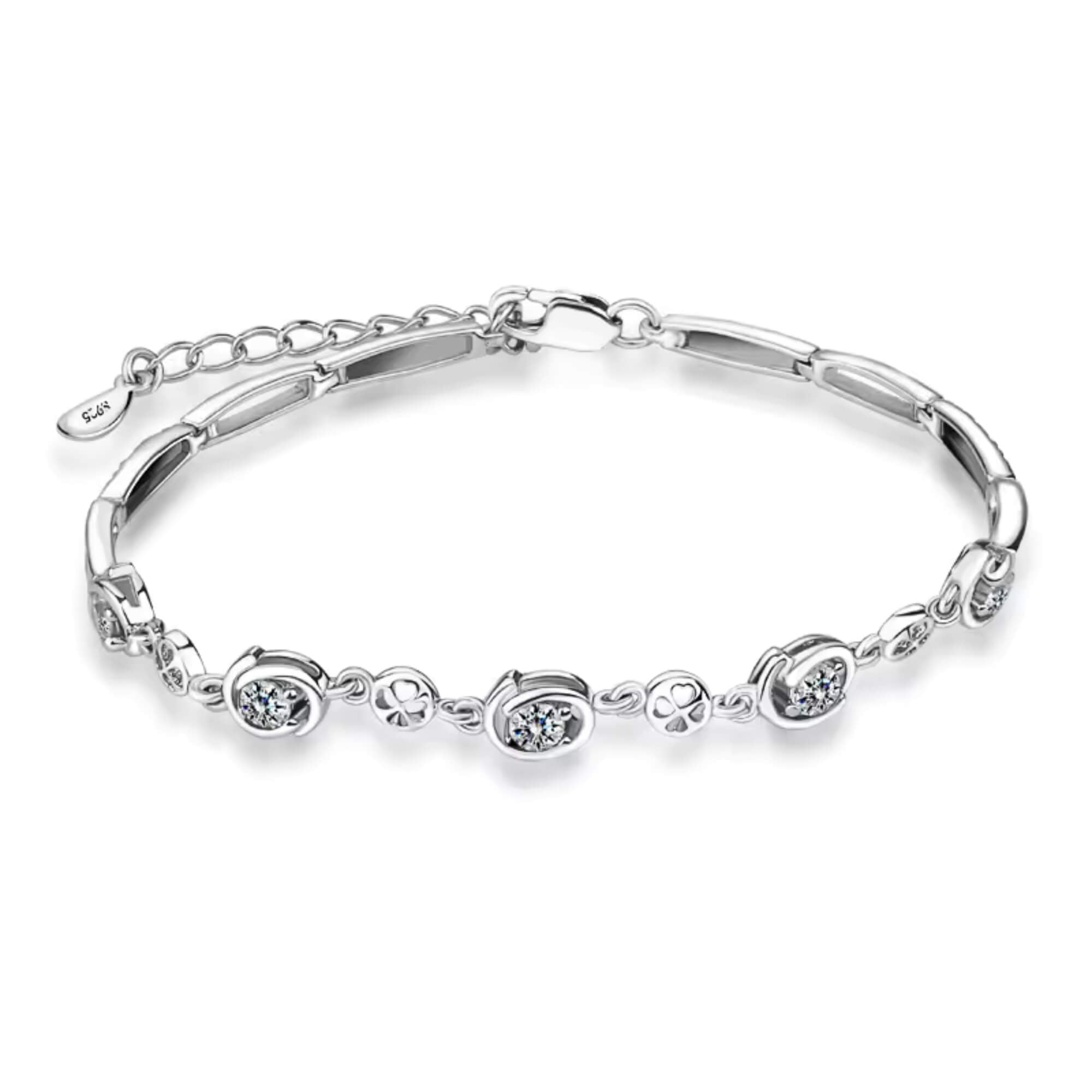 Sterling silver bracelet featuring solid links that alternate with cubic zirconia stones and rounded four-leaf clover motifs. Available in classic silver or with soft purple accents, it offers a versatile style with a hint of good luck.