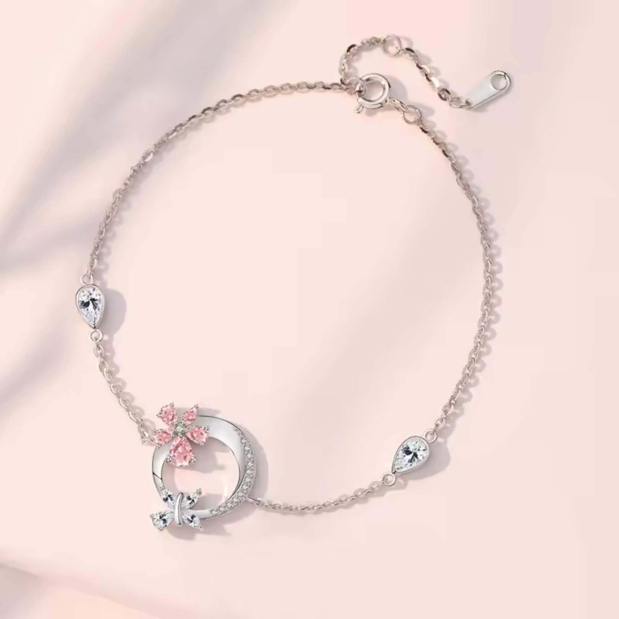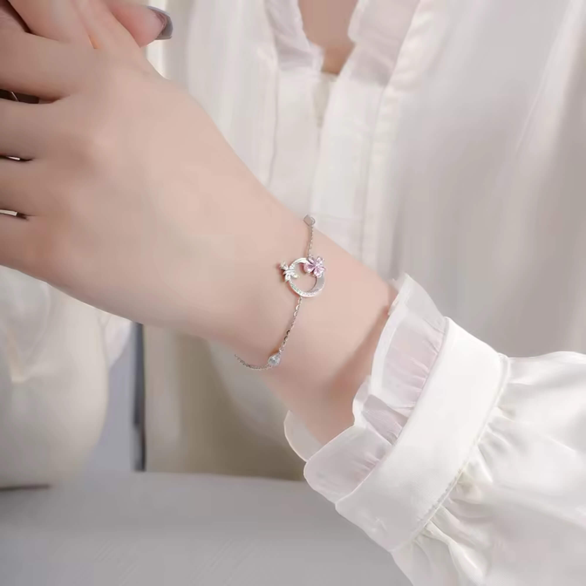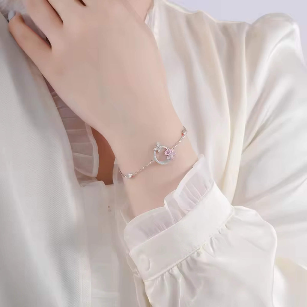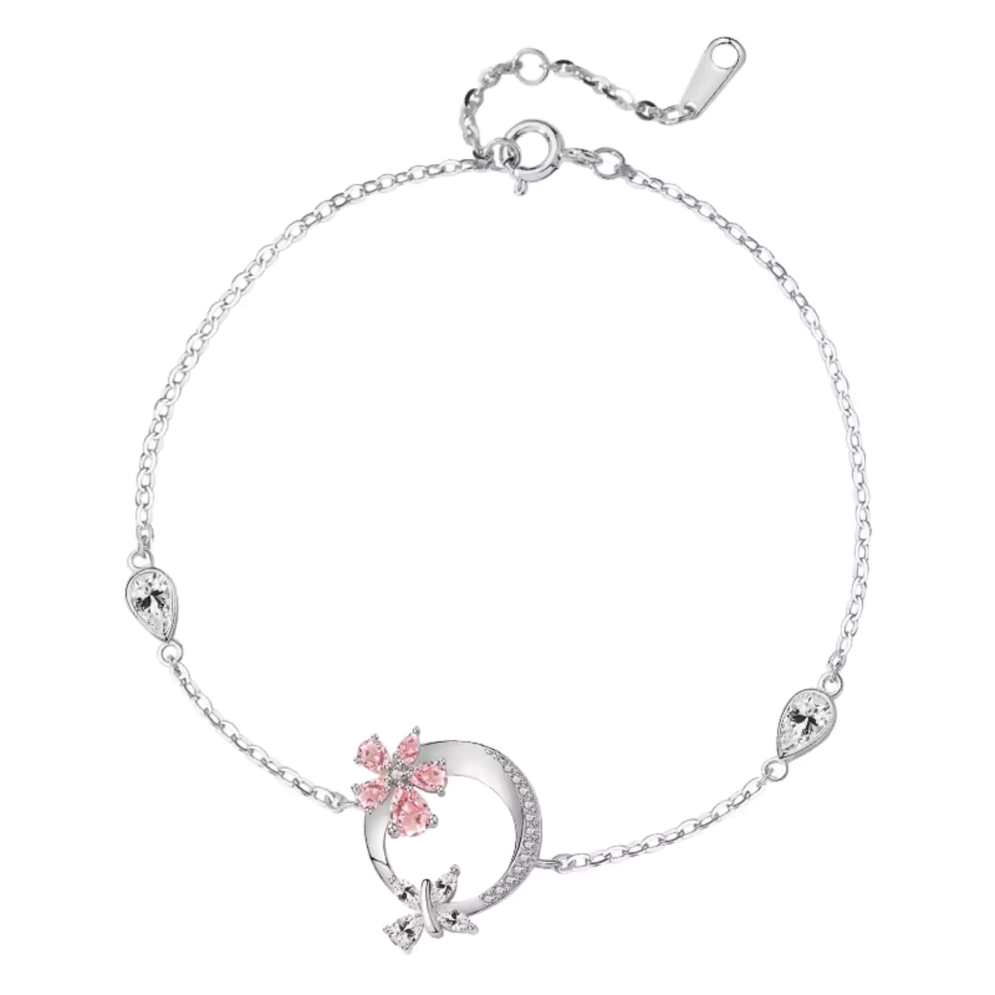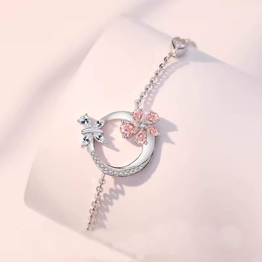 Sterling silver bracelet inspired by cherry blossoms, with a soft pink floral motif and sparkling details. The design captures the gentle beauty of spring, offering a light and poetic touch.