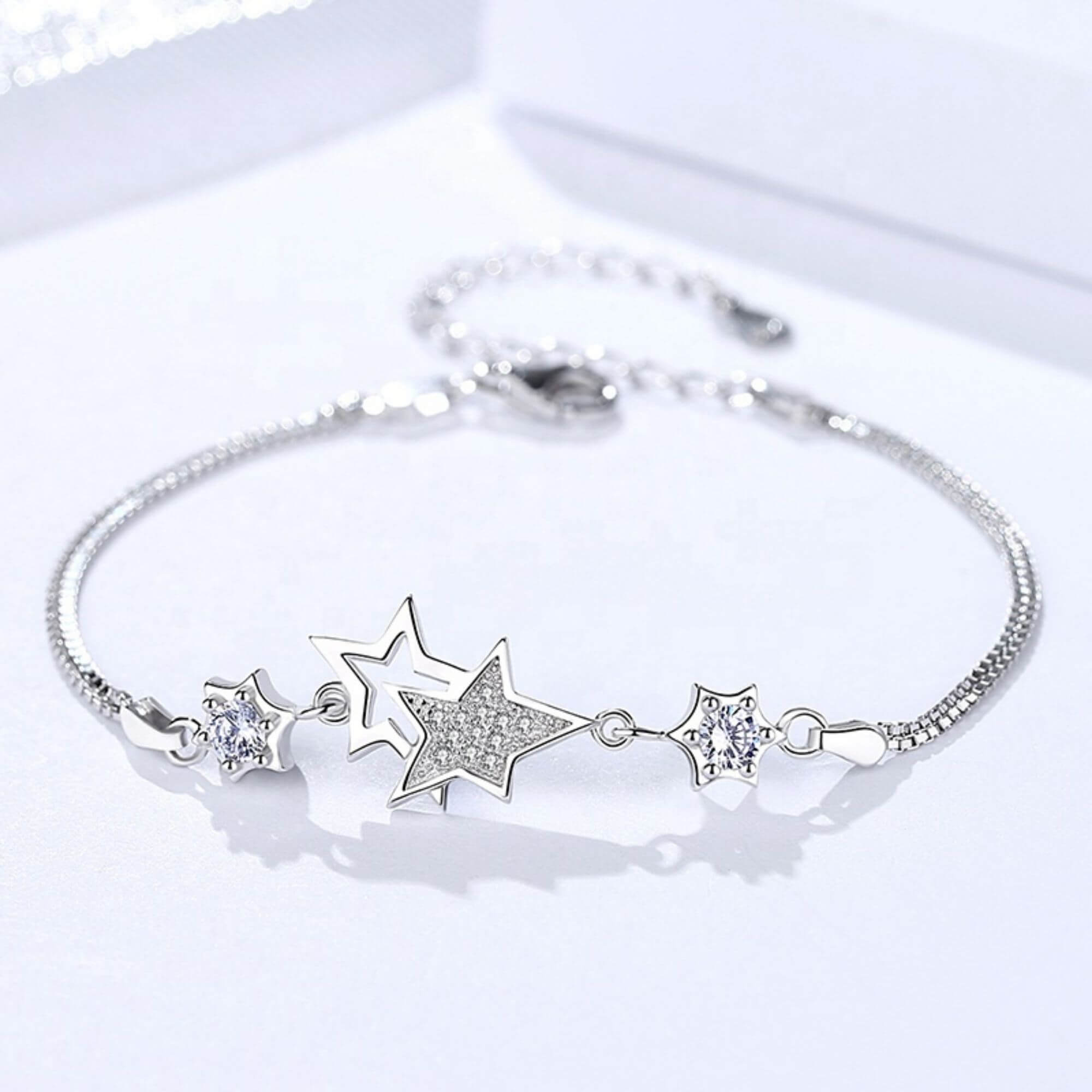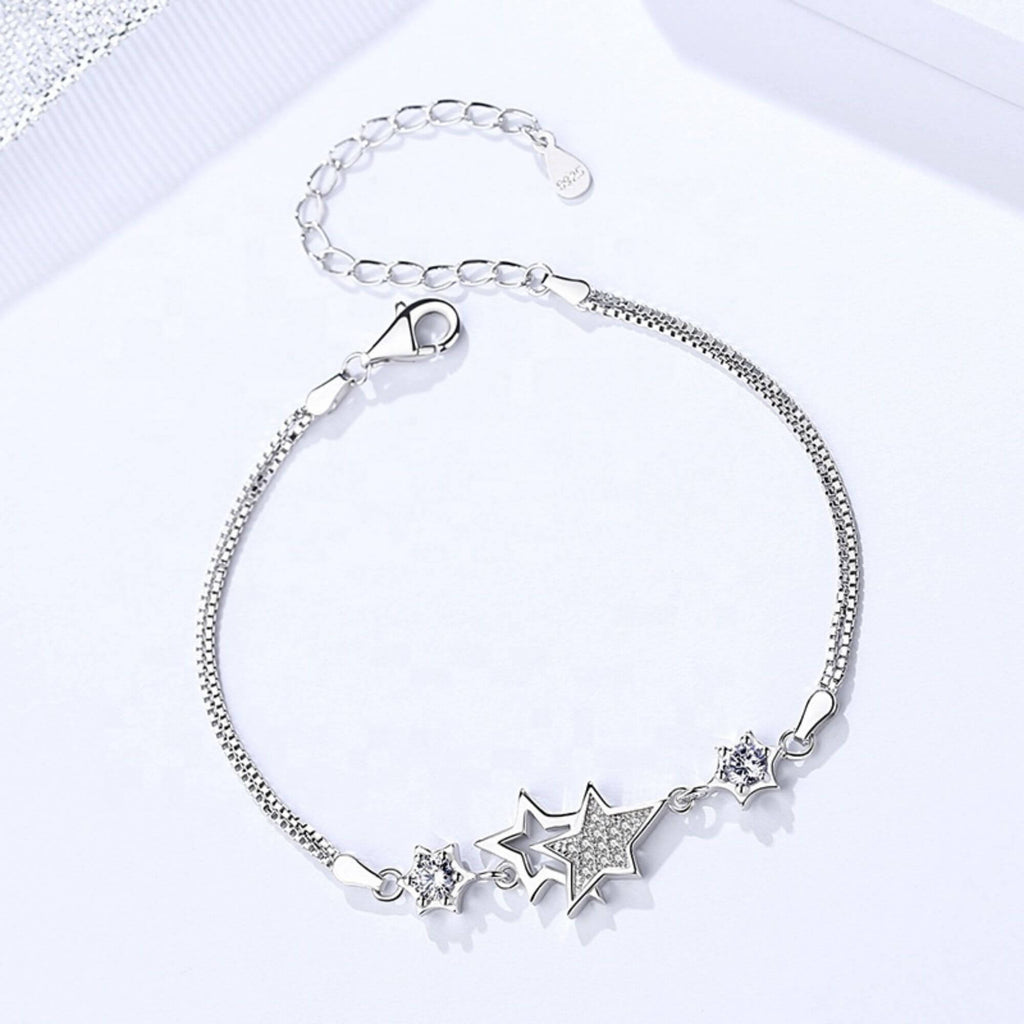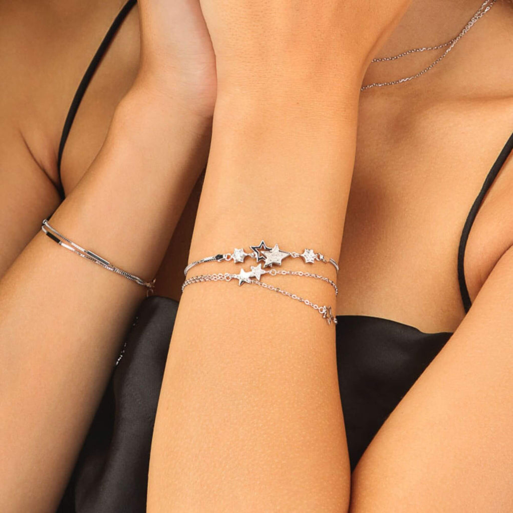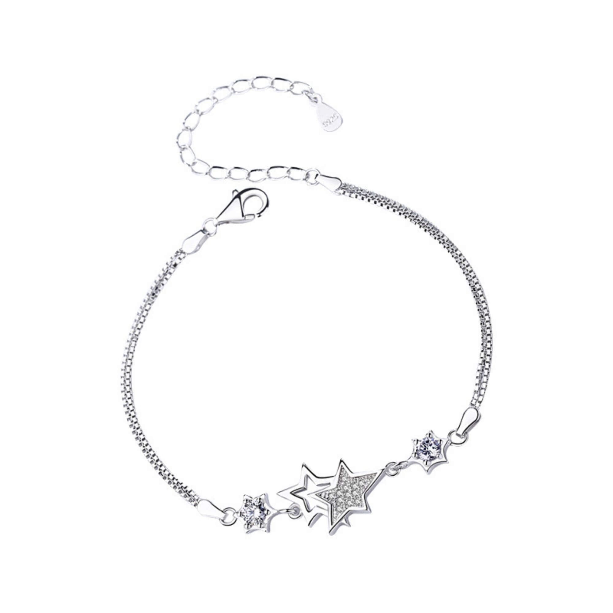 Sterling silver bracelet that features four small stars in a balanced arrangement, with the center star set with a single cubic zirconia for a soft glimmer. Light and expressive, it brings a hint of brightness while keeping the look simple and easy to wear.