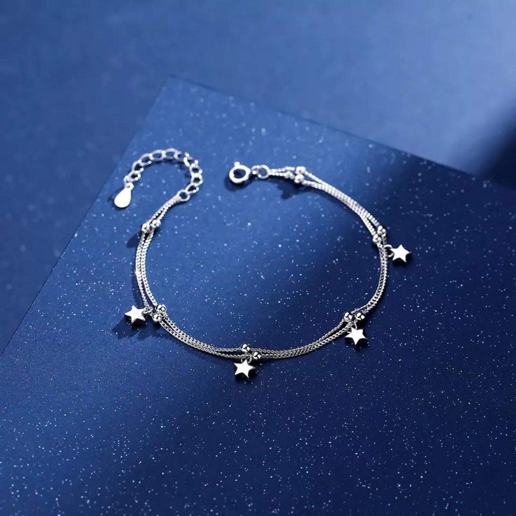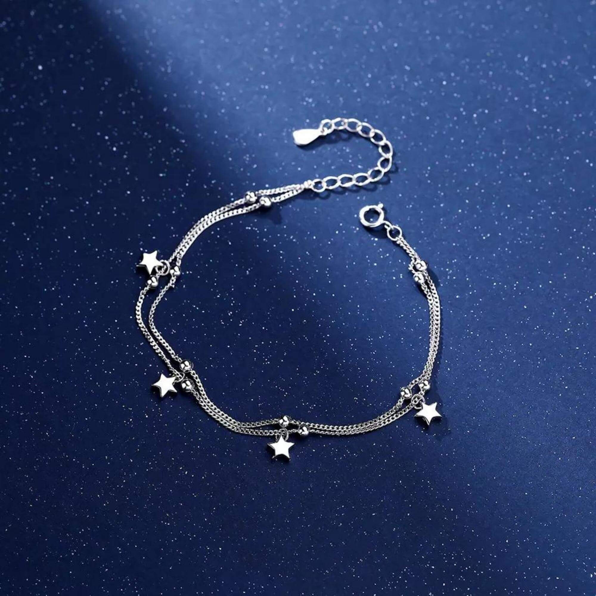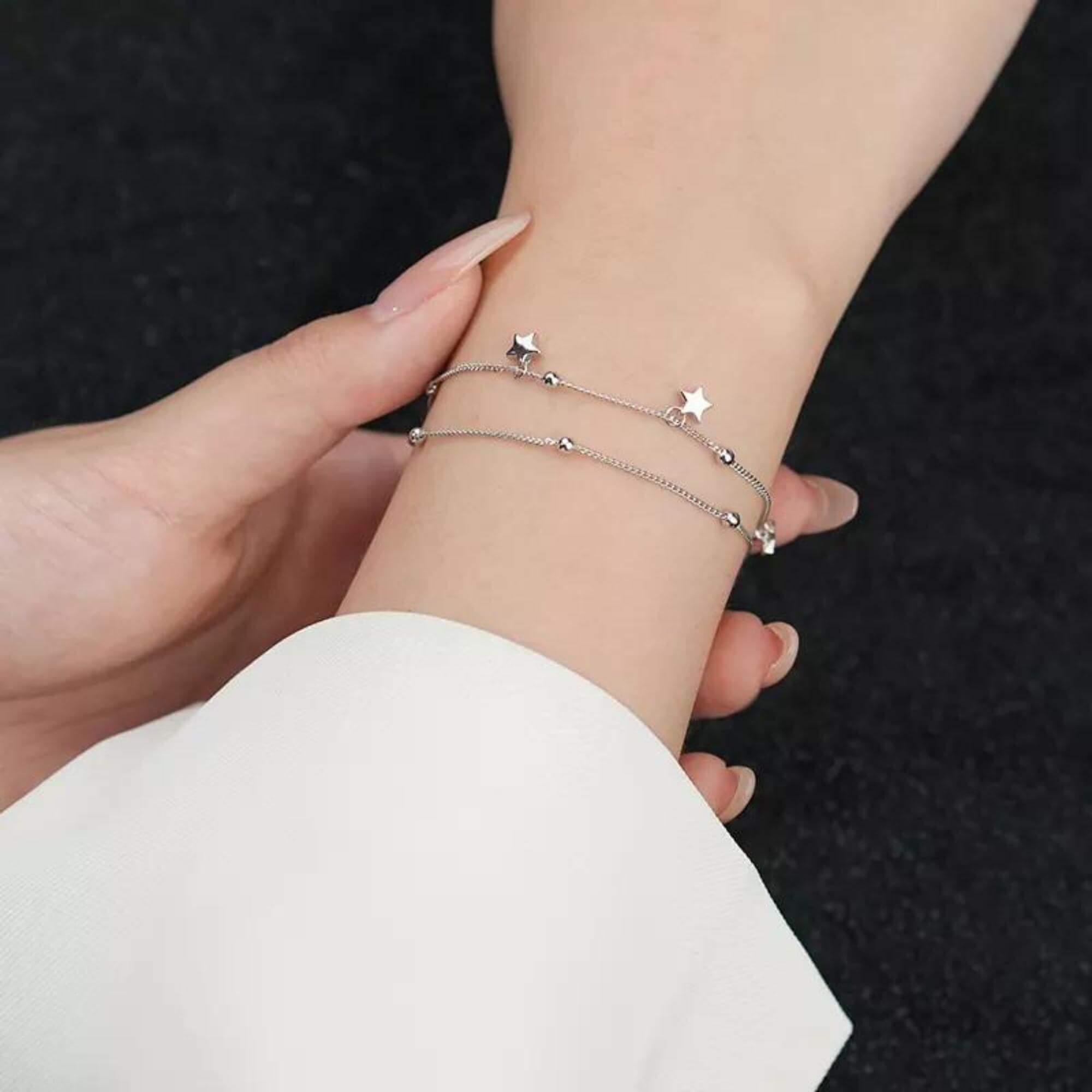 Sterling silver bracelet featuring a fine chain dotted with small beads and delicate star-shaped accents. The mix of textures adds quiet detail without feeling busy. A thoughtful piece for someone drawn to subtle symbolism and a light, balanced look.