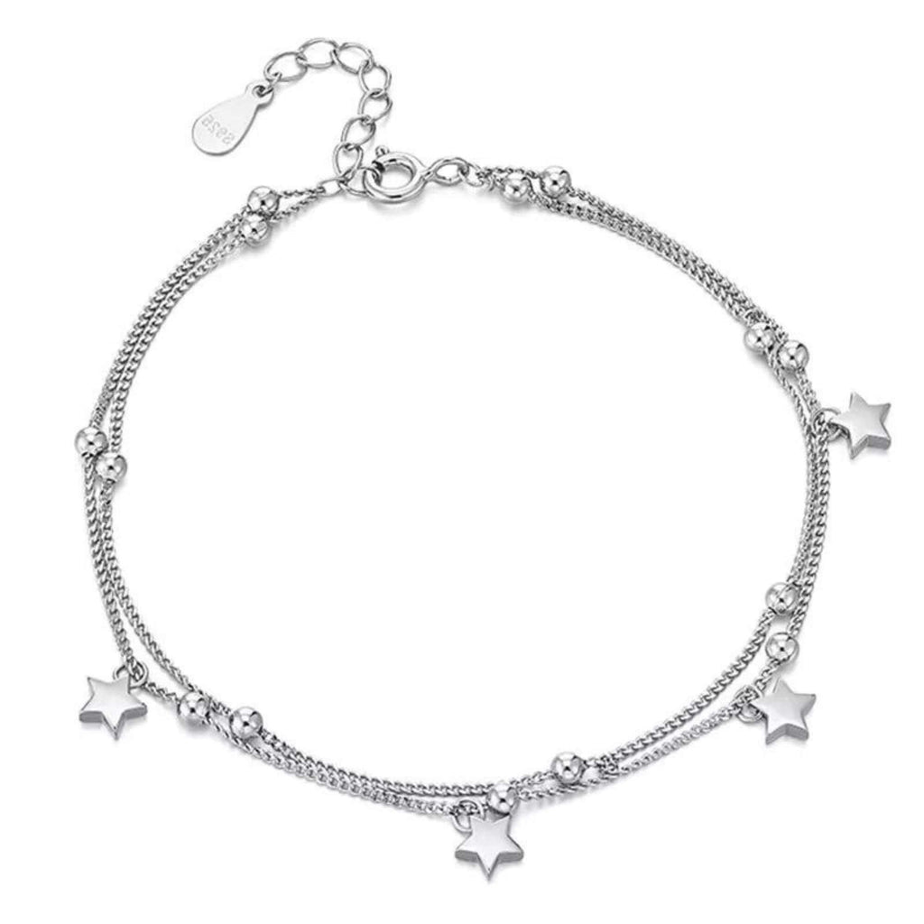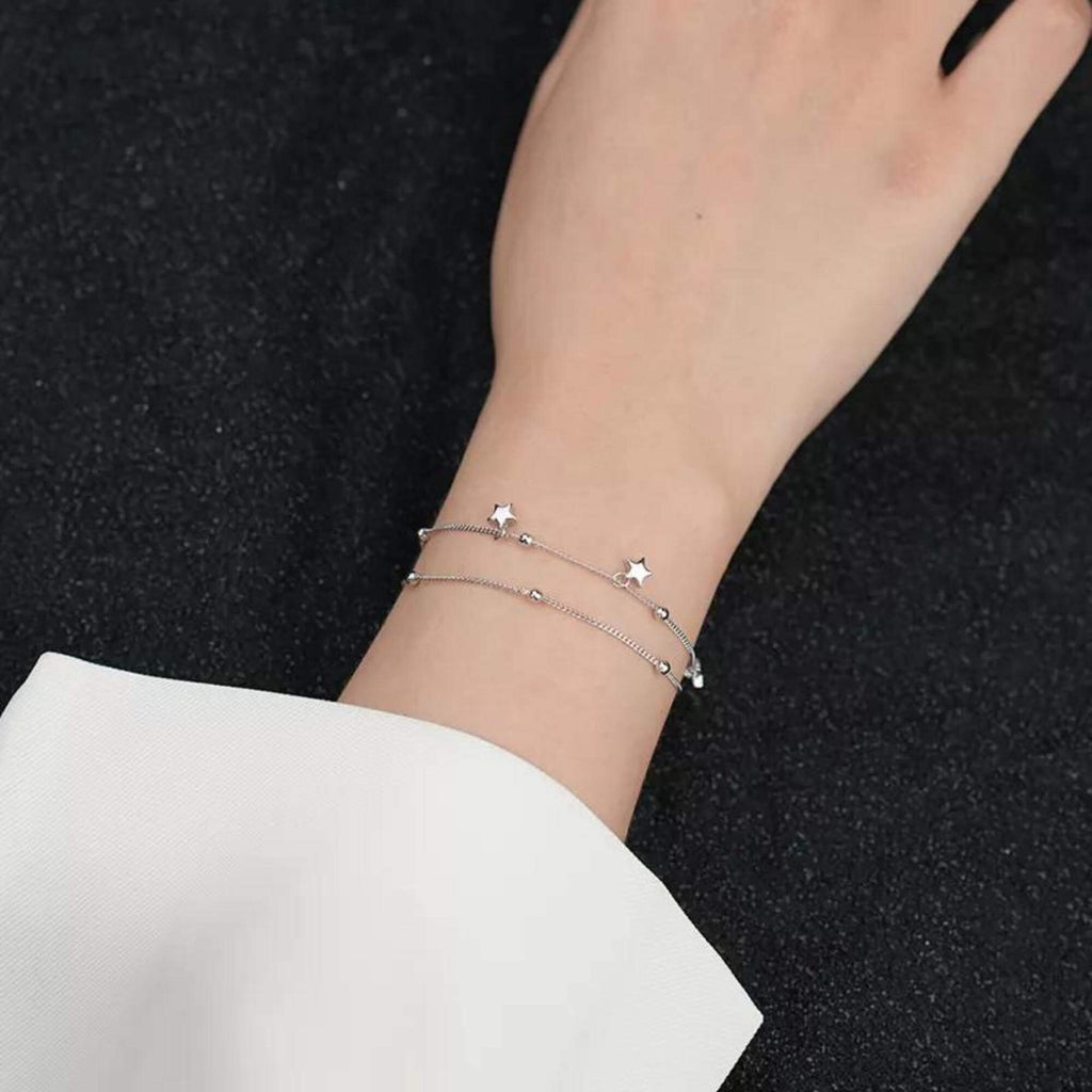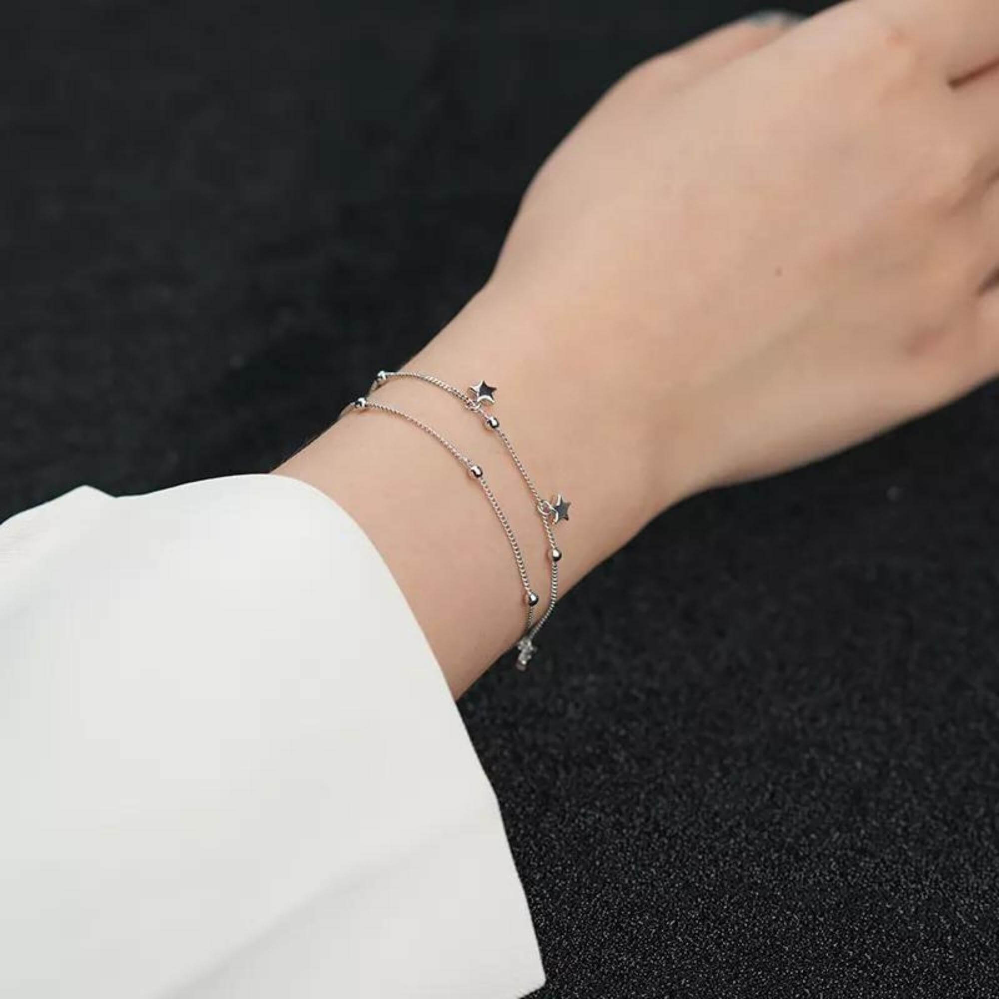 Sterling silver bracelet featuring a fine chain dotted with small beads and delicate star-shaped accents. The mix of textures adds quiet detail without feeling busy. A thoughtful piece for someone drawn to subtle symbolism and a light, balanced look.
