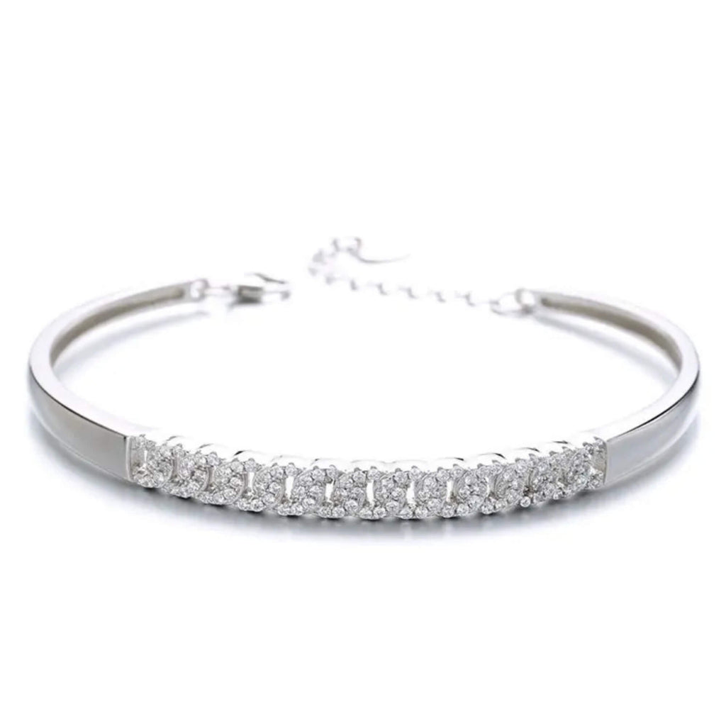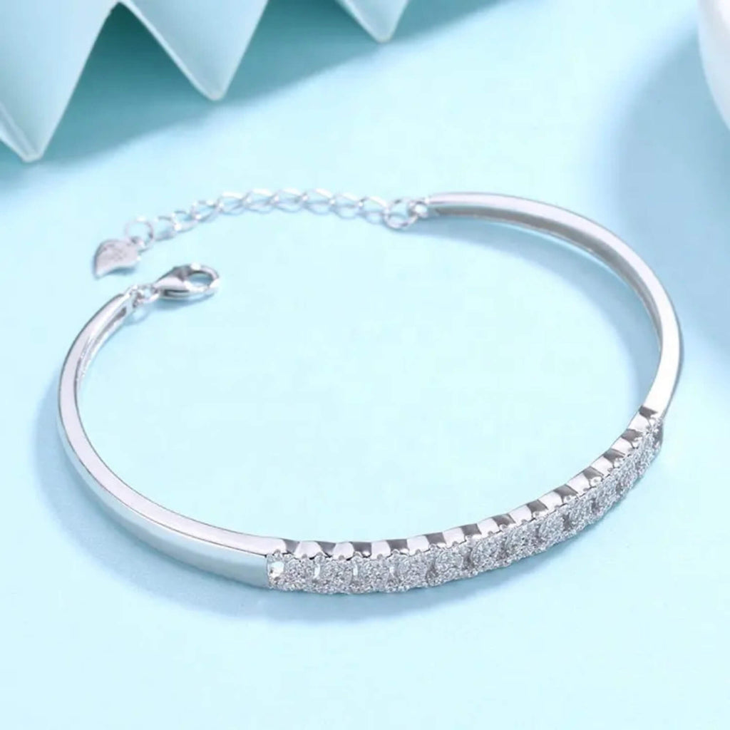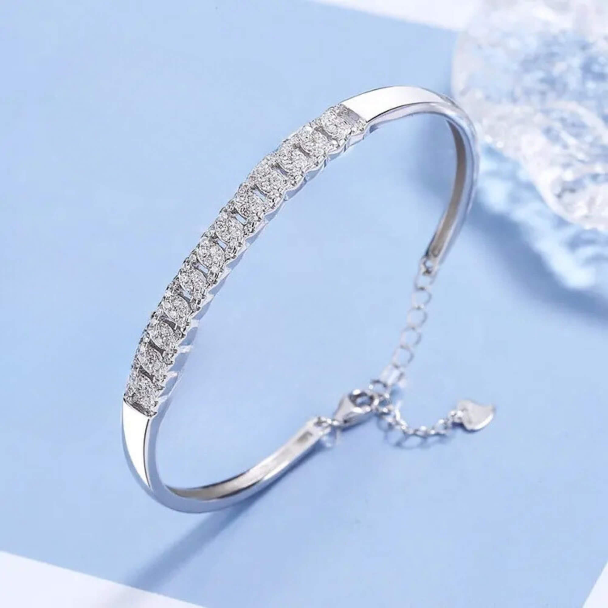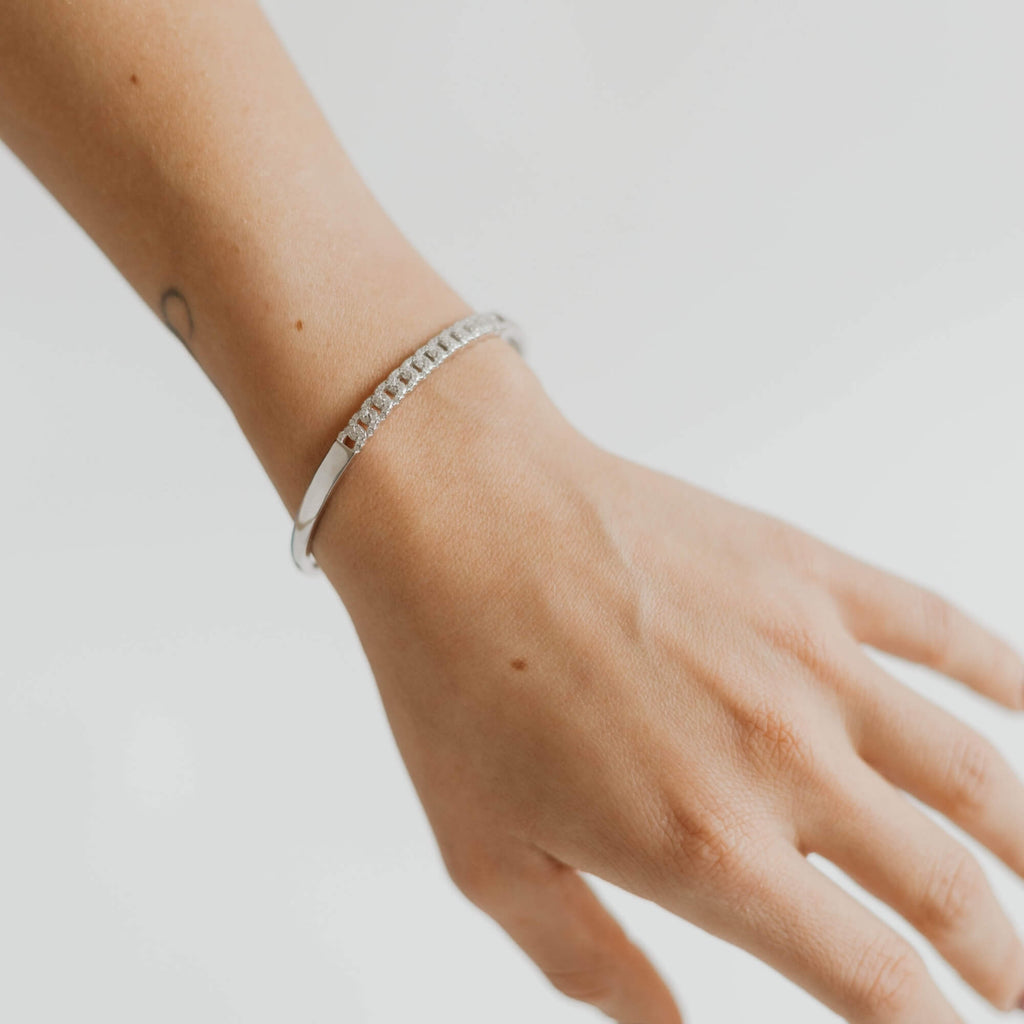 Sterling silver bangle featuring a central row of sparkling cubic zirconia stones framed by smooth, structured edges. The design feels bold and confident, perfect for those who are drawn to jewelry with a strong and striking presence.