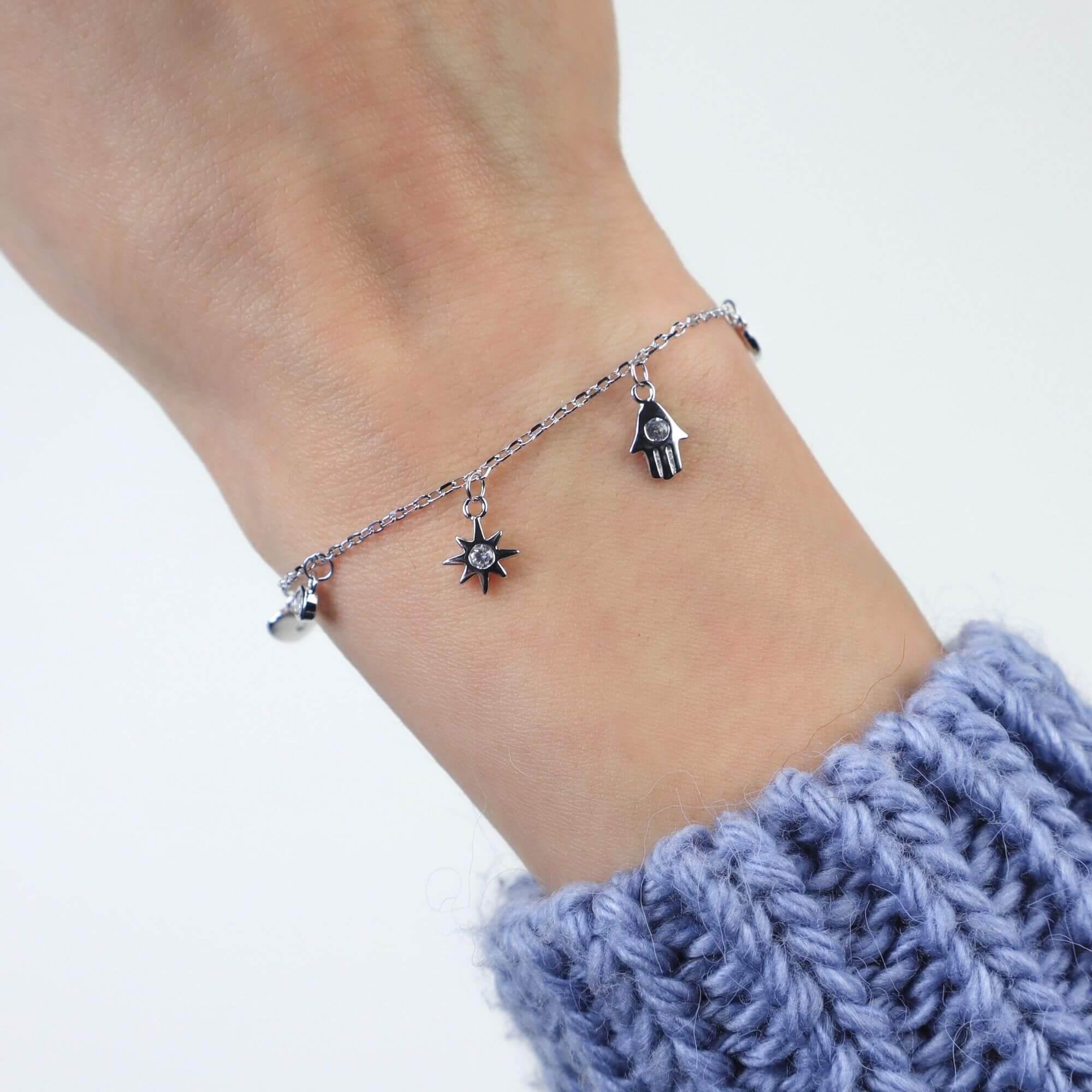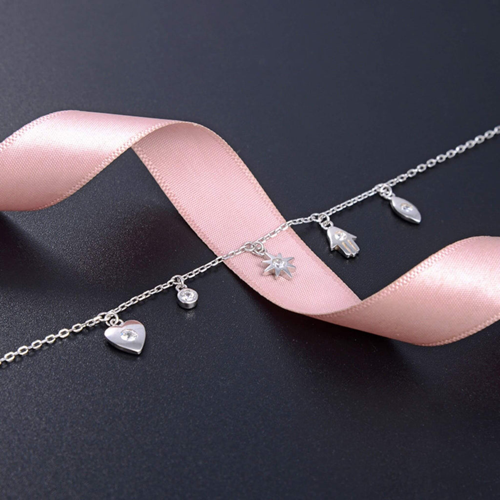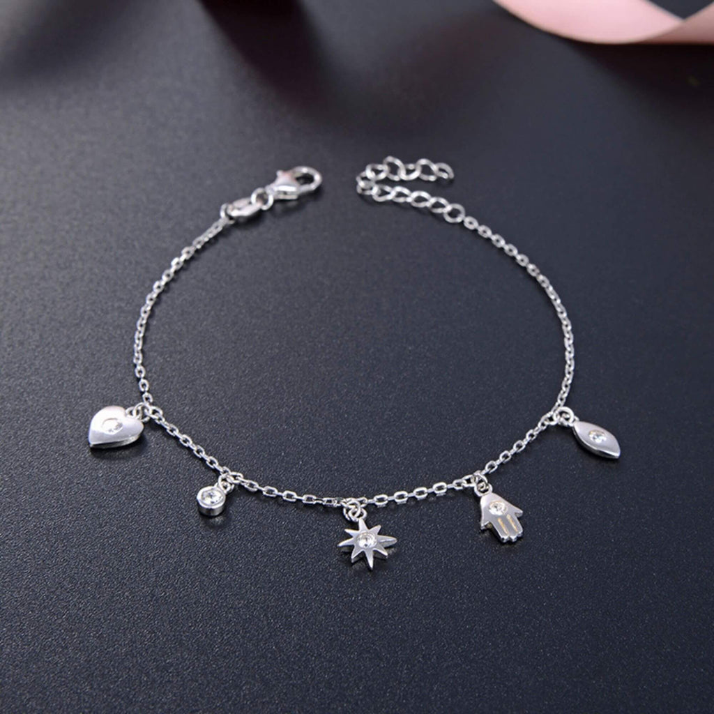 Sterling silver bracelet strung with five meaningful charms, including a heart, star, and Hamsa hand. Each symbol adds depth, making this more than just a beautiful piece.