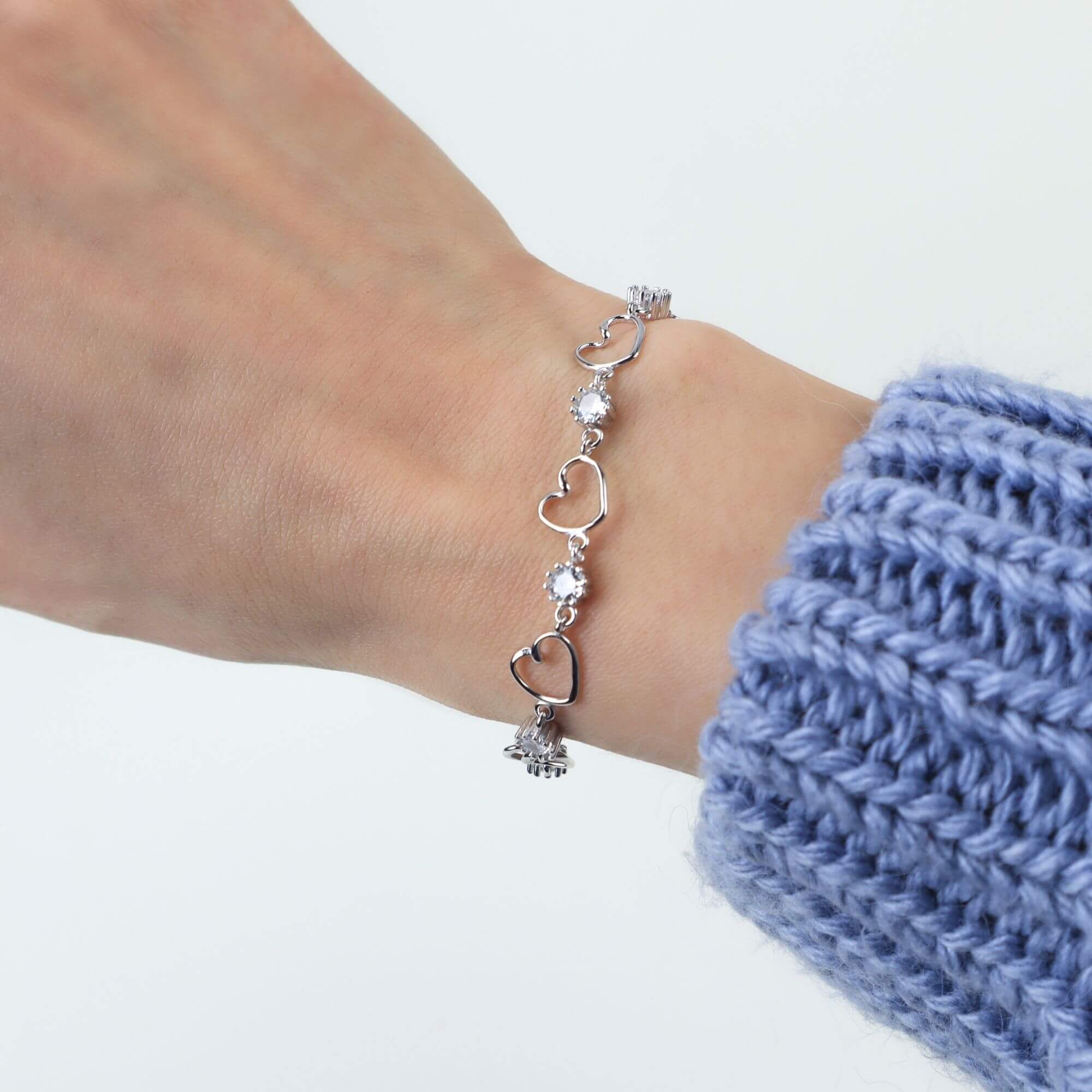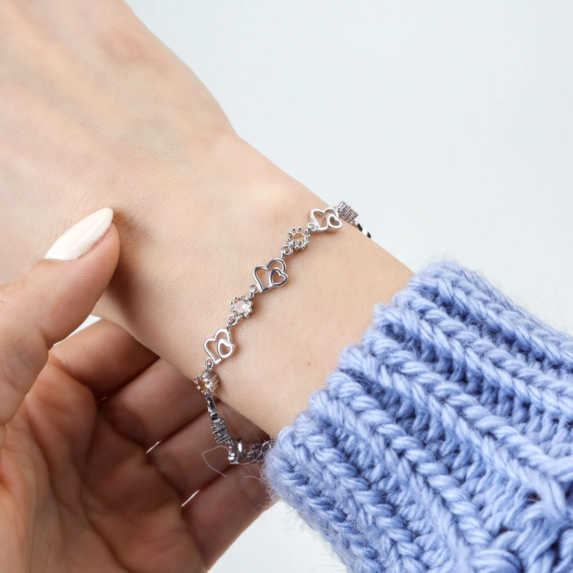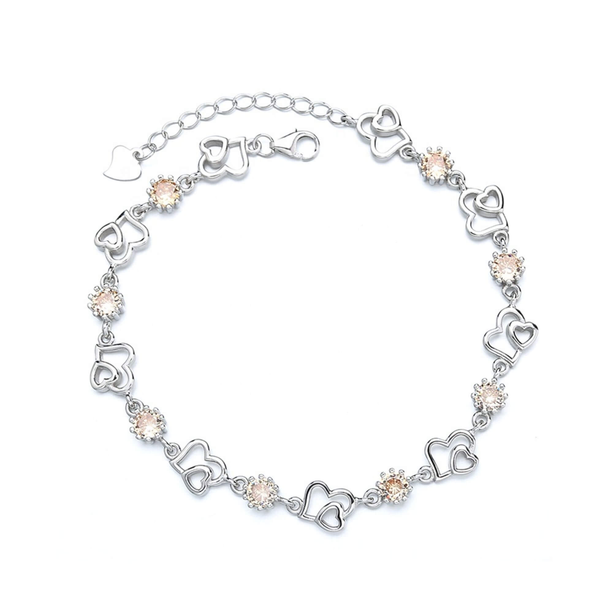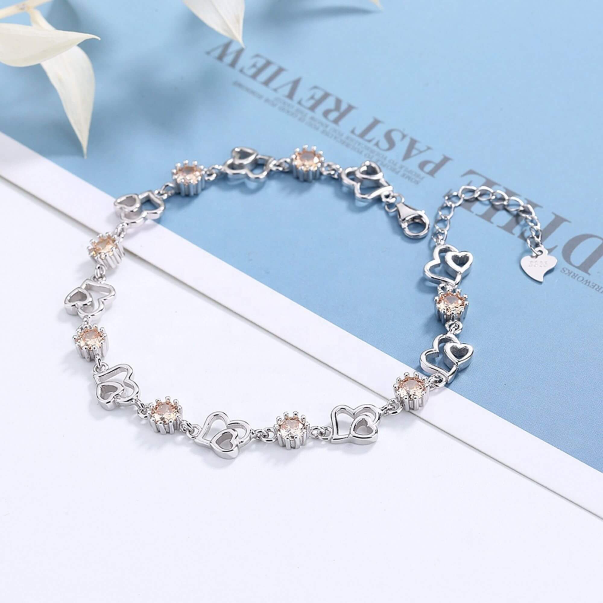 Sterling silver bracelet with interlinked hearts and soft orange stones. A warm-toned design that symbolizes connection and affection in a gentle way.