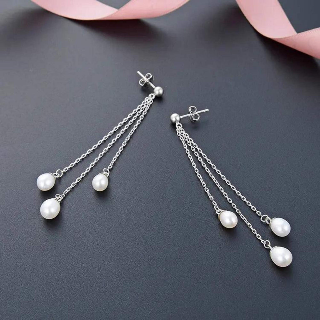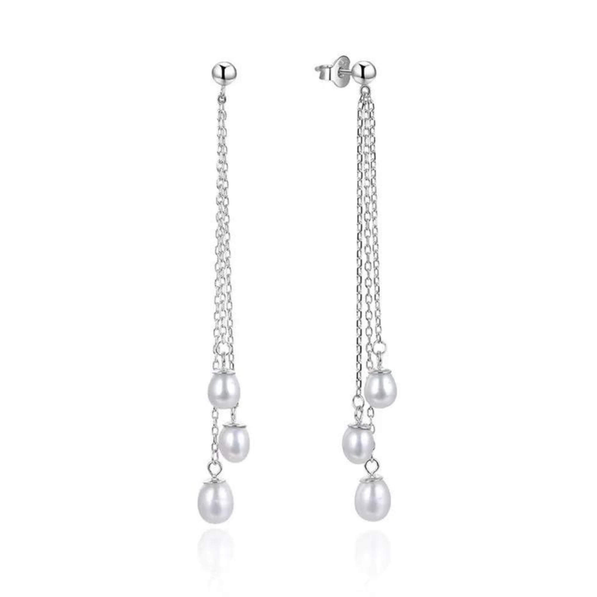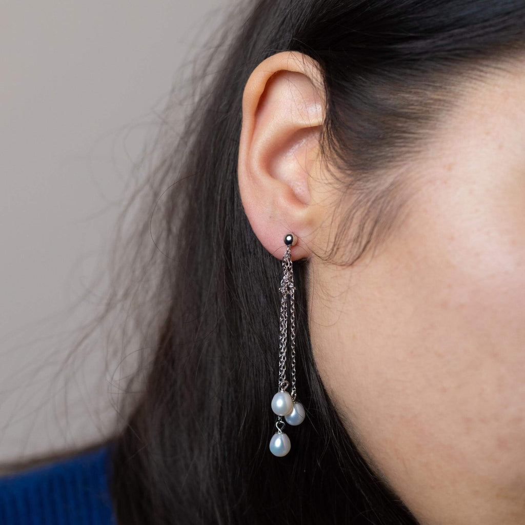 Silver earrings featuring three pearls suspended on delicate chains of different lengths. The layered design adds movement and brings a fresh take to a classic design.