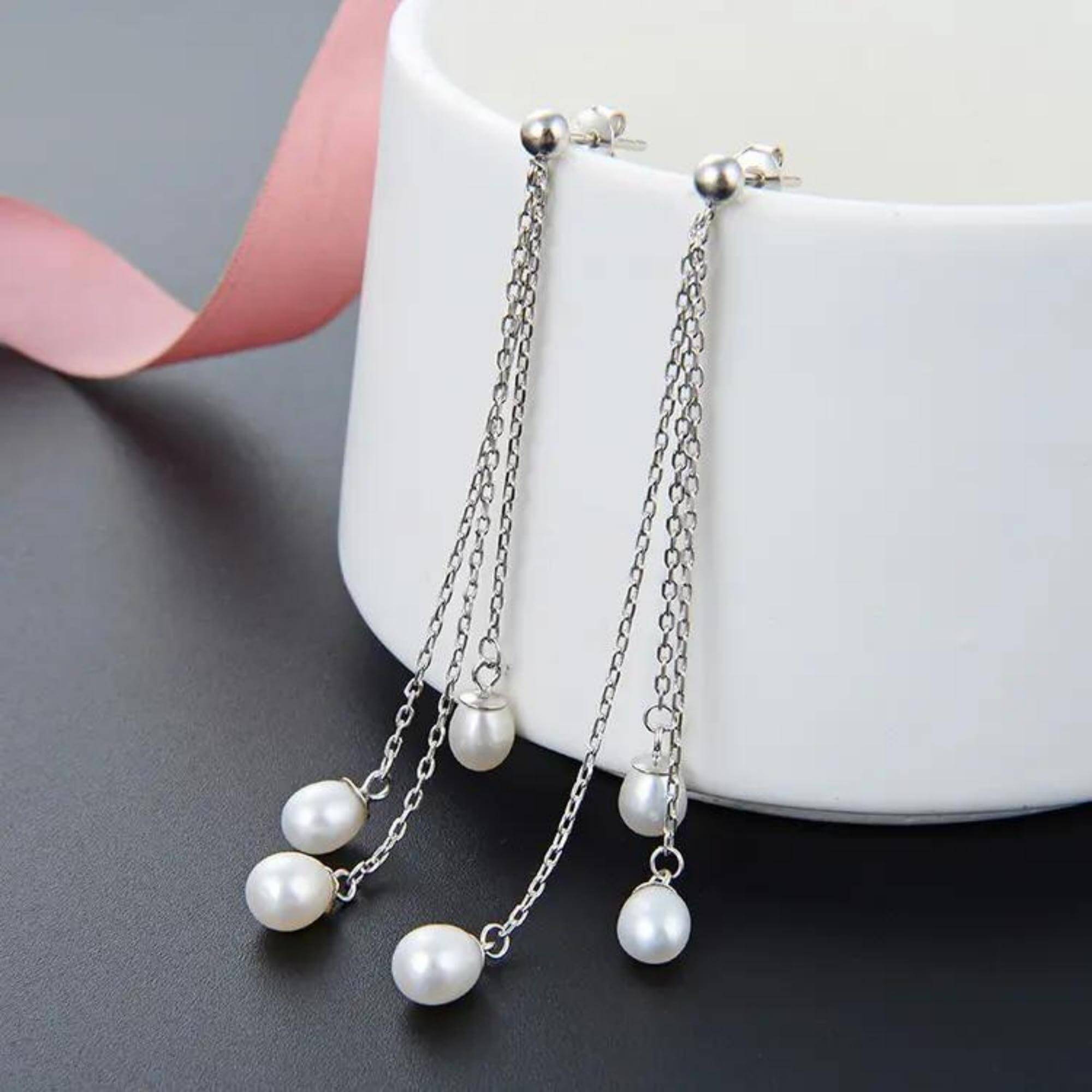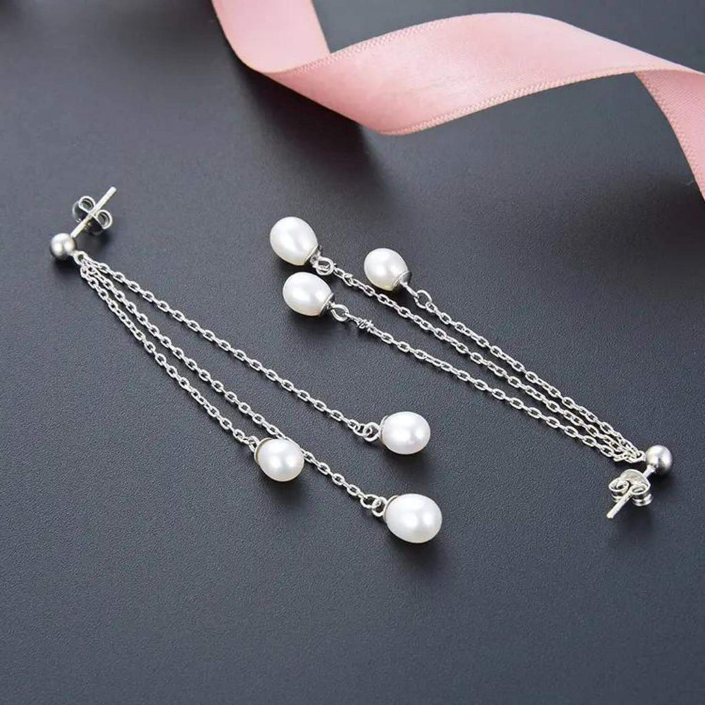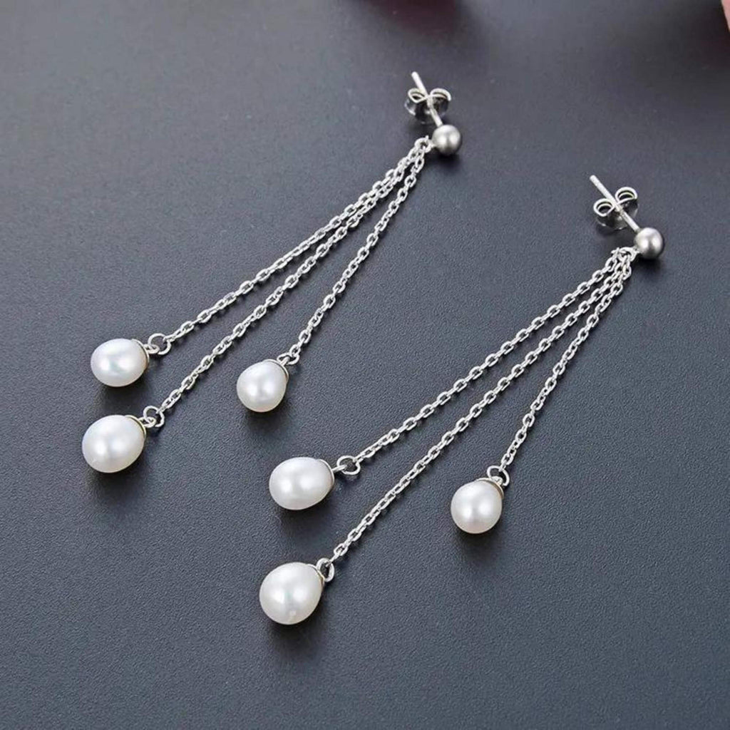 Silver earrings featuring three pearls suspended on delicate chains of different lengths. The layered design adds movement and brings a fresh take to a classic design.