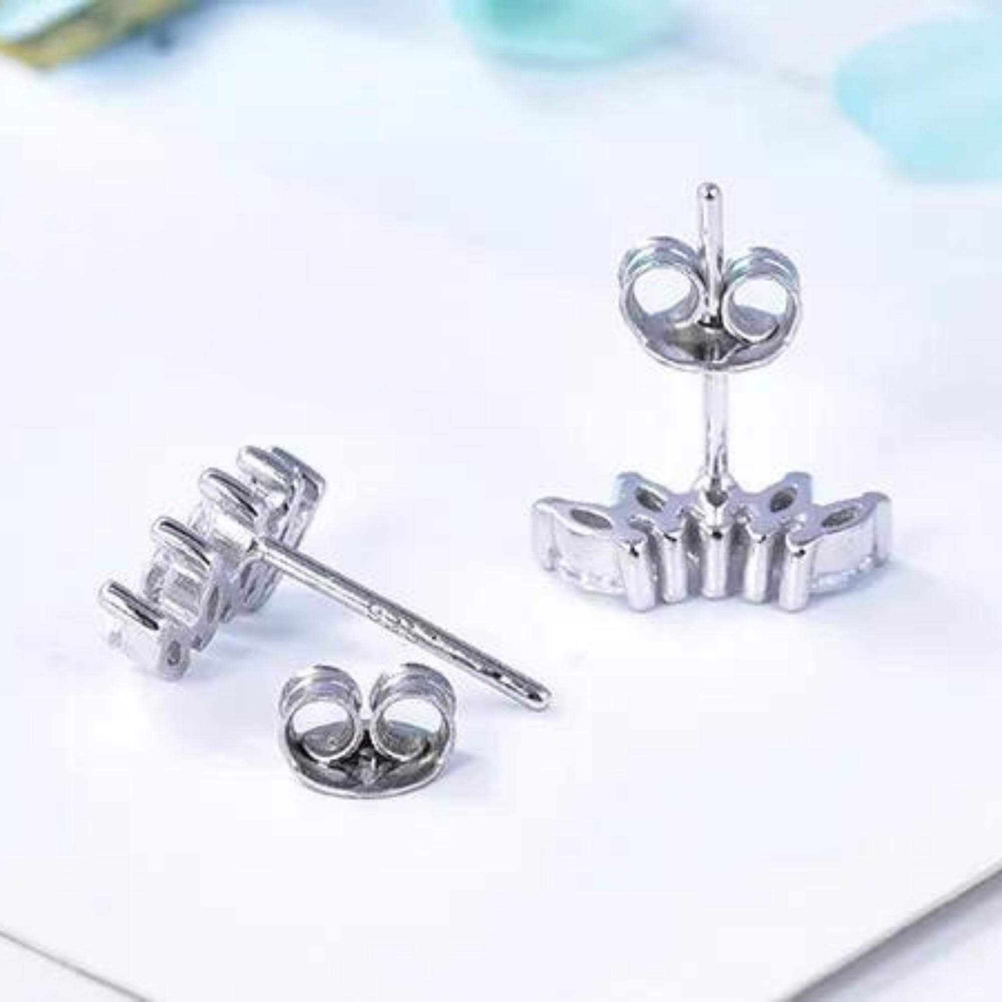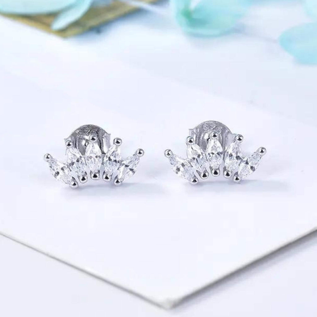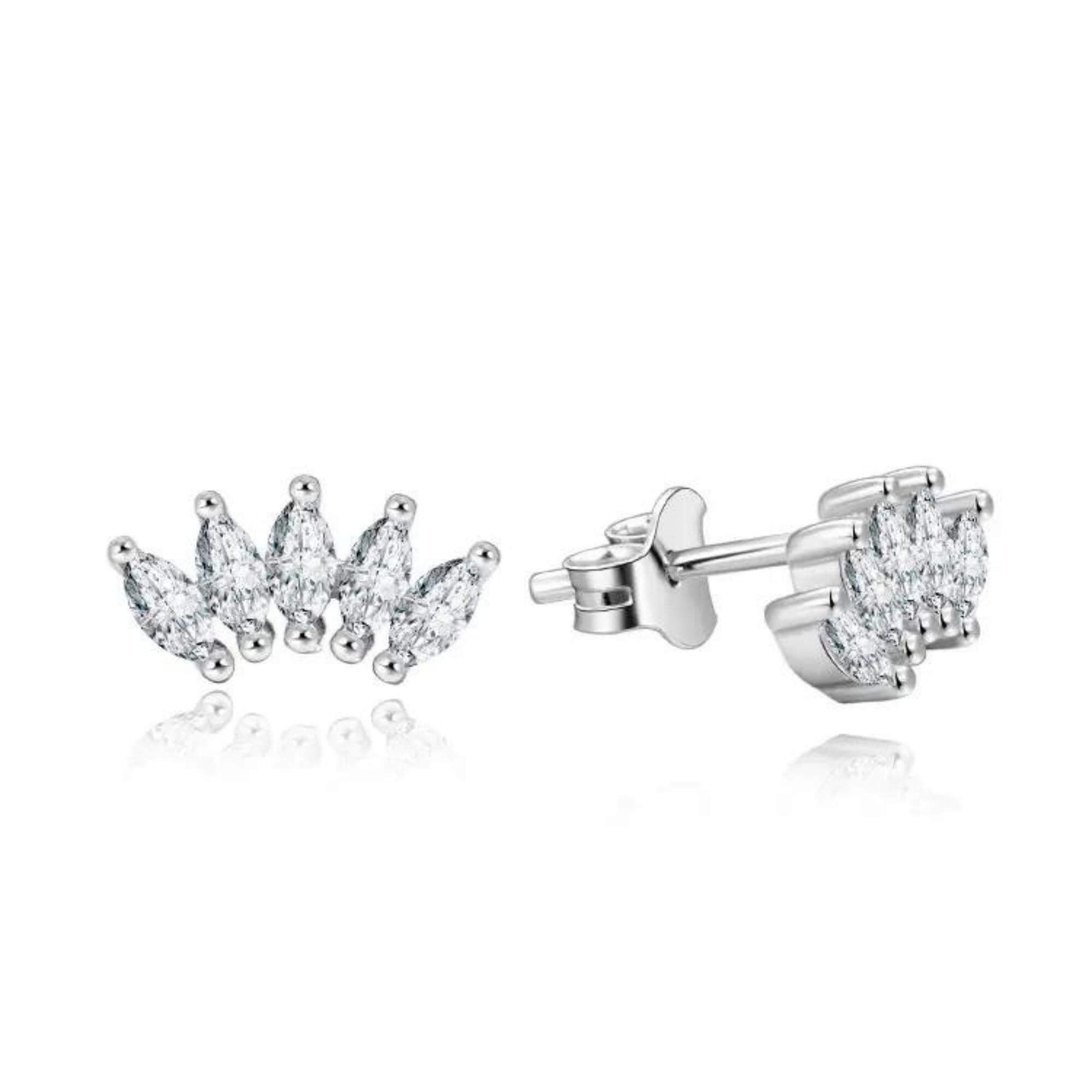 Silver stud earrings shaped like a delicate crown, featuring marquise-cut stones for subtle sparkle. Comfortable for everyday wear, they add a charming detail to your look and offer a simple way to bring a little extra personality to your jewelry collection.