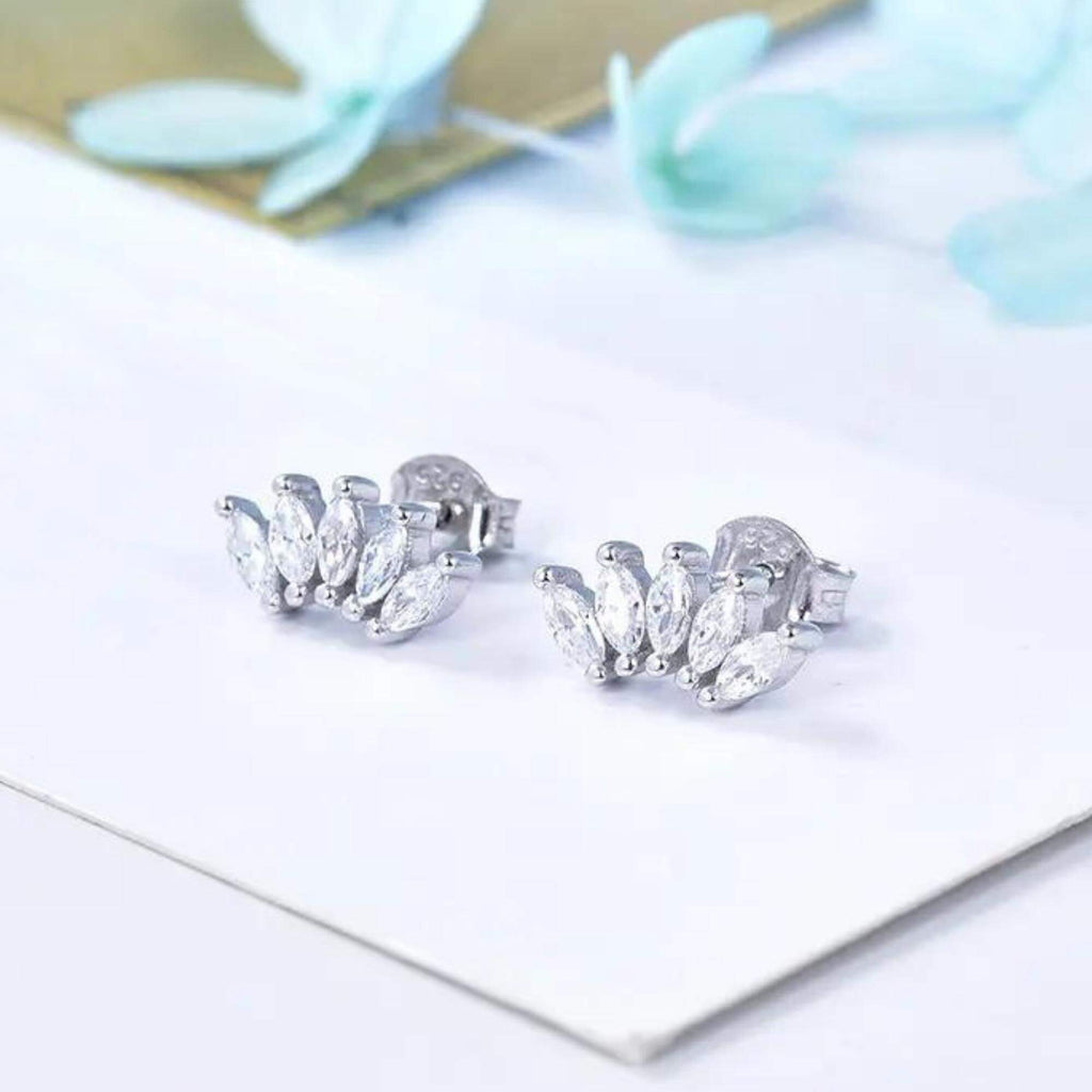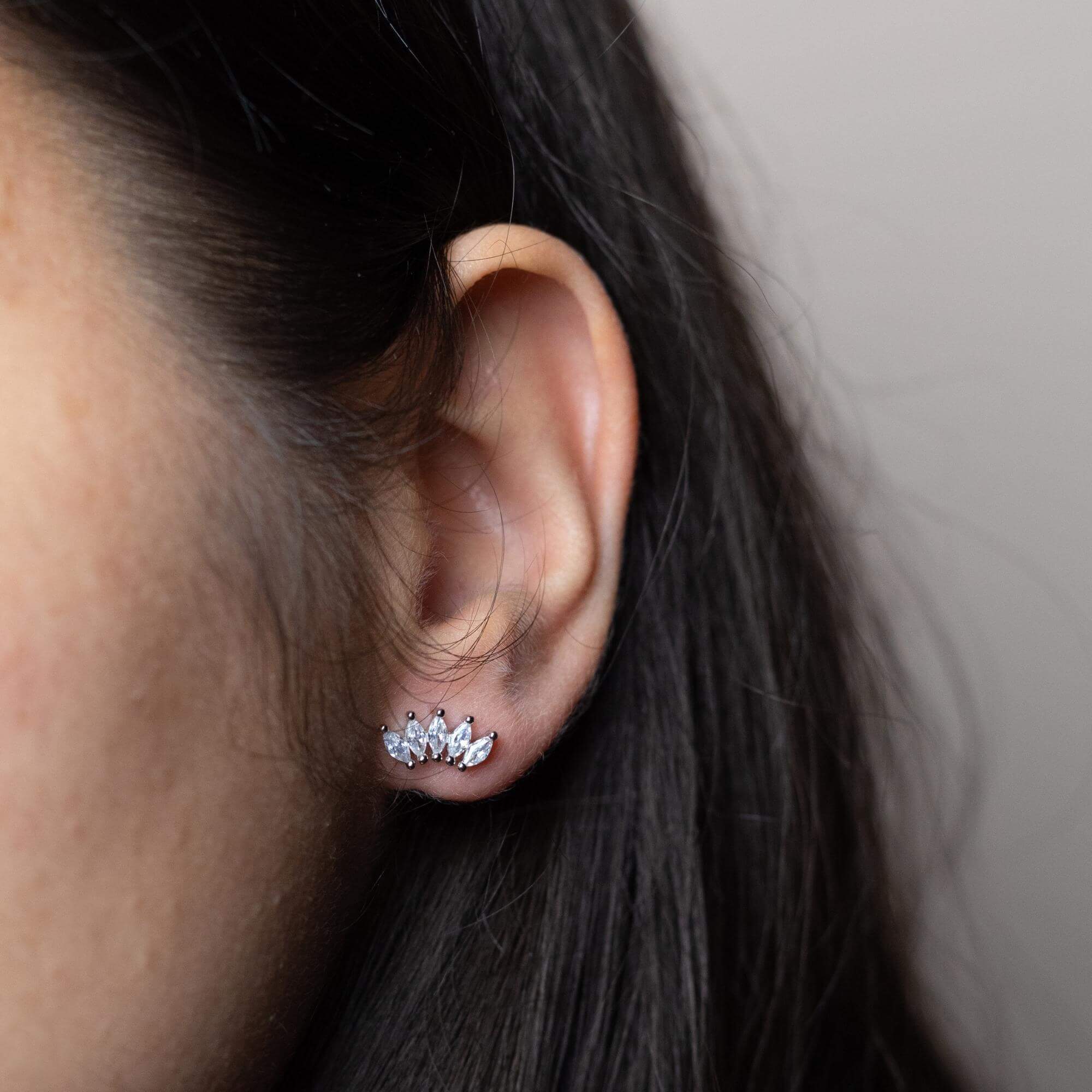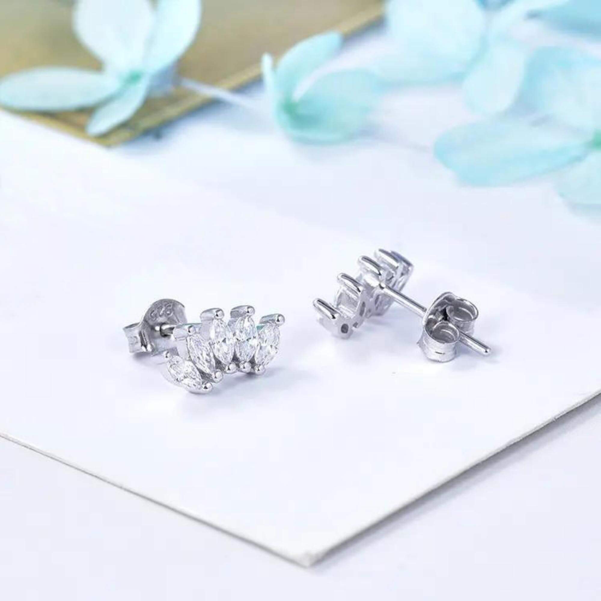 Silver stud earrings shaped like a delicate crown, featuring marquise-cut stones for subtle sparkle. Comfortable for everyday wear, they add a charming detail to your look and offer a simple way to bring a little extra personality to your jewelry collection.