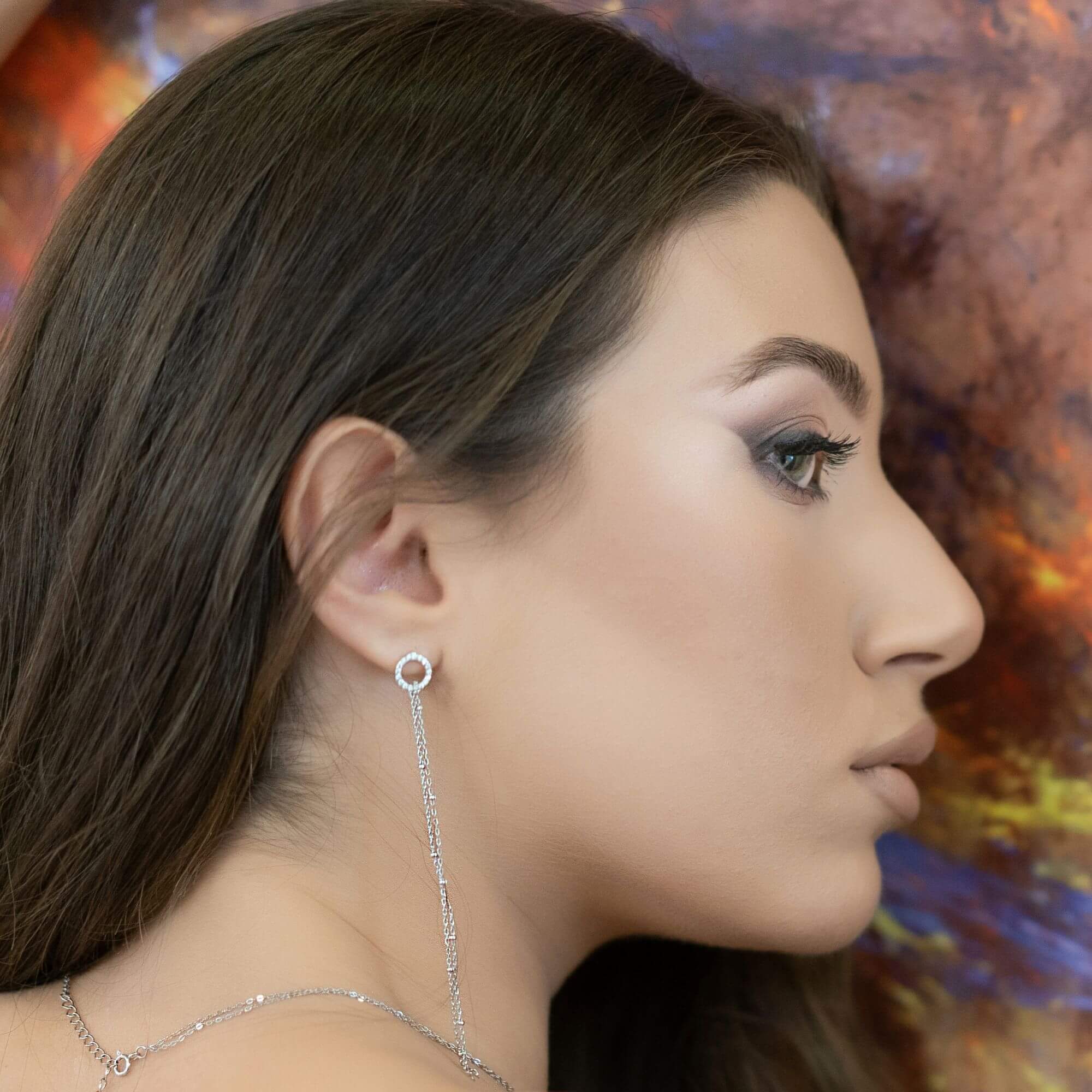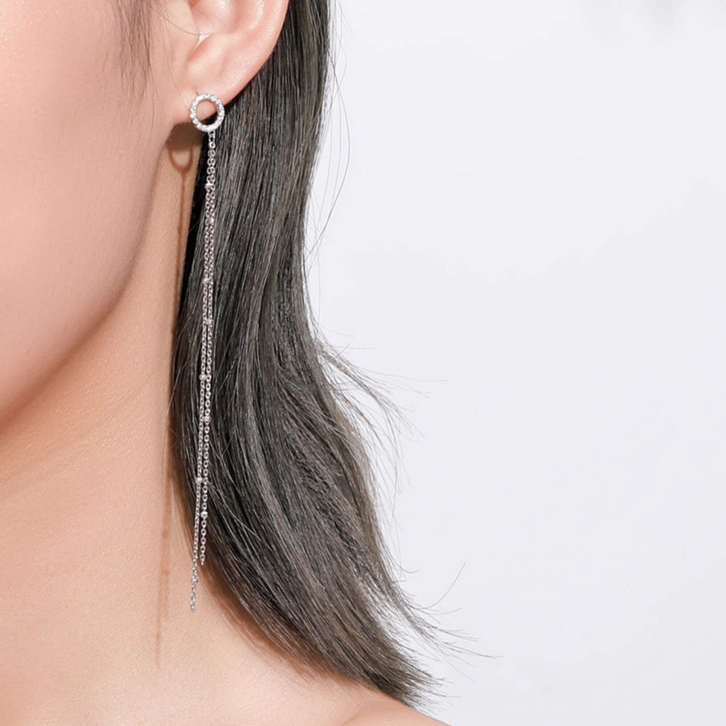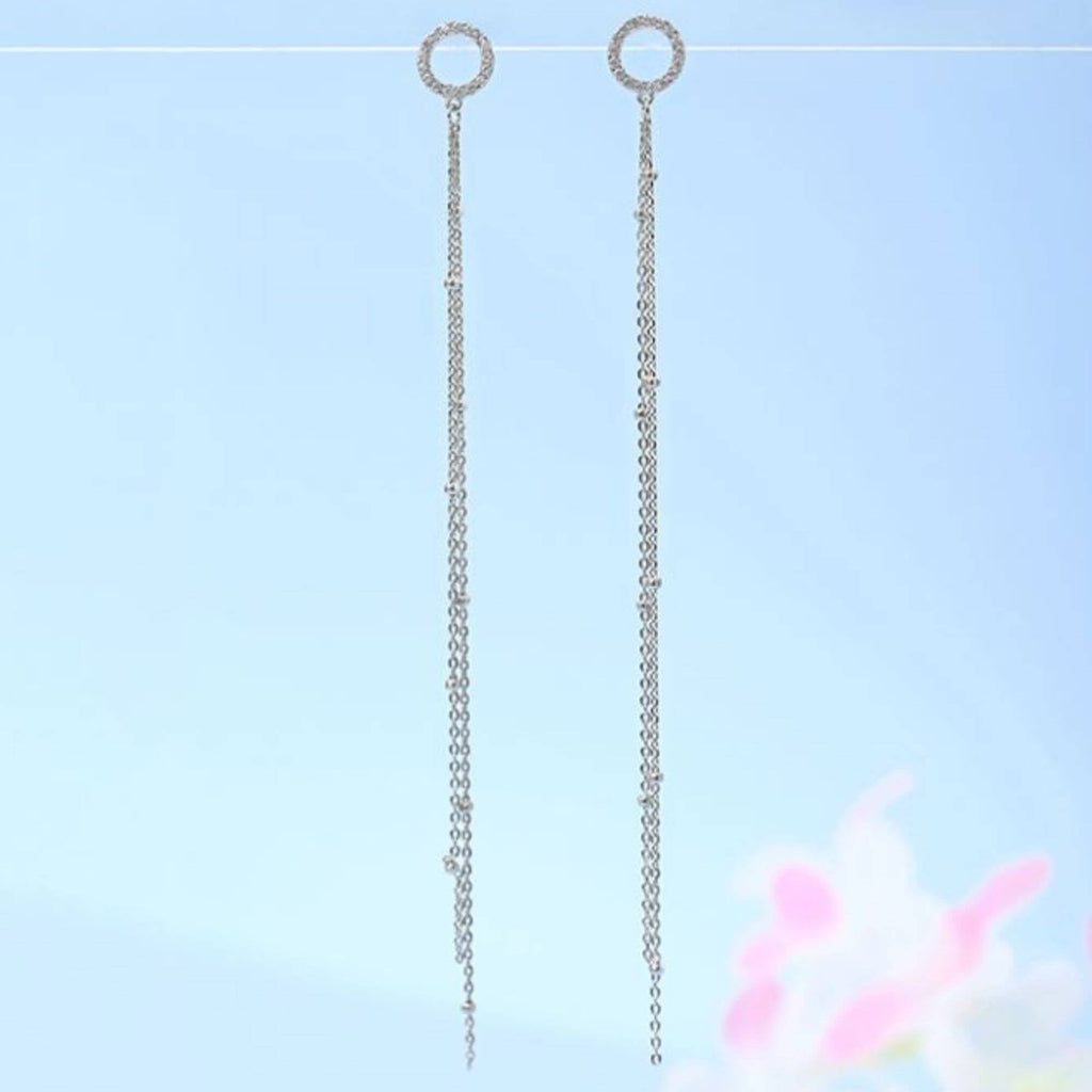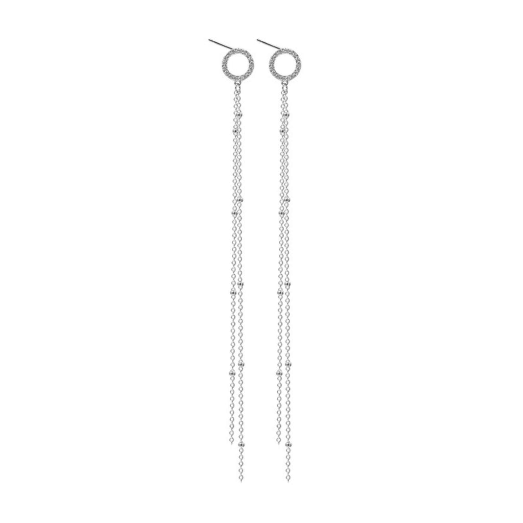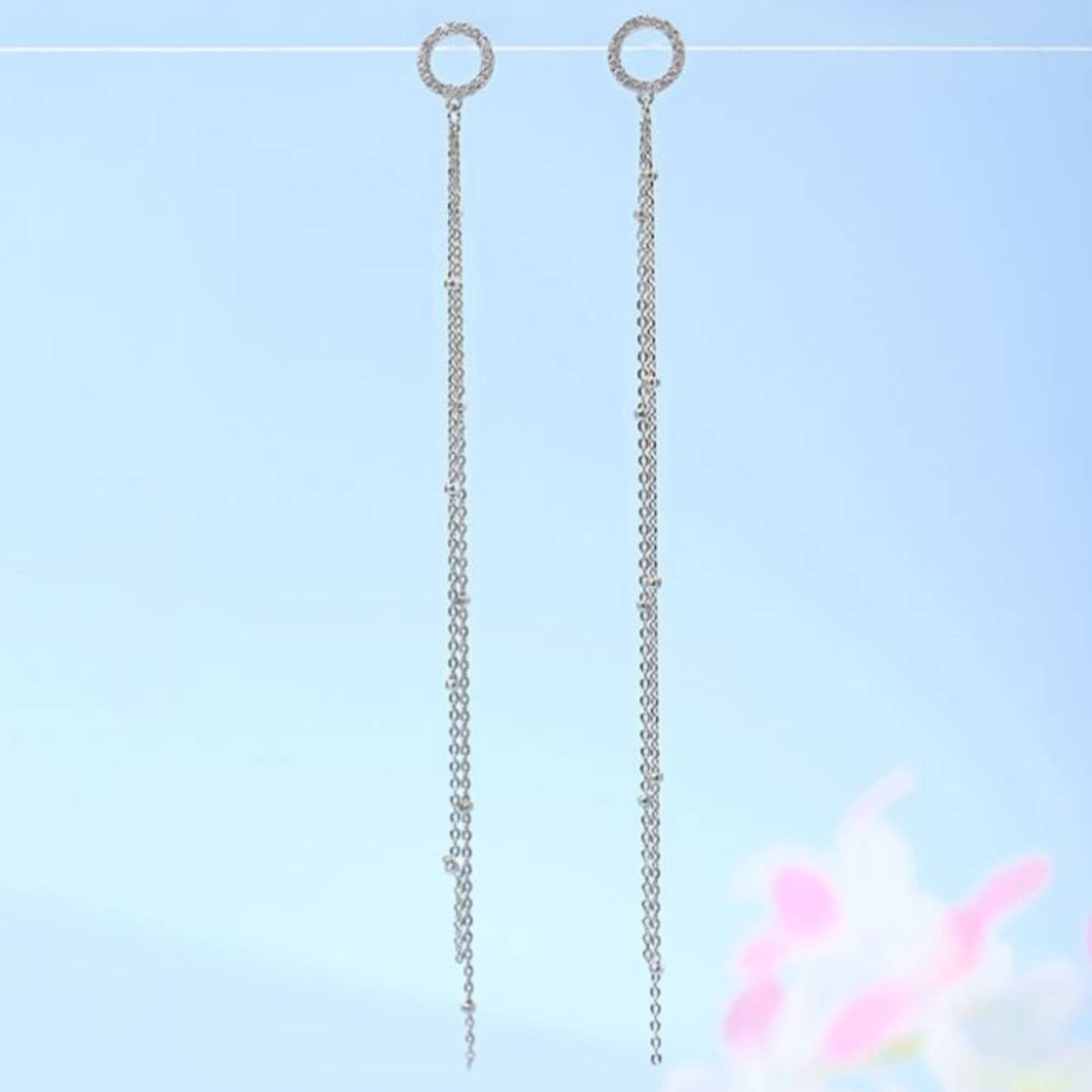 At 11 centimeters in length, these drop earrings make a gentle impression. A trail of silver beads leads to a zirconia-set circle, creating a design that feels balanced and full of soft shine.