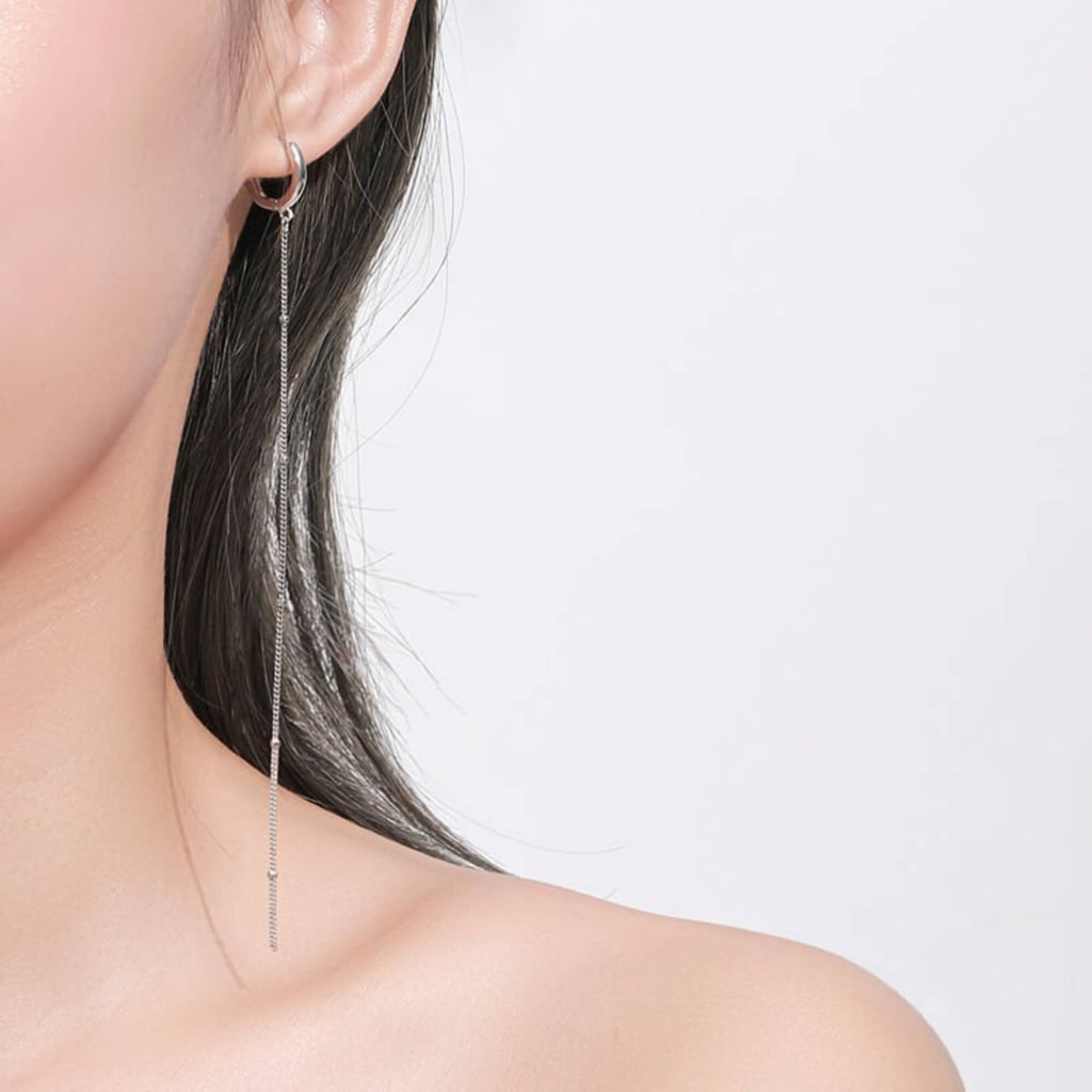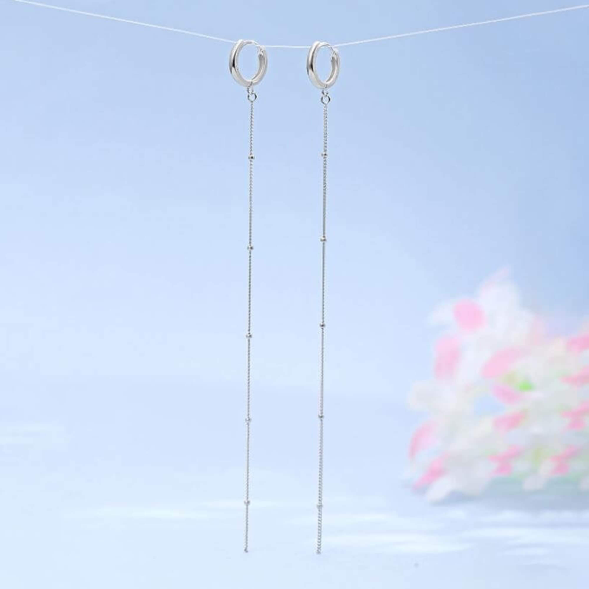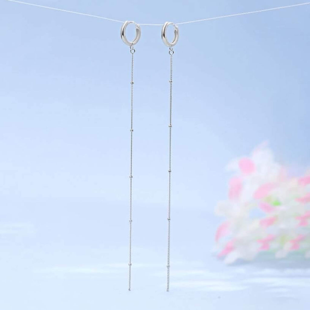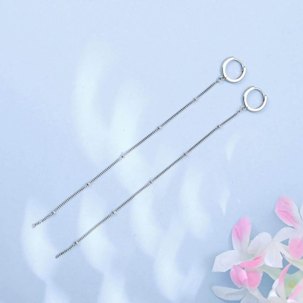 Long and flowing, this is a pair of silver earrings that stretches 12.5 centimeters and ends in a cascade of silver beads. Anchored by small hoops, they offer light movement and an elegant presence.