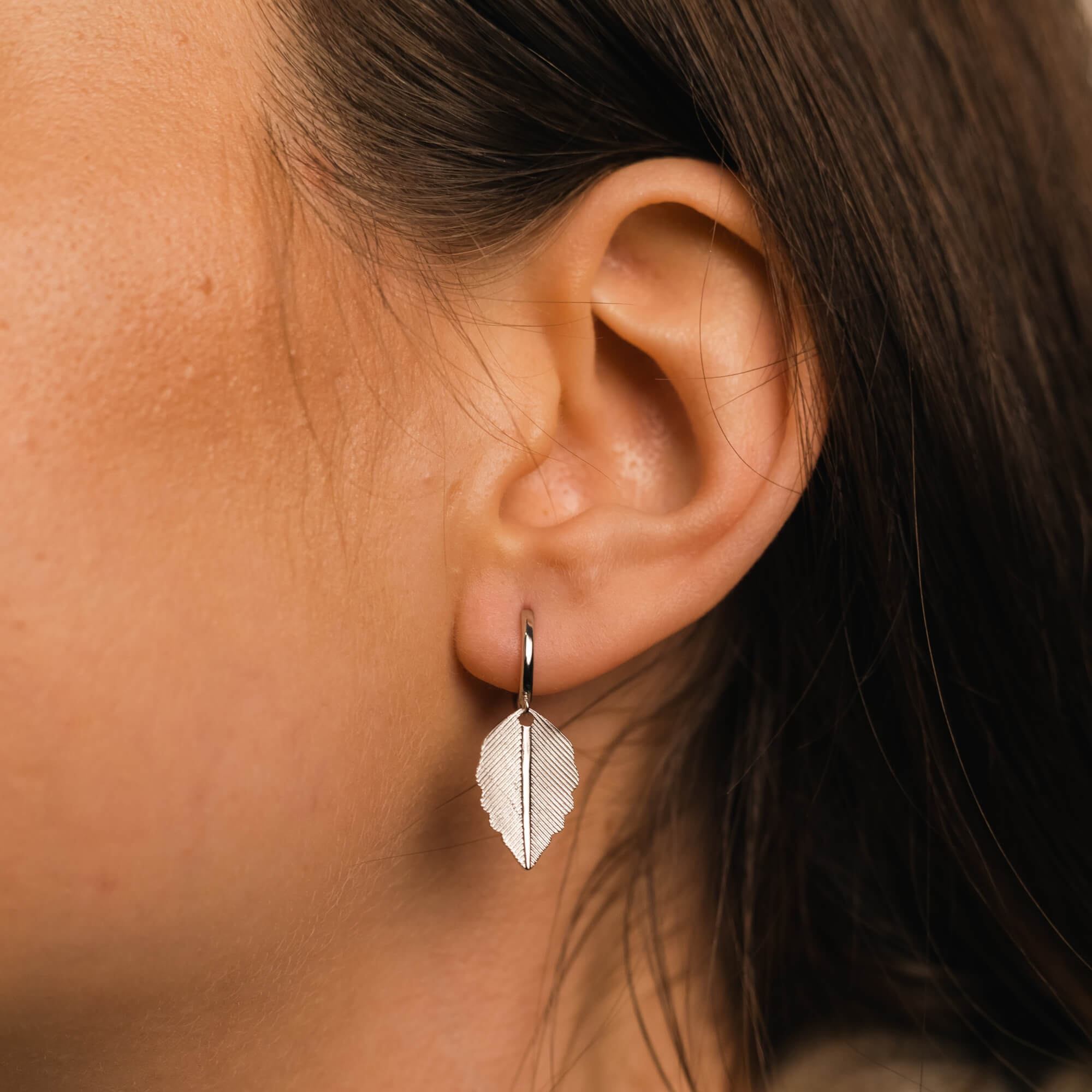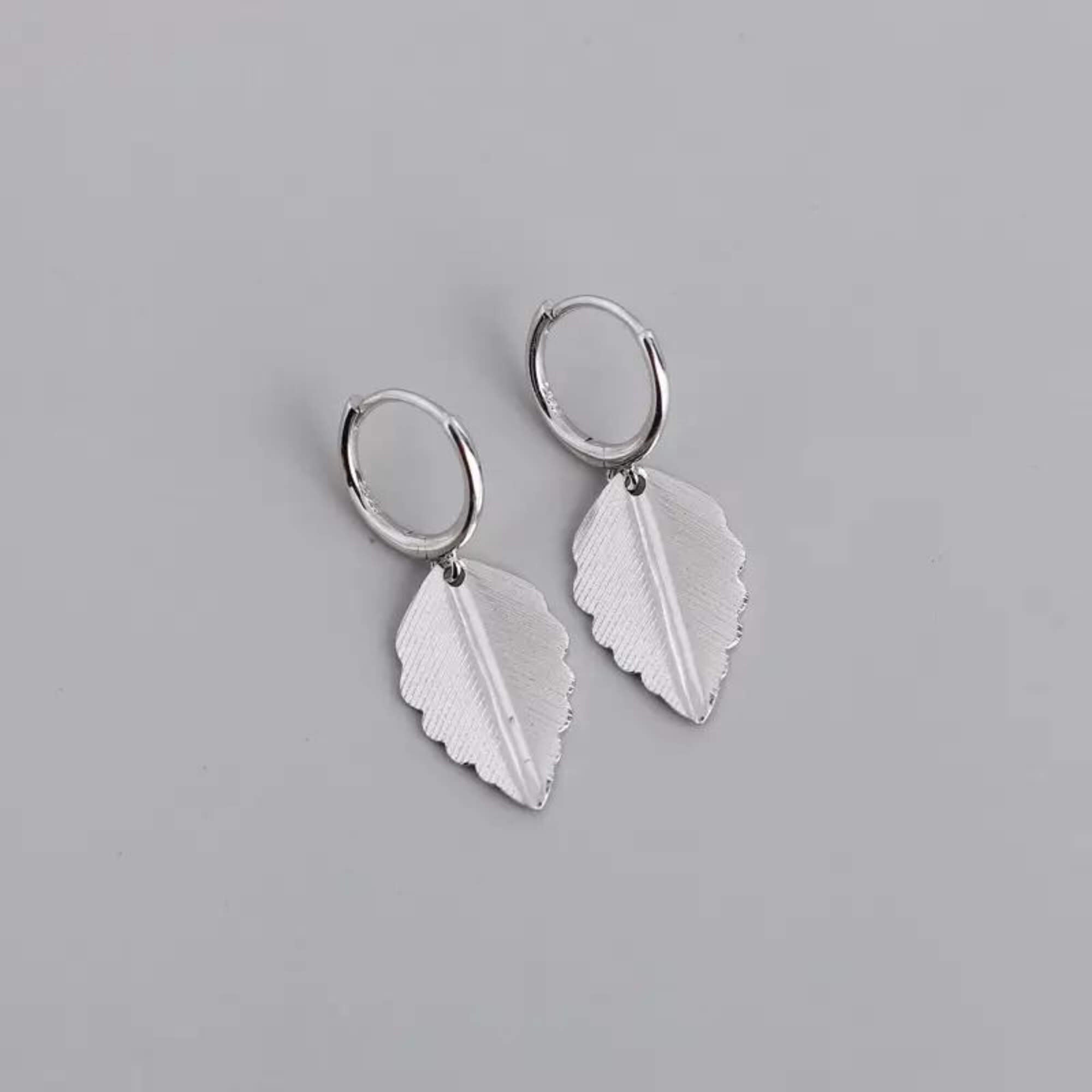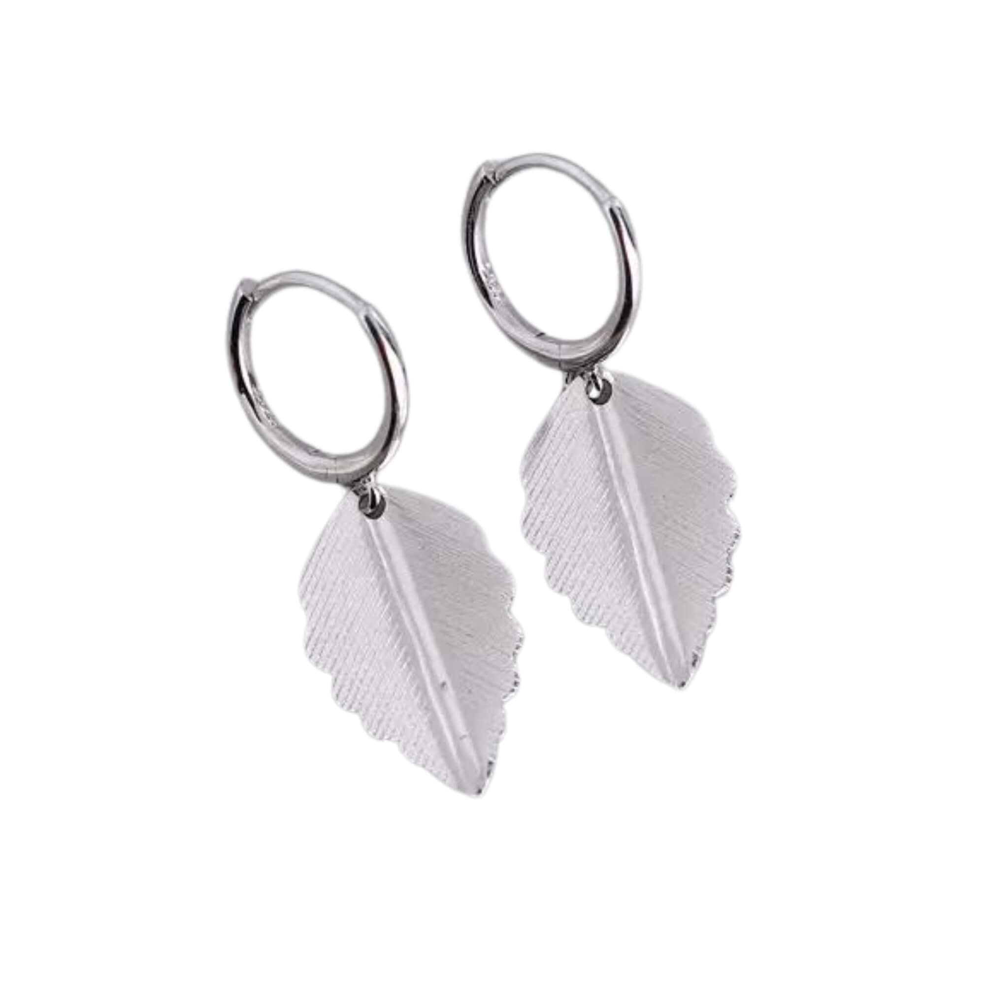 Silver hoop earrings with finely detailed leaf-shaped drops. The soft texture and curved edges resemble the natural lines of foliage, offering a gentle nod to the outdoors. Lightweight and easy to style, they bring a fresh and organic feel to any look.