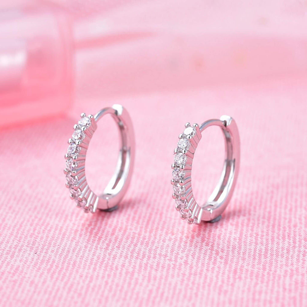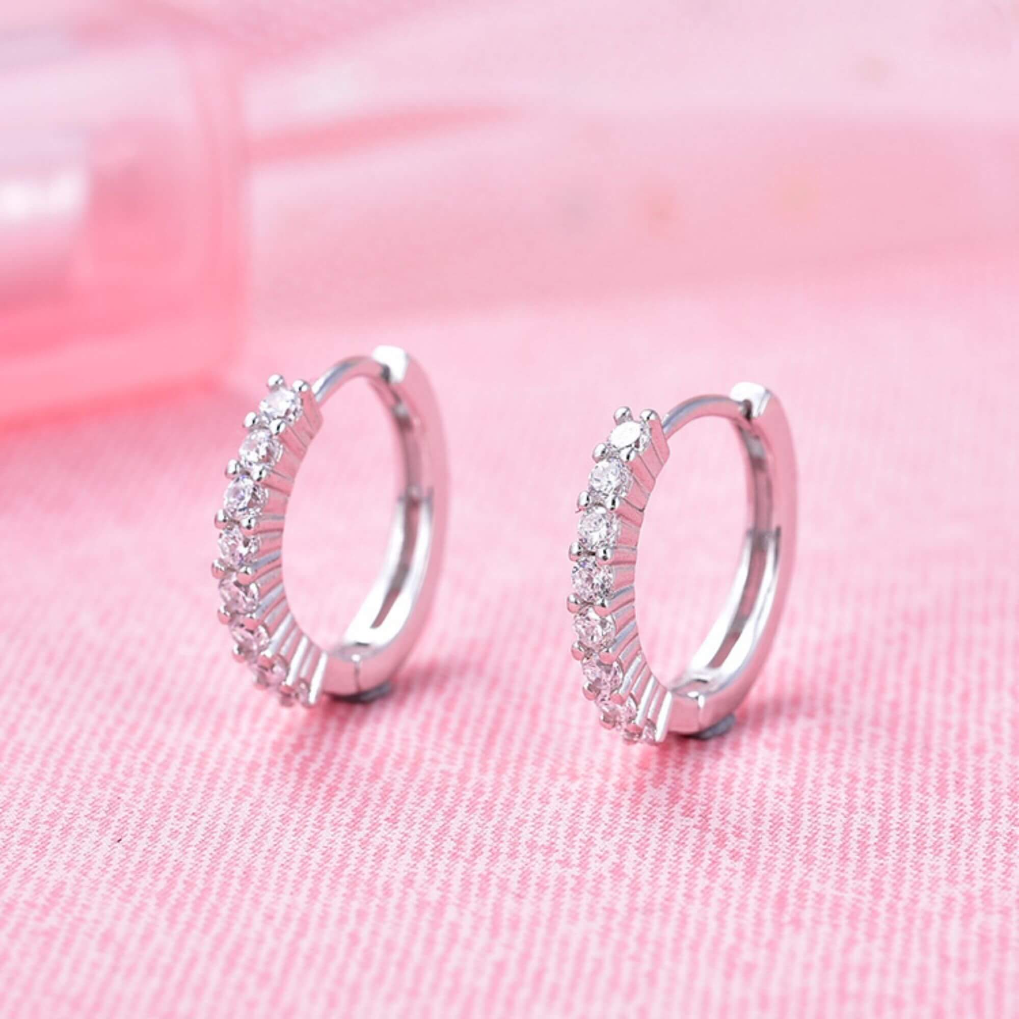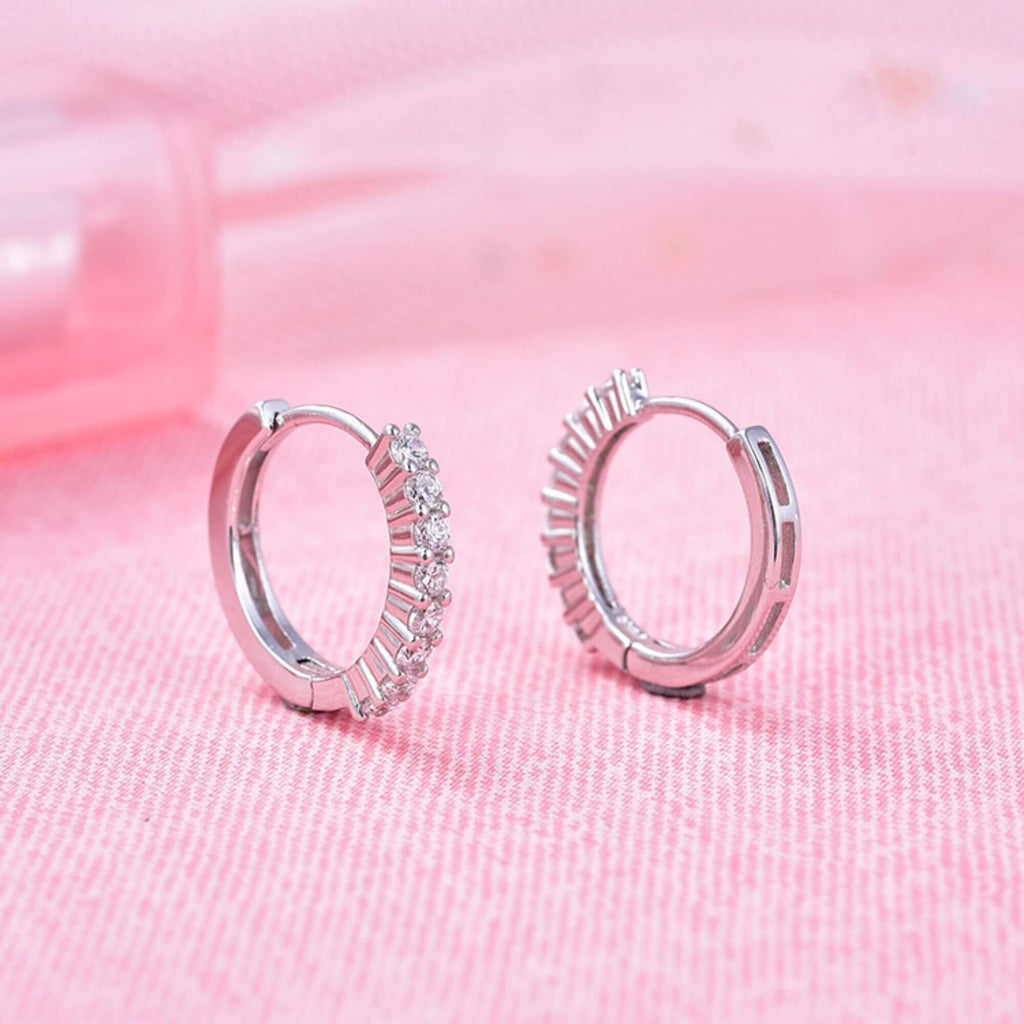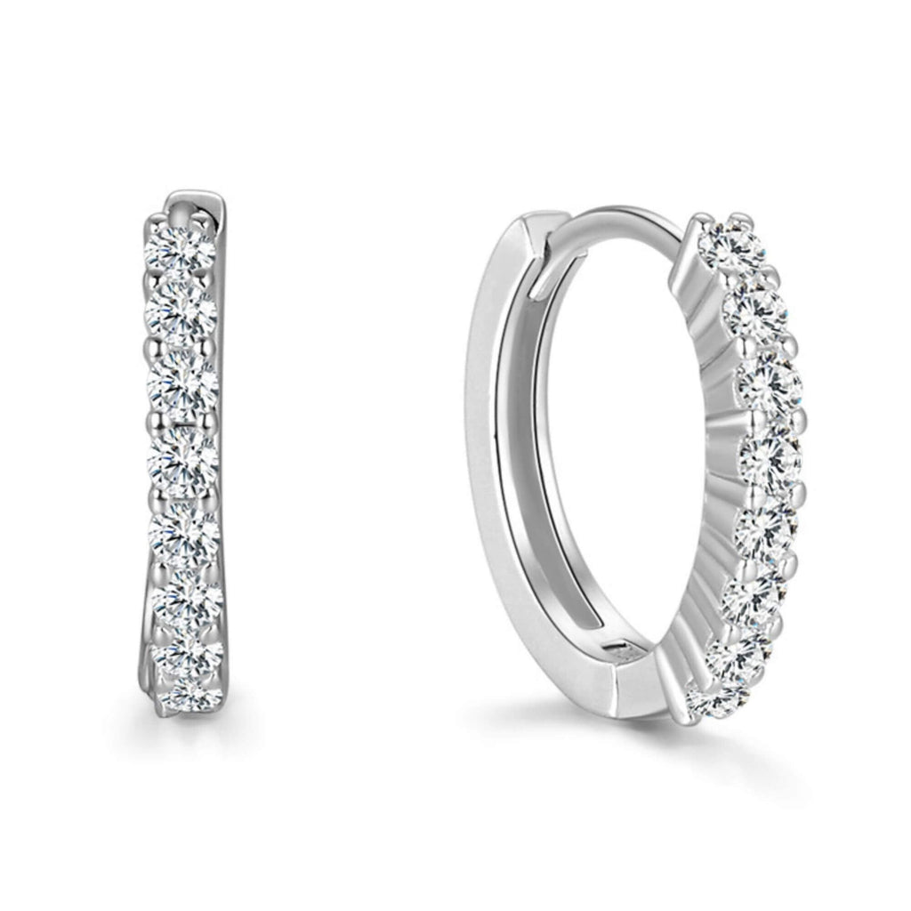 These silver huggie hoops are set with cubic zirconia along the front curve, offering a gentle sparkle that catches the eye. With a diameter of 1.6 cm, they strike a balance between simplicity and detail, making them a reliable choice for everyday wear.