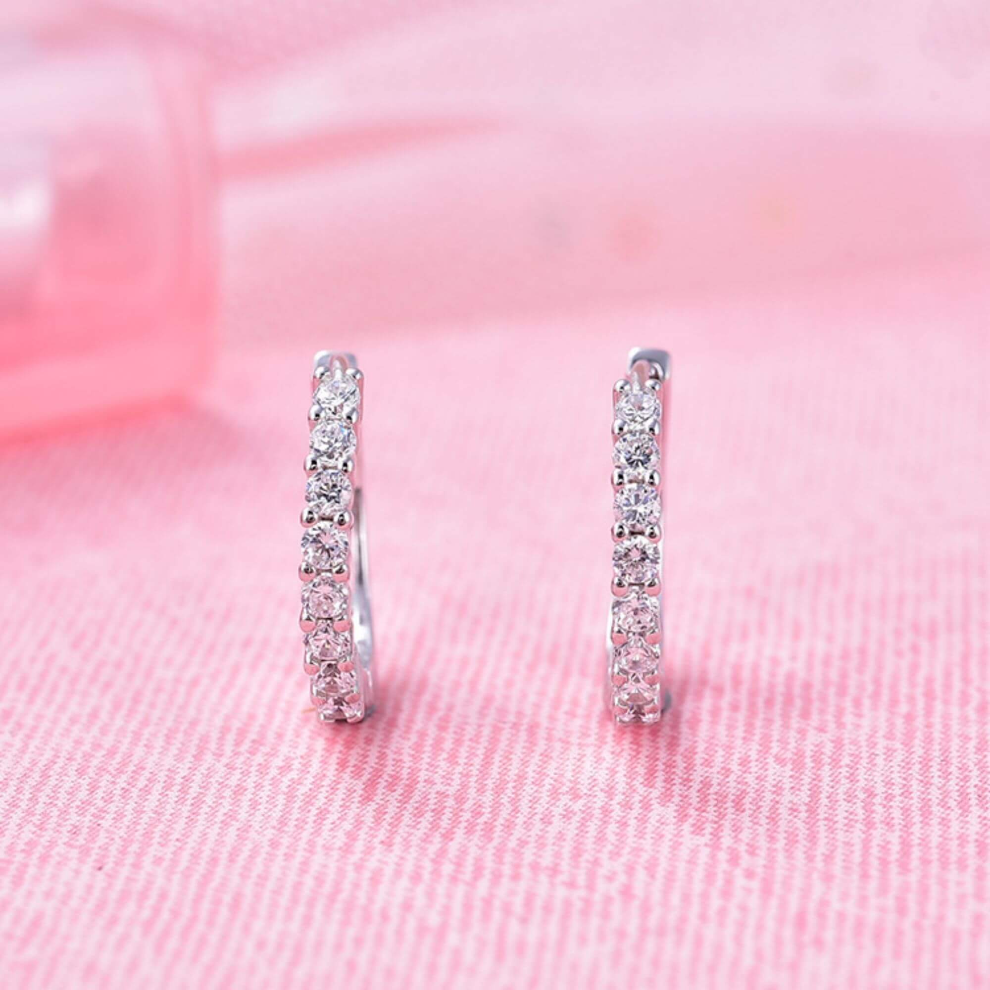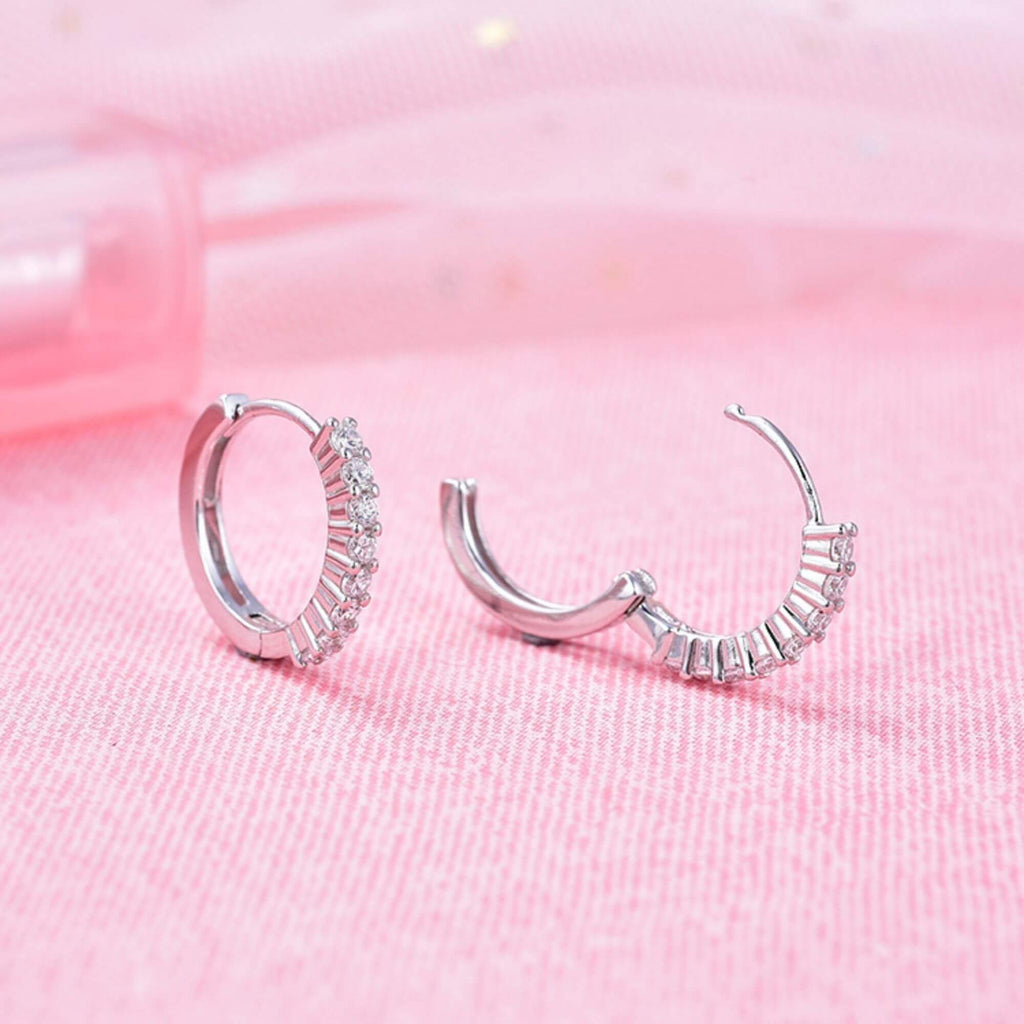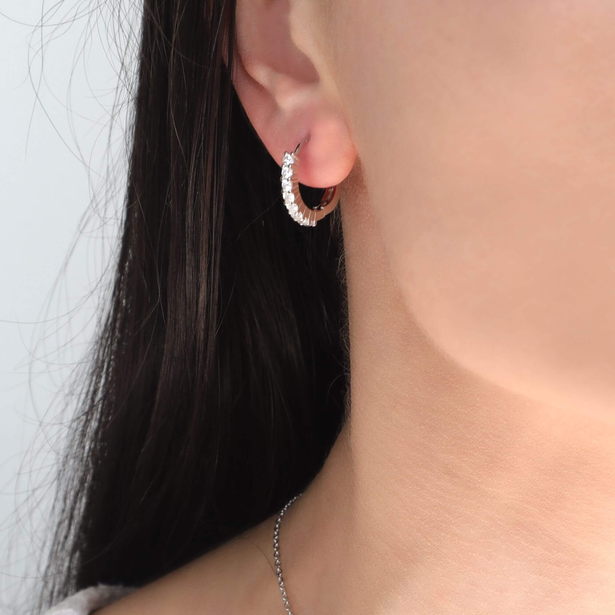 These silver huggie hoops are set with cubic zirconia along the front curve, offering a gentle sparkle that catches the eye. With a diameter of 1.6 cm, they strike a balance between simplicity and detail, making them a reliable choice for everyday wear.