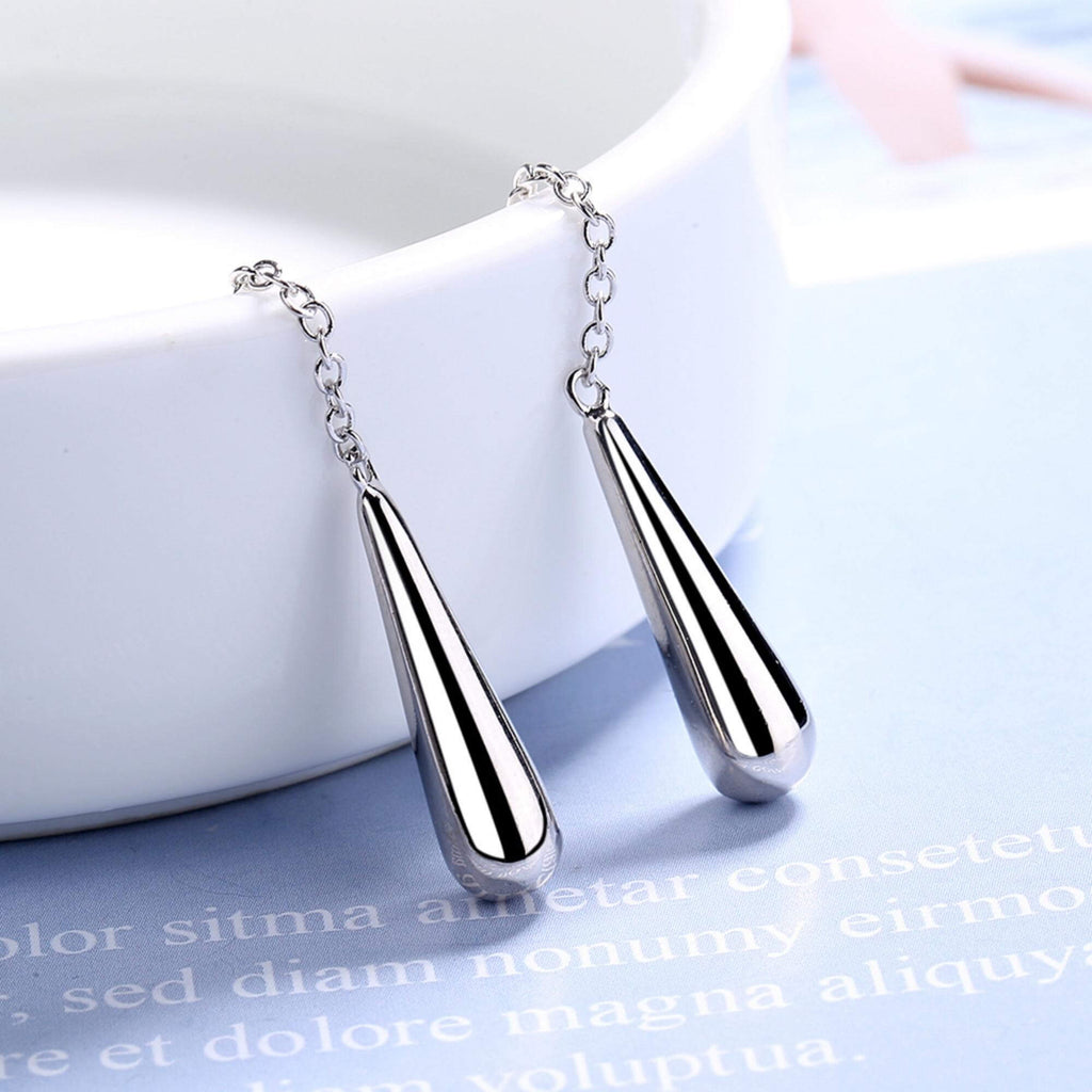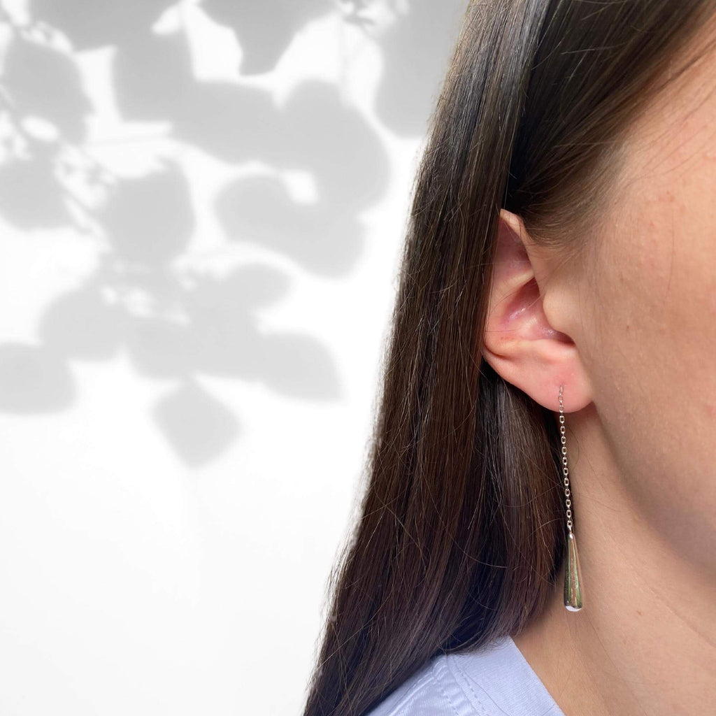 A unique pair of silver earrings featuring a delicate chain and elongated silver elements that fall 6 cm below the ear. The minimalist design offers a bold yet balanced look, with subtle movement that does not overwhelm. A modern piece for those who appreciate thoughtful, contemporary details.