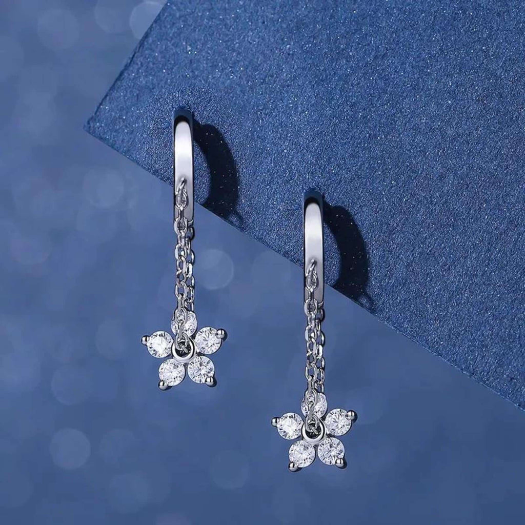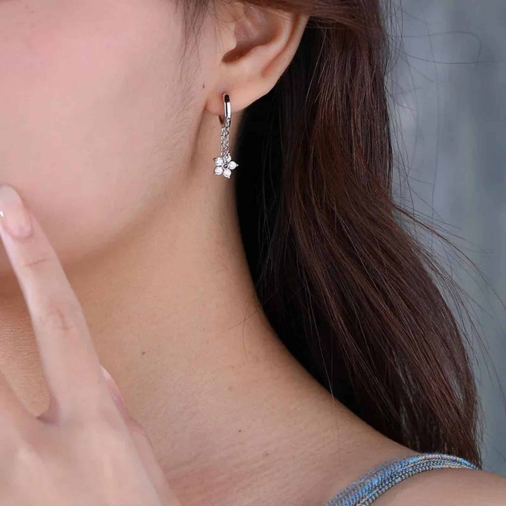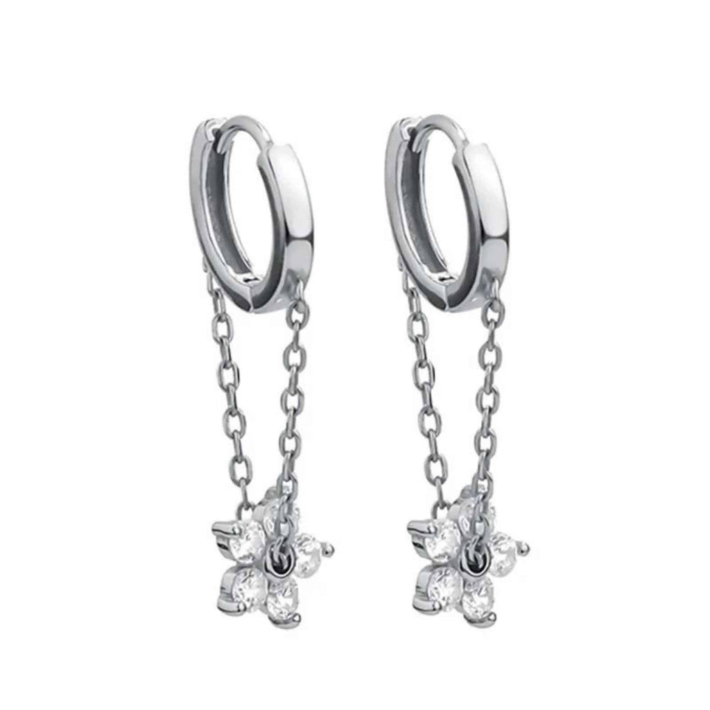 Silver hoop earrings with a detailed flower pendant suspended from a thin chain. A fresh, feminine piece that feels easy to reach for again and again.