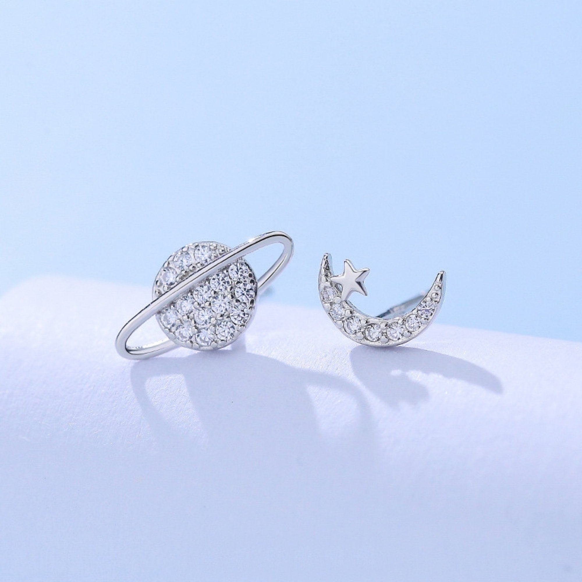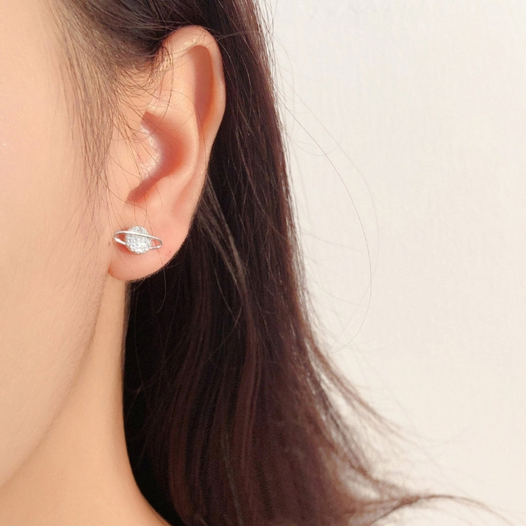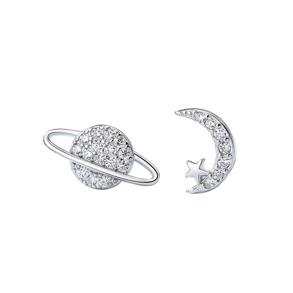 A silver planet with its orbit and a bright star form this astronomy-inspired pair of earrings, each finished with light-catching stones. The design strikes a balance between curiosity and elegance, offering a subtle touch of the cosmos to your everyday look.