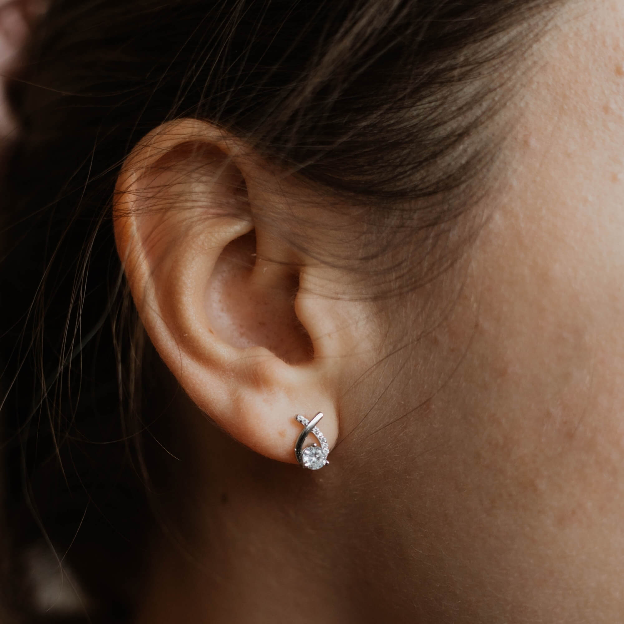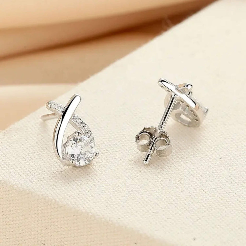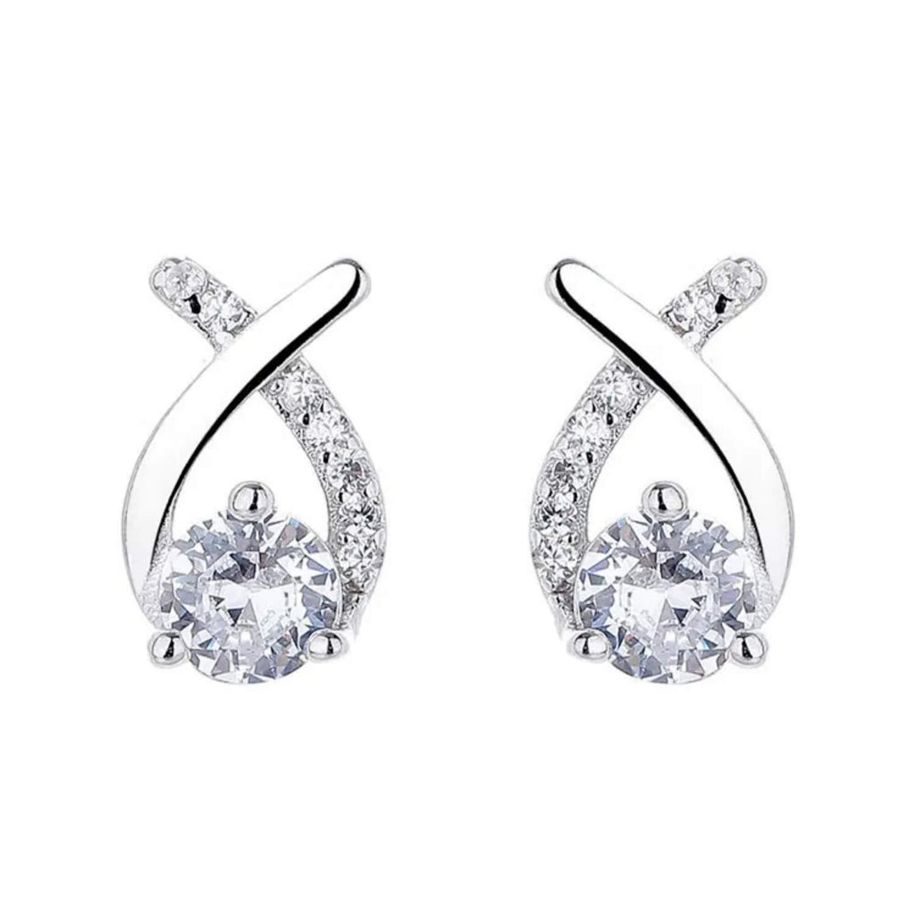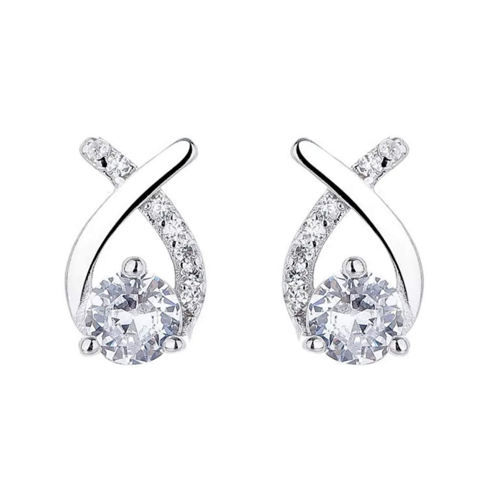 Silver stud earrings with a crossover design, featuring a round cubic zirconia at the center and smaller stones set along one side. The detailing gives them a balanced, elegant look without feeling overly formal. A clean, understated piece that still draws the eye.
