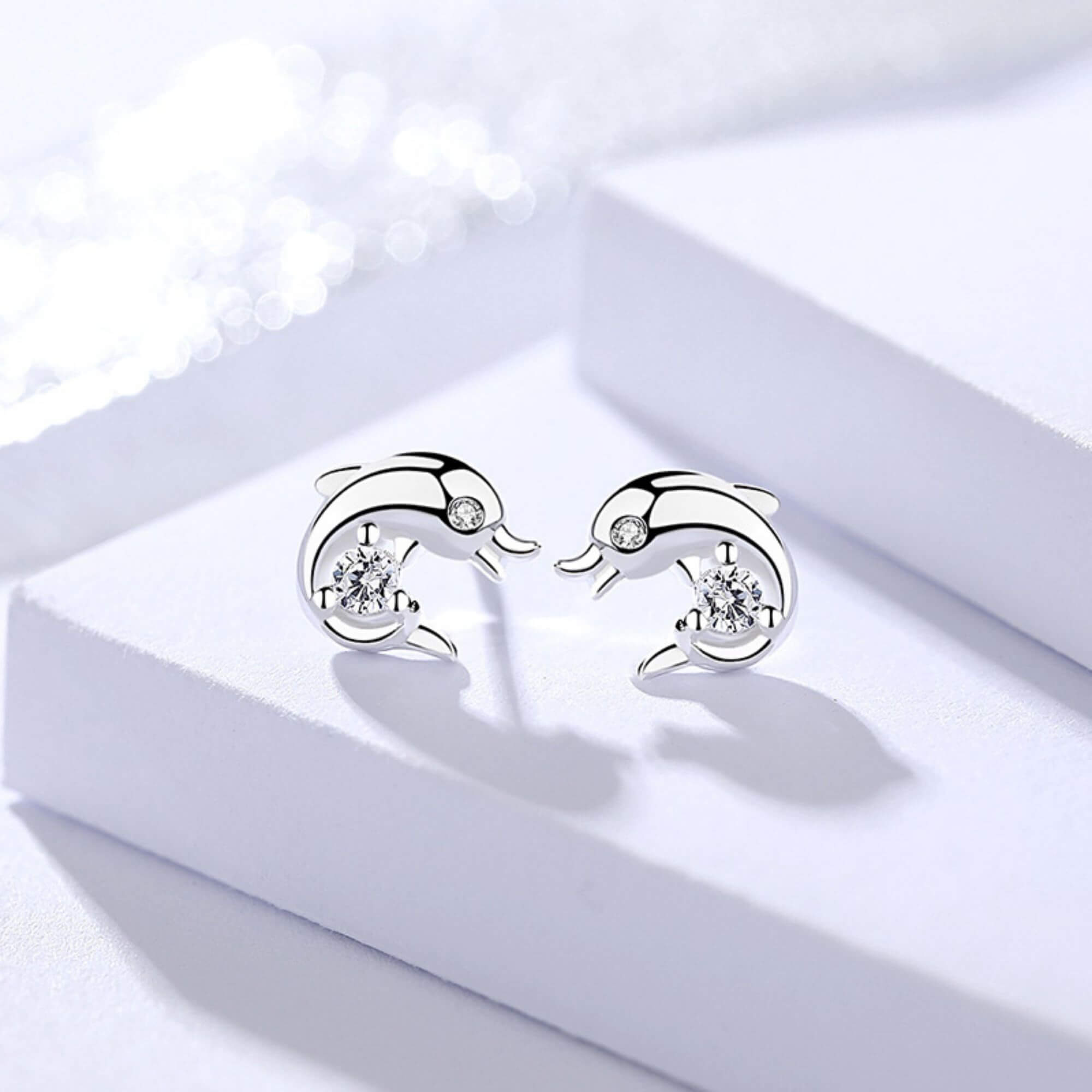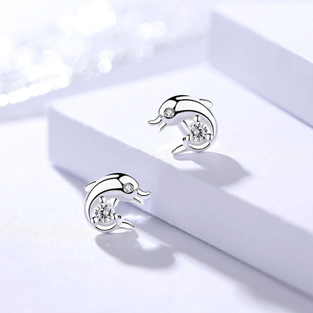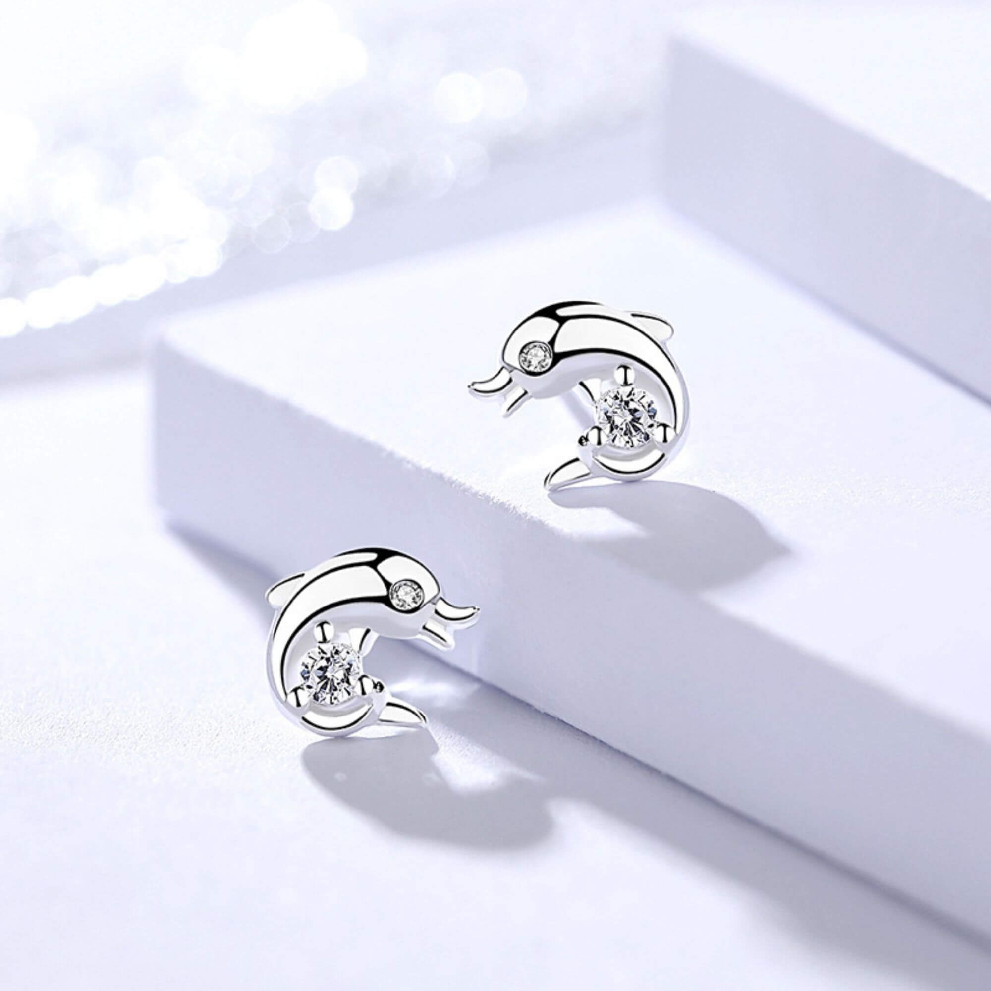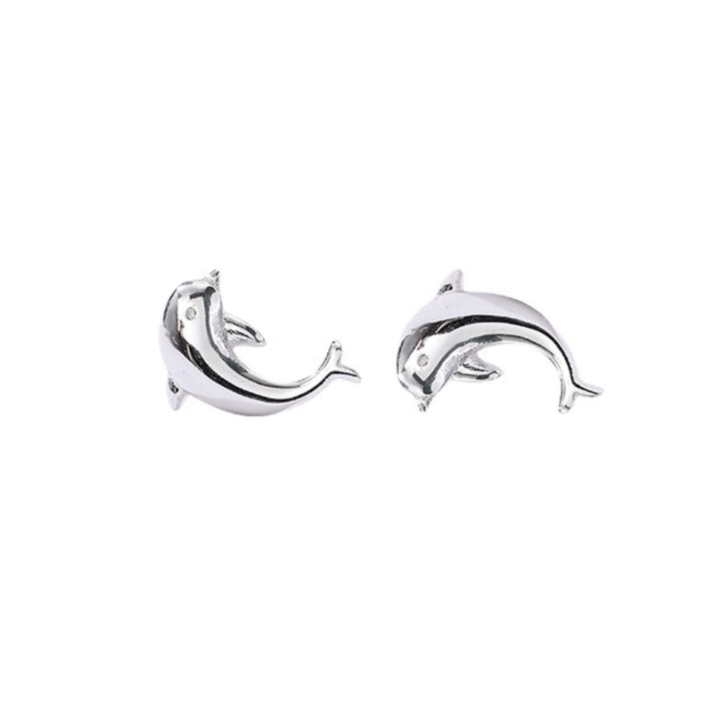 Silver earrings in the shape of a dolphin, available in two styles – one with a smooth finish, the other with added cubic zirconia for a gentle shimmer. A playful, lighthearted design that makes a sweet gift or a favorite pick for ocean lovers.
