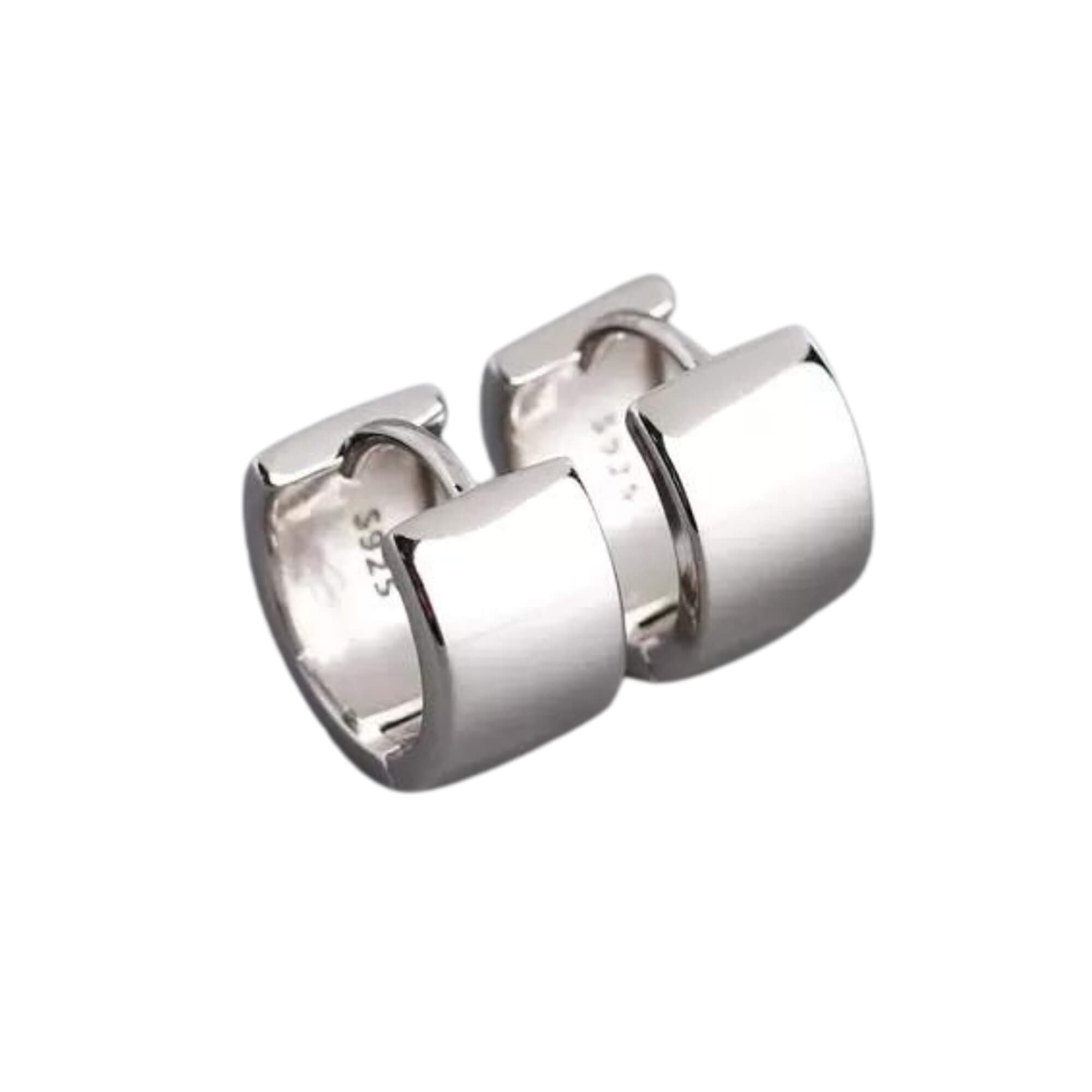 Thick silver huggie earrings with a bold shape and smooth surface that gives them a strong, modern presence. Compact but striking, they sit close to the ear and work beautifully on their own or layered with other earrings. A clean, versatile piece that adds structure and character to any look.