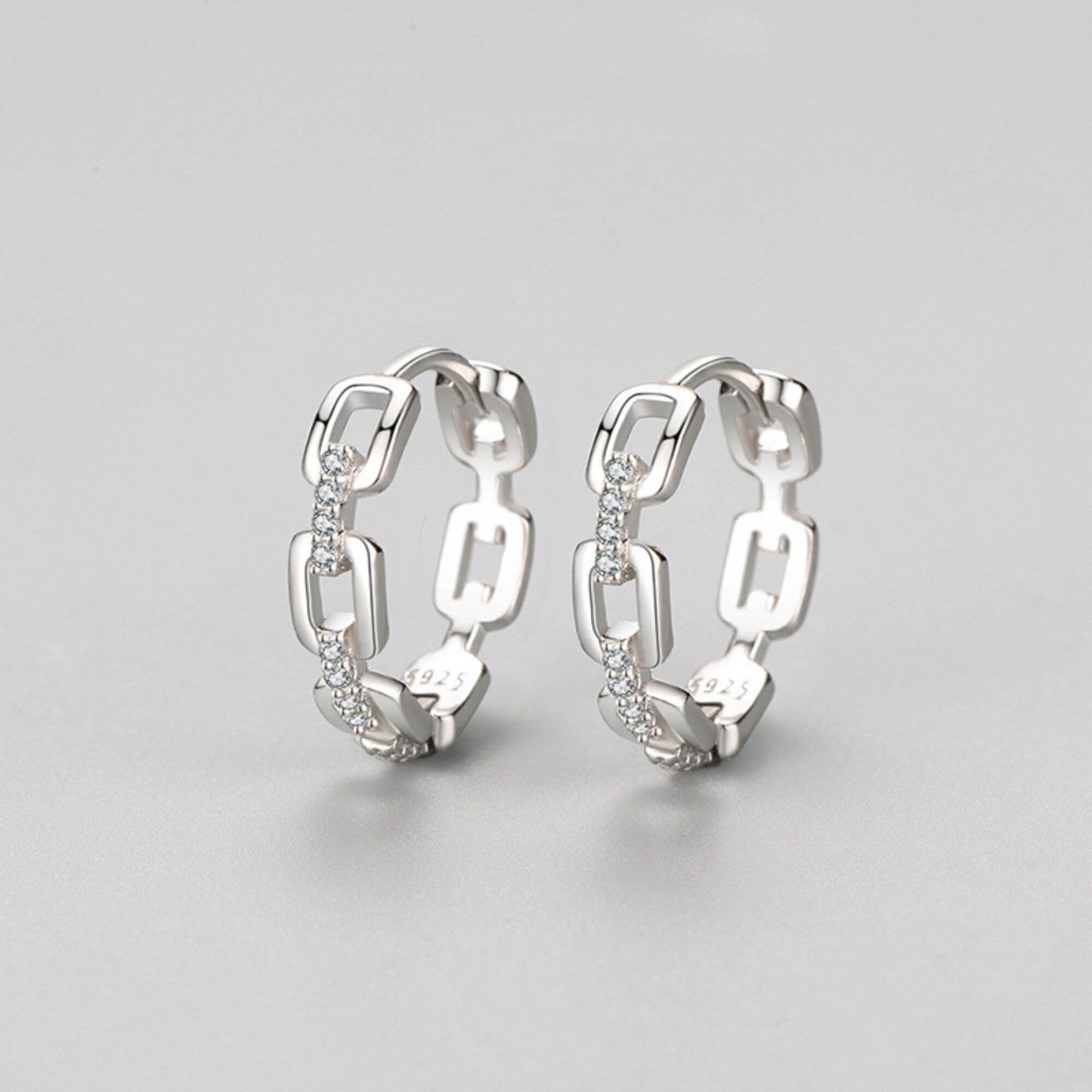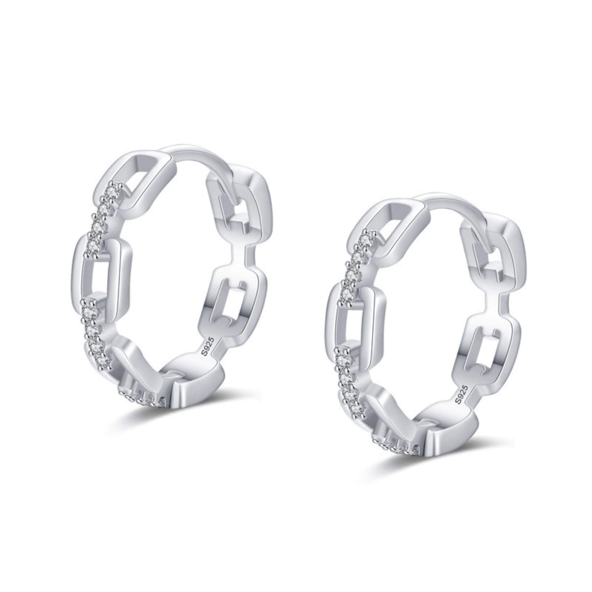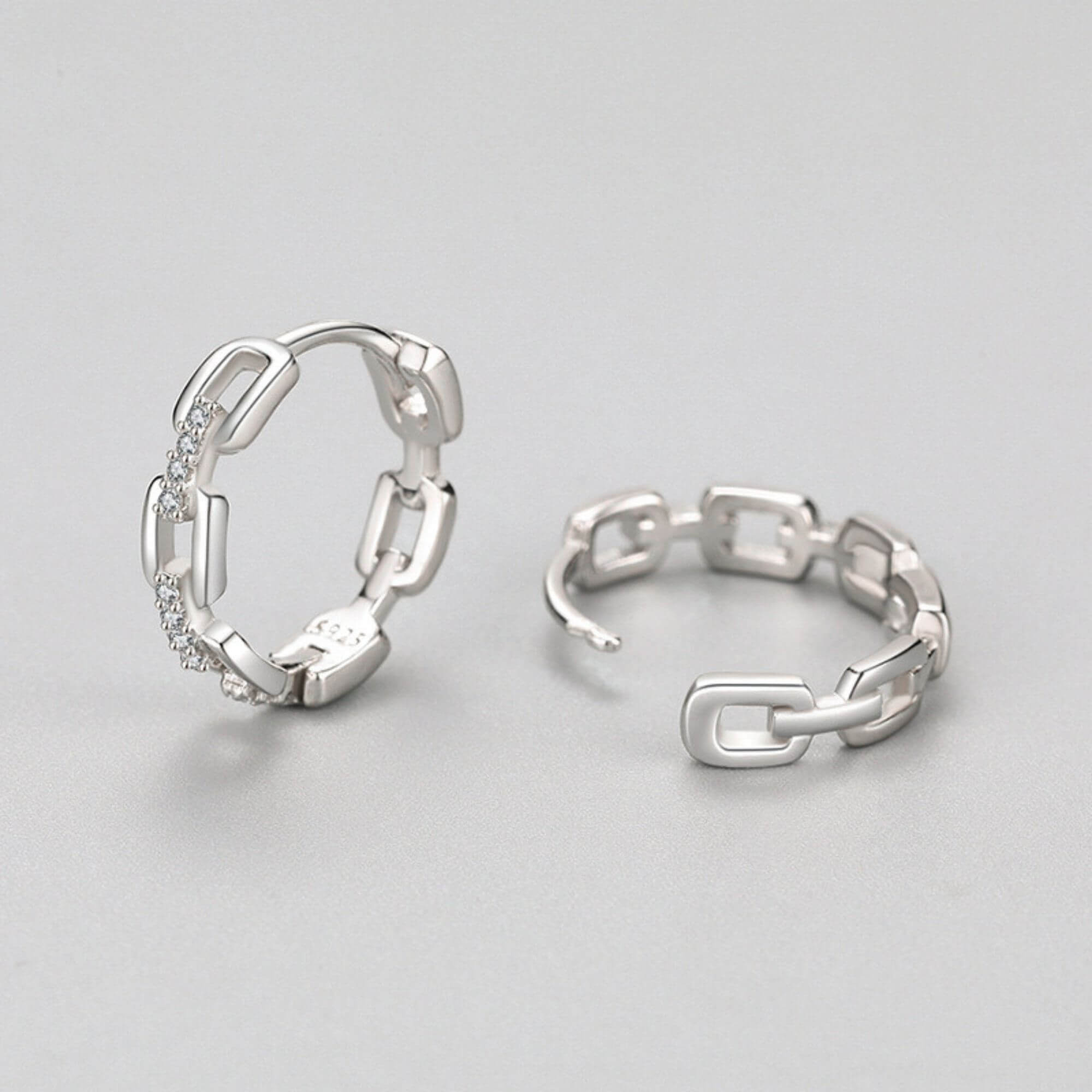 Silver huggie hoop earrings with a chain-inspired design and small cubic zirconia gems. A playful pair, perfect for stacking or wearing on its own for a subtle statement.