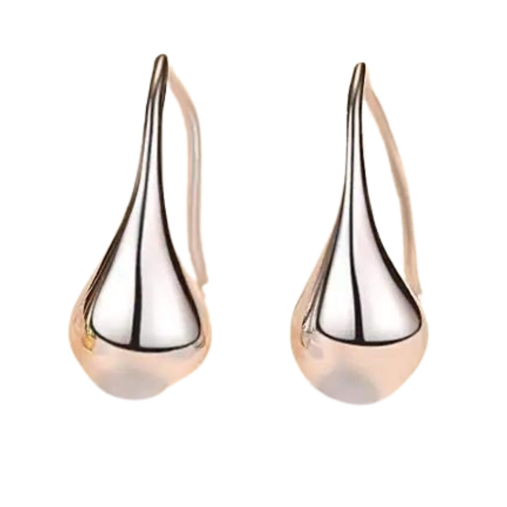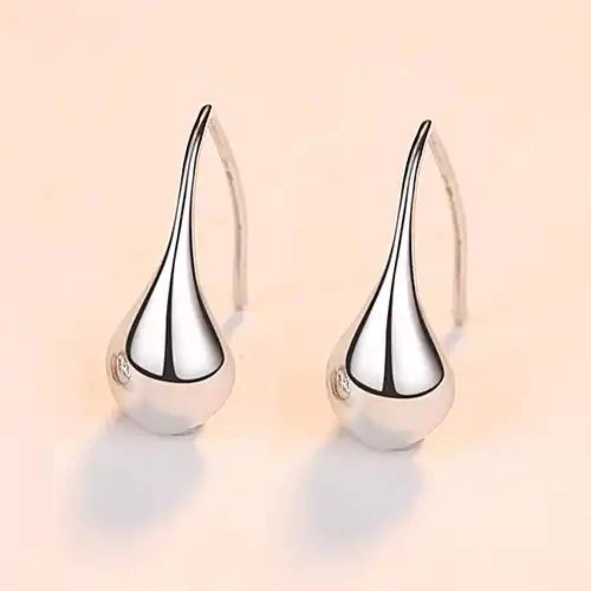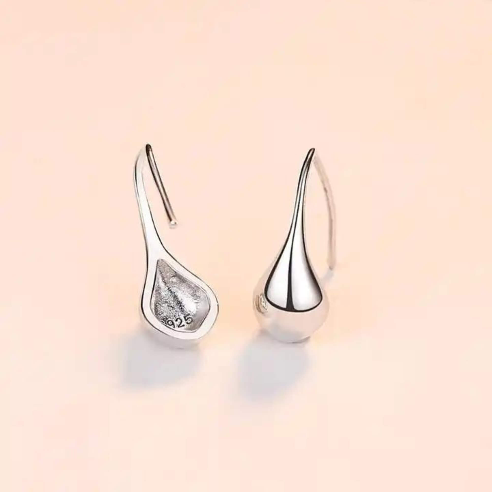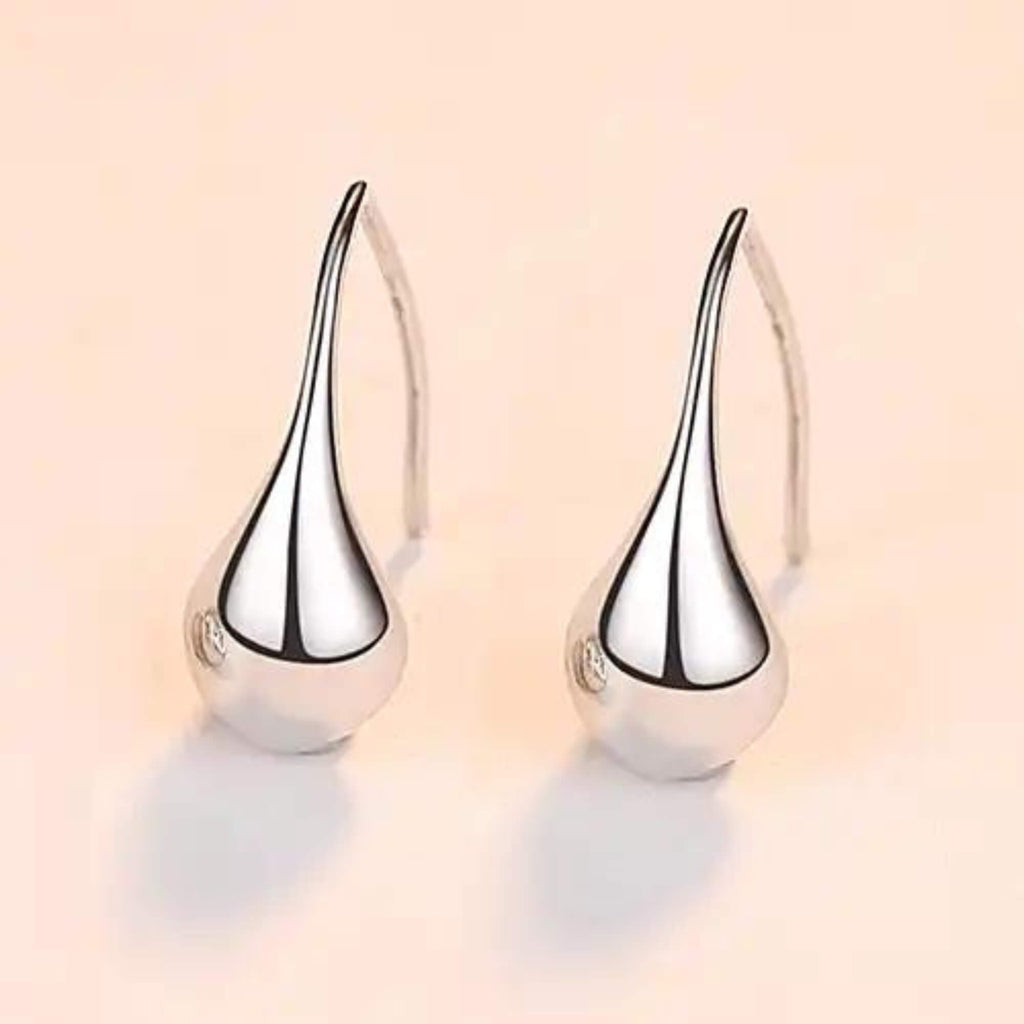 Silver drop earrings with a smooth teardrop shape and a curved hook fastening that slips easily into place. The design is understated yet distinctive, offering a simple everyday choice that feels contemporary.