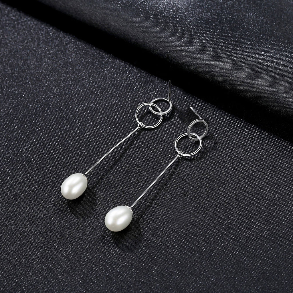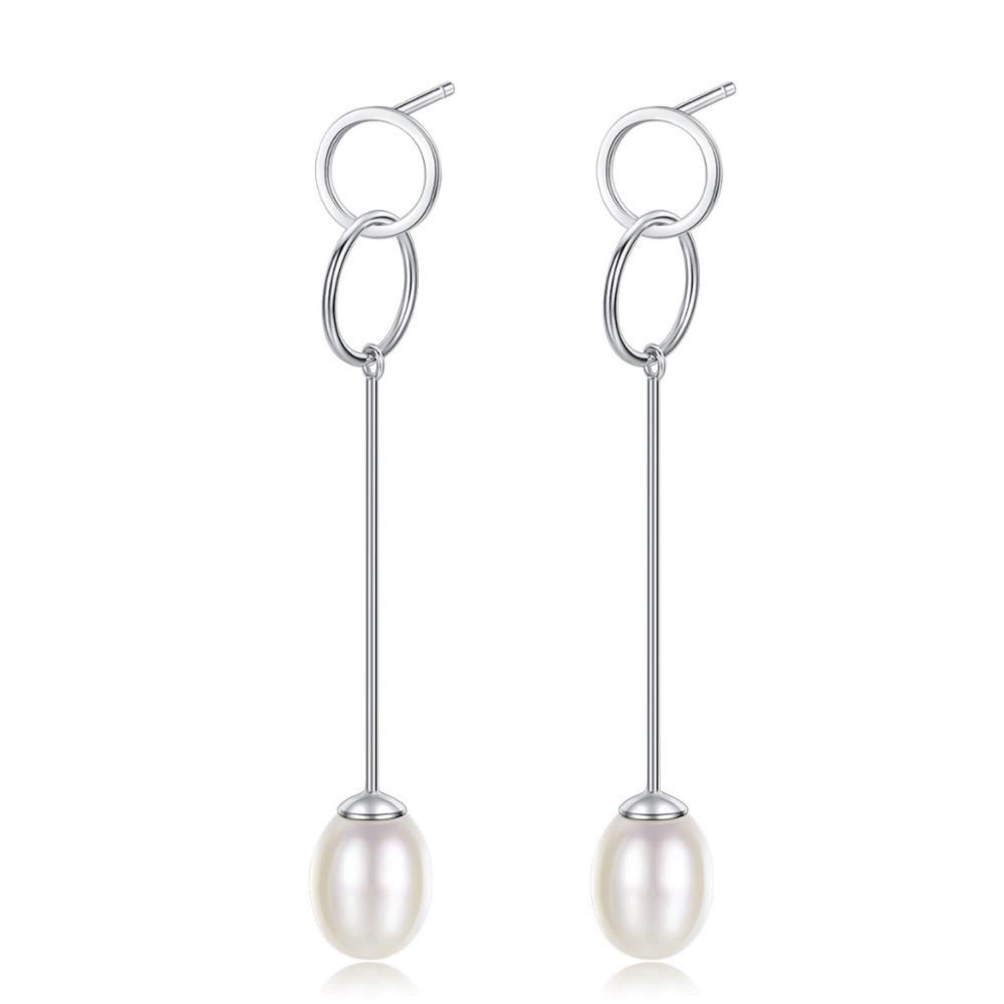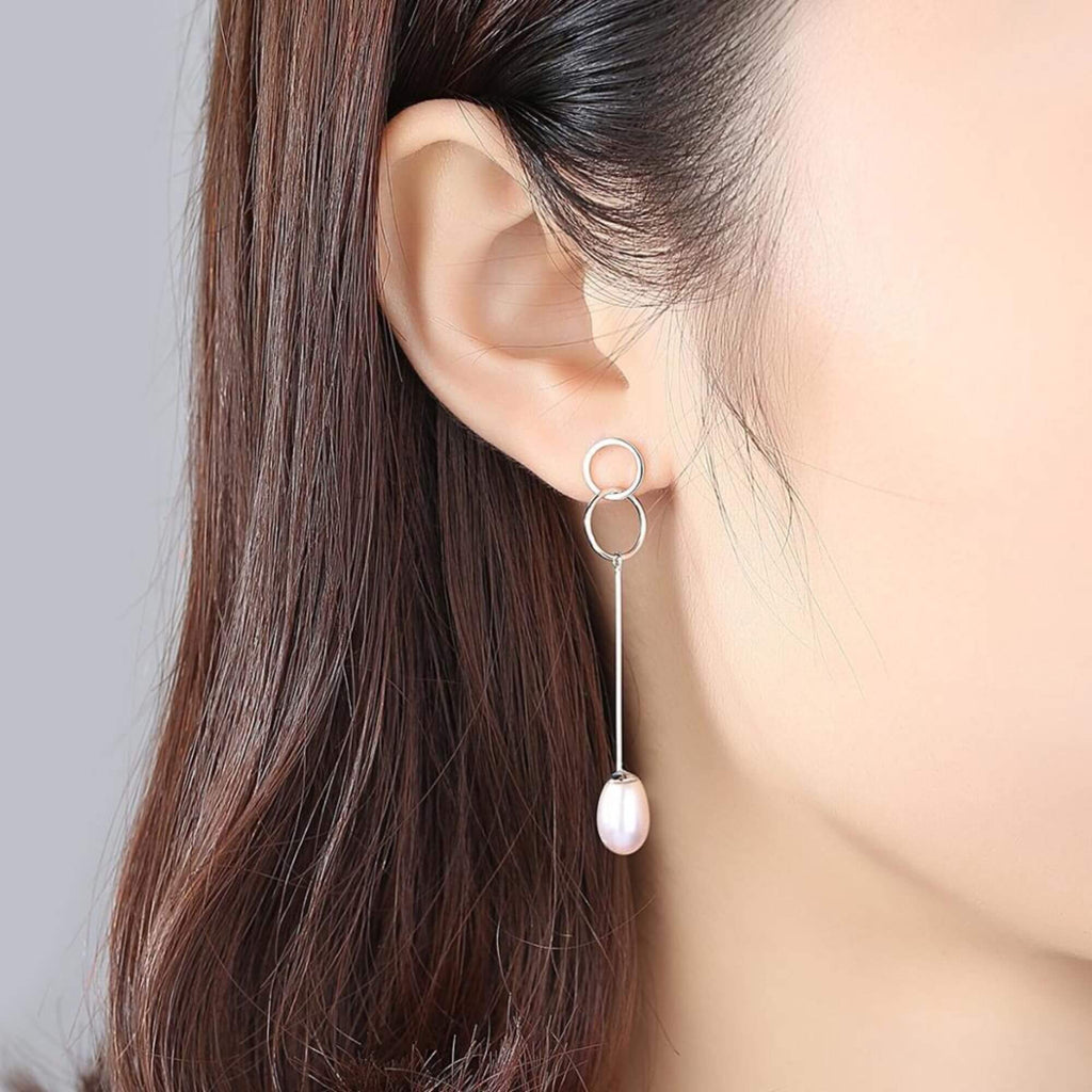 Silver earrings with a pearl drop suspended from two interlocking hoops. A contemporary design that stands out with a calm, balanced feel.