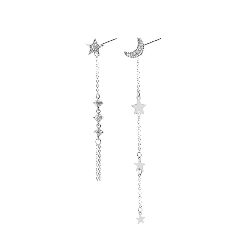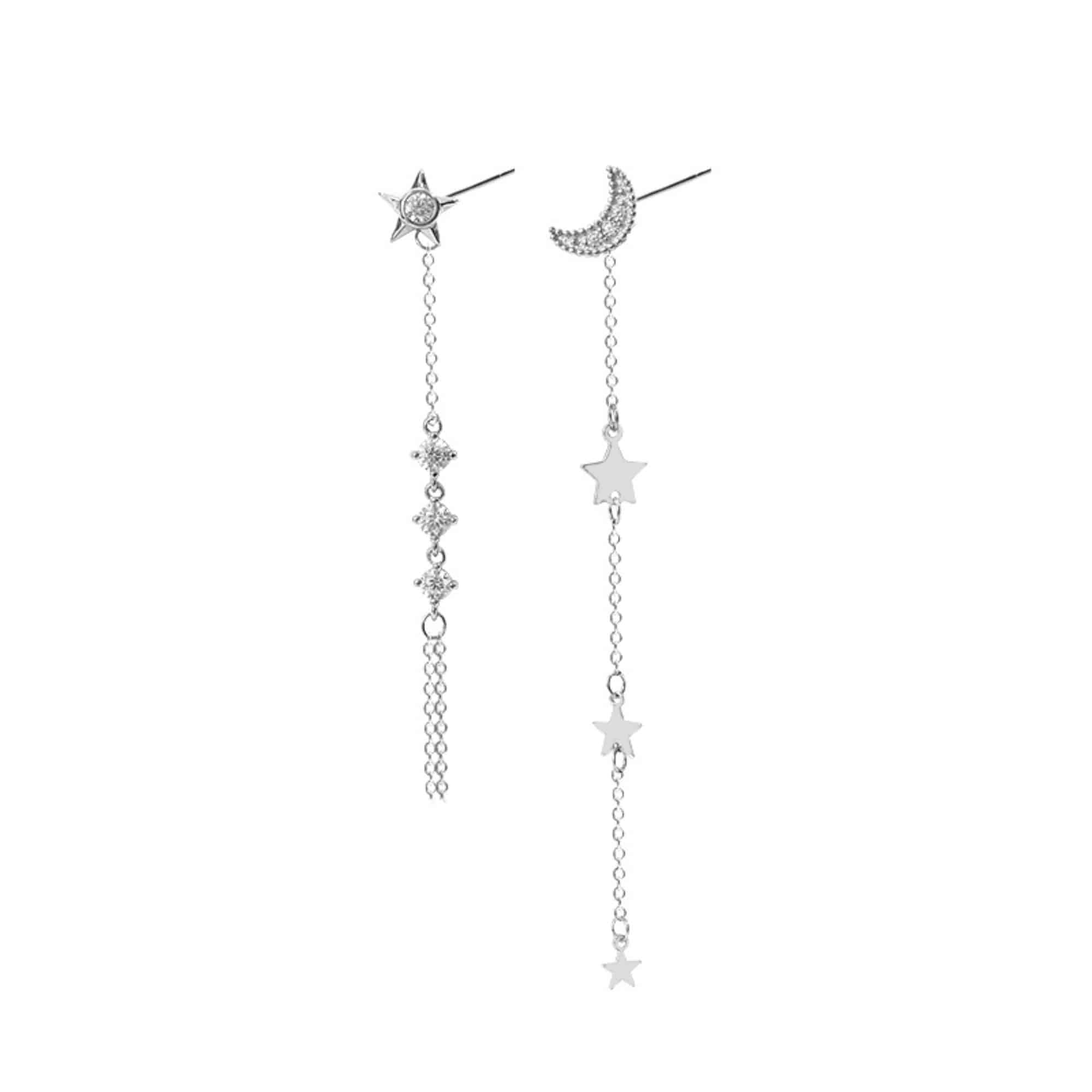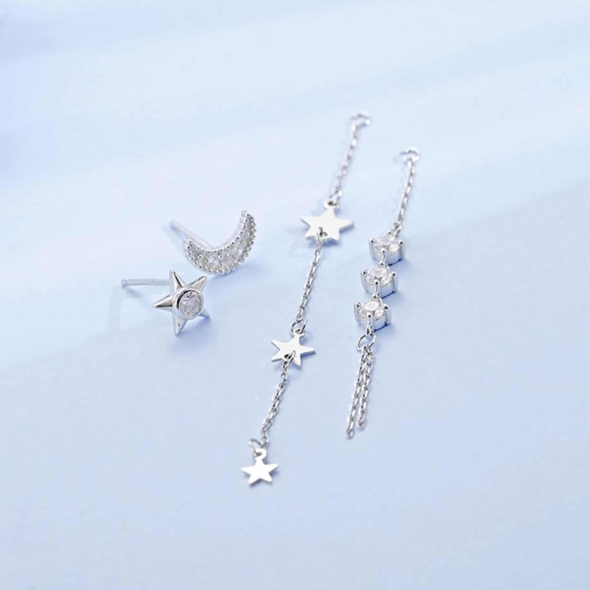A pair of silver earrings that plays with contrast – a star on one side and a crescent moon on the other. The delicate charms add texture and shimmer, while the detachable drops let you change up the look. Wear them your way – subtle or statement.