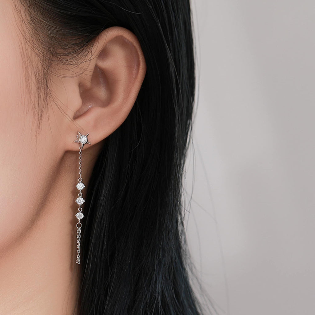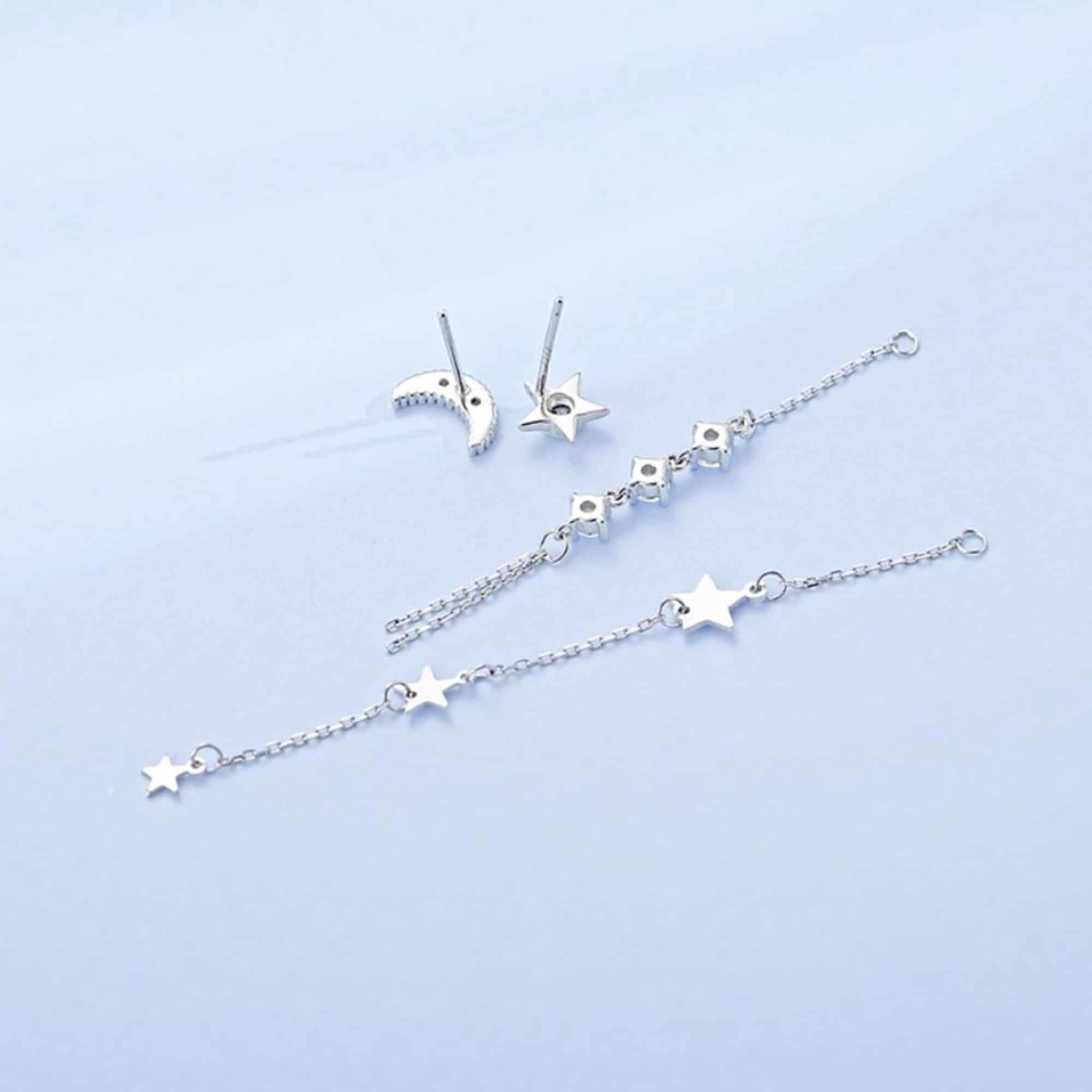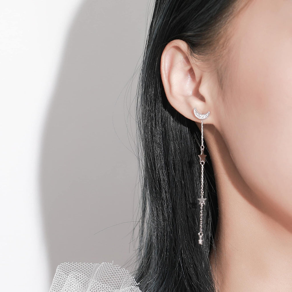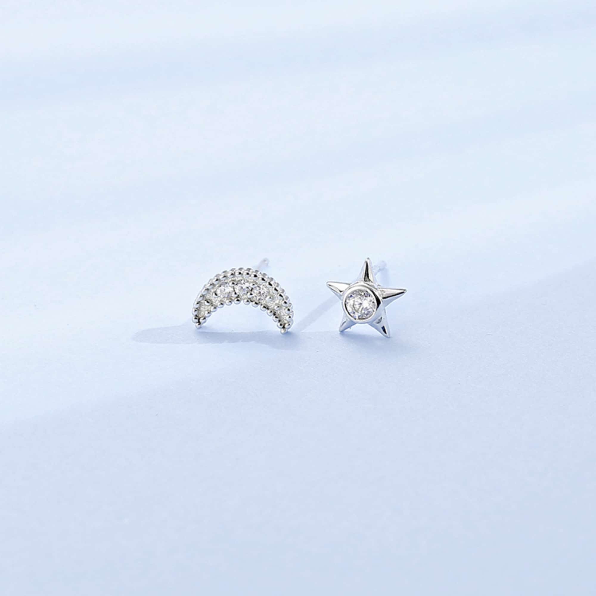 A pair of silver earrings that plays with contrast – a star on one side and a crescent moon on the other. The delicate charms add texture and shimmer, while the detachable drops let you change up the look. Wear them your way – subtle or statement.