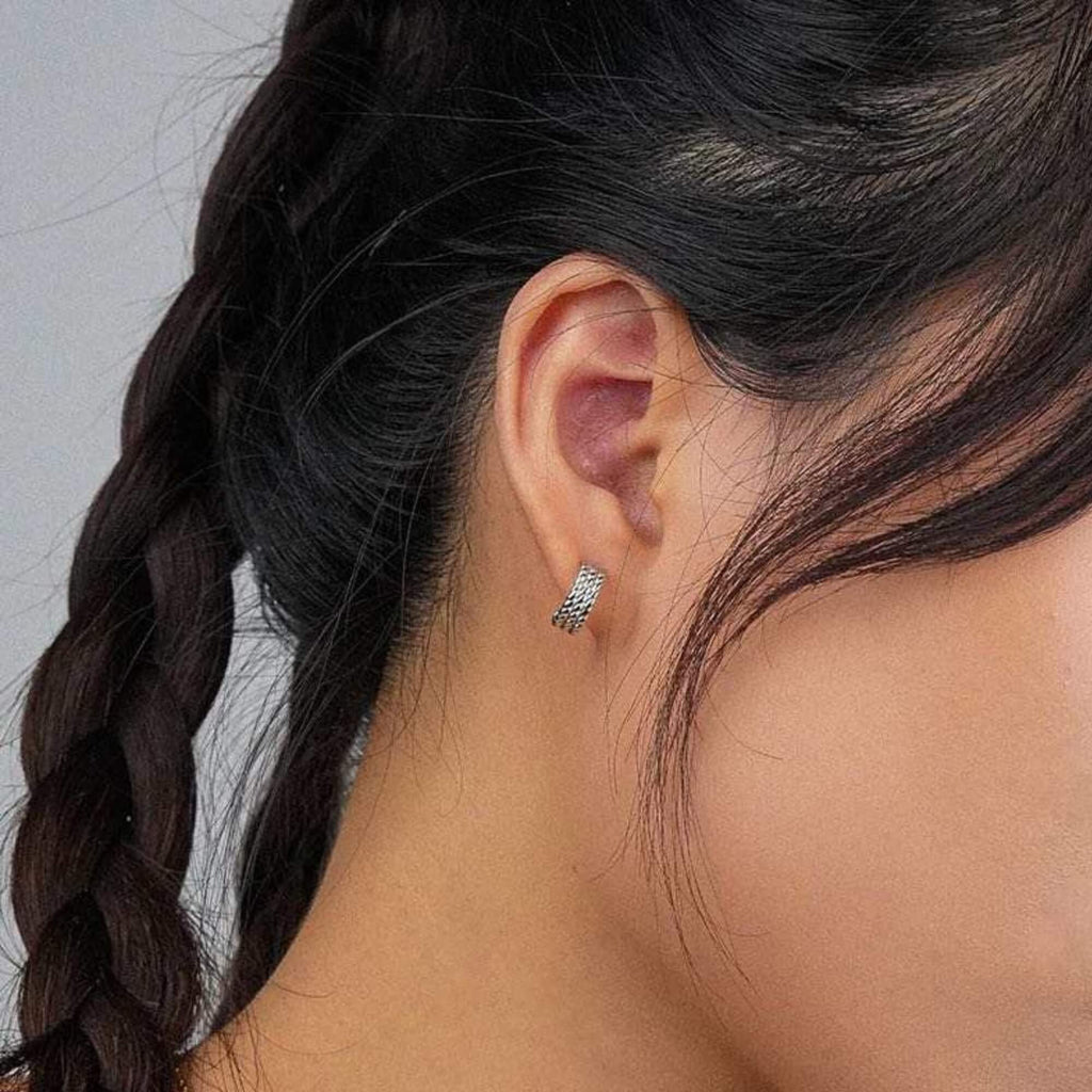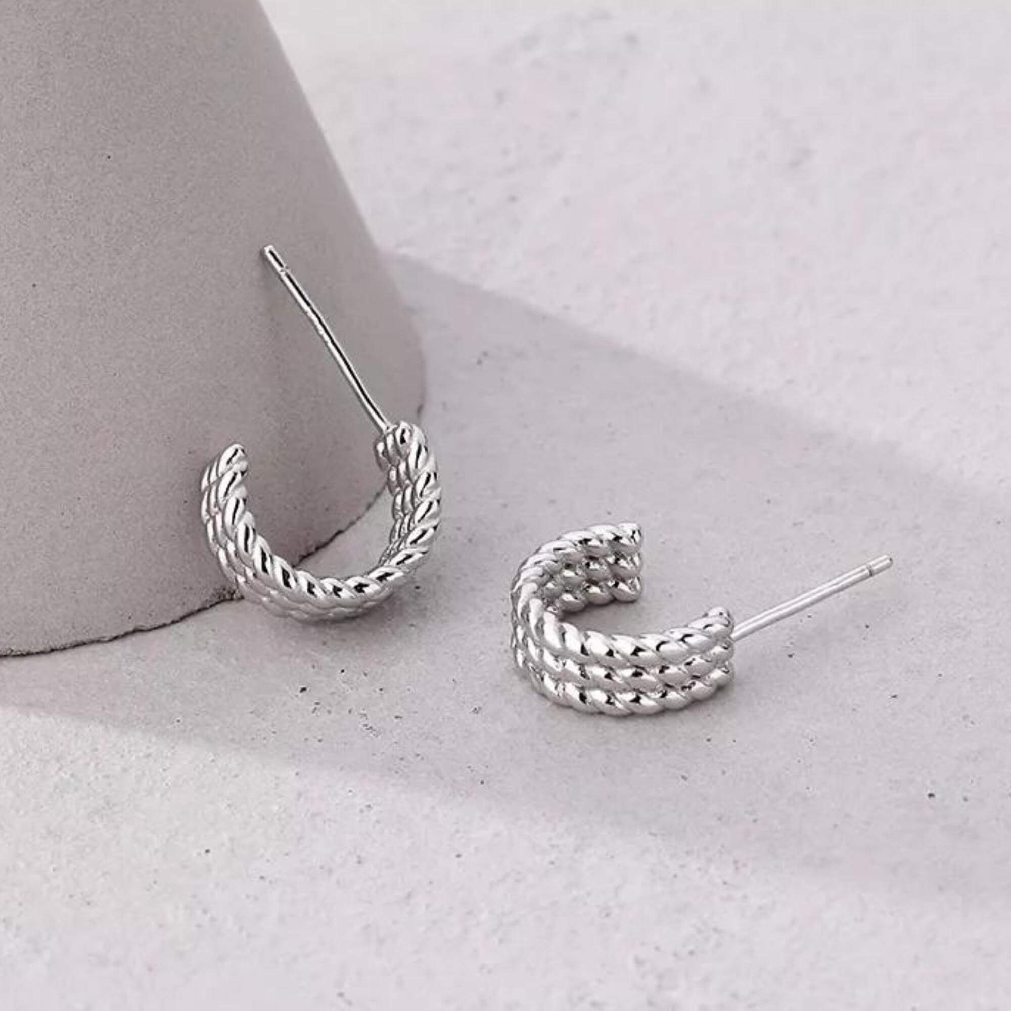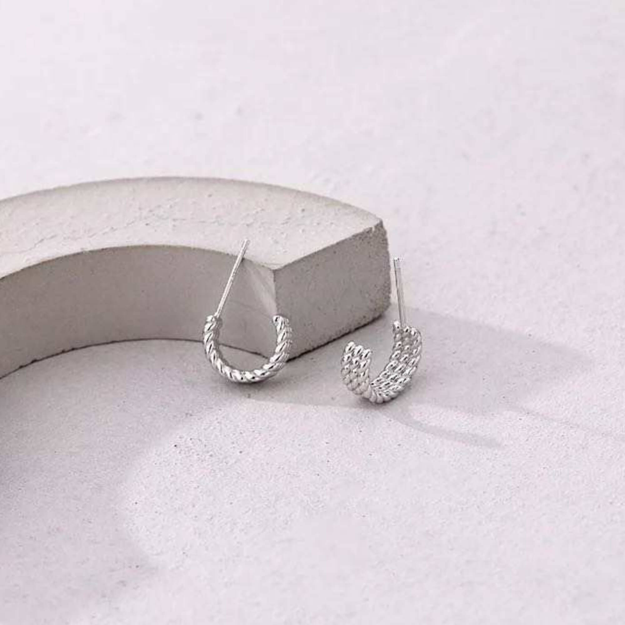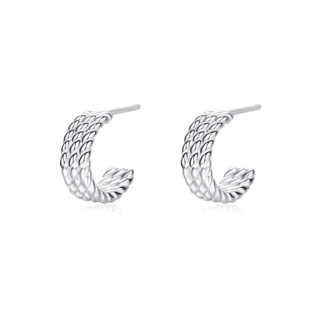 Petite silver earrings in a half-hoop shape, featuring a raised, braided texture that adds depth to the design. Finished with a secure push-back closure, they are lightweight and easy to wear throughout the day. A subtle and stylish option for those who appreciate simple pieces with a bit of detail.