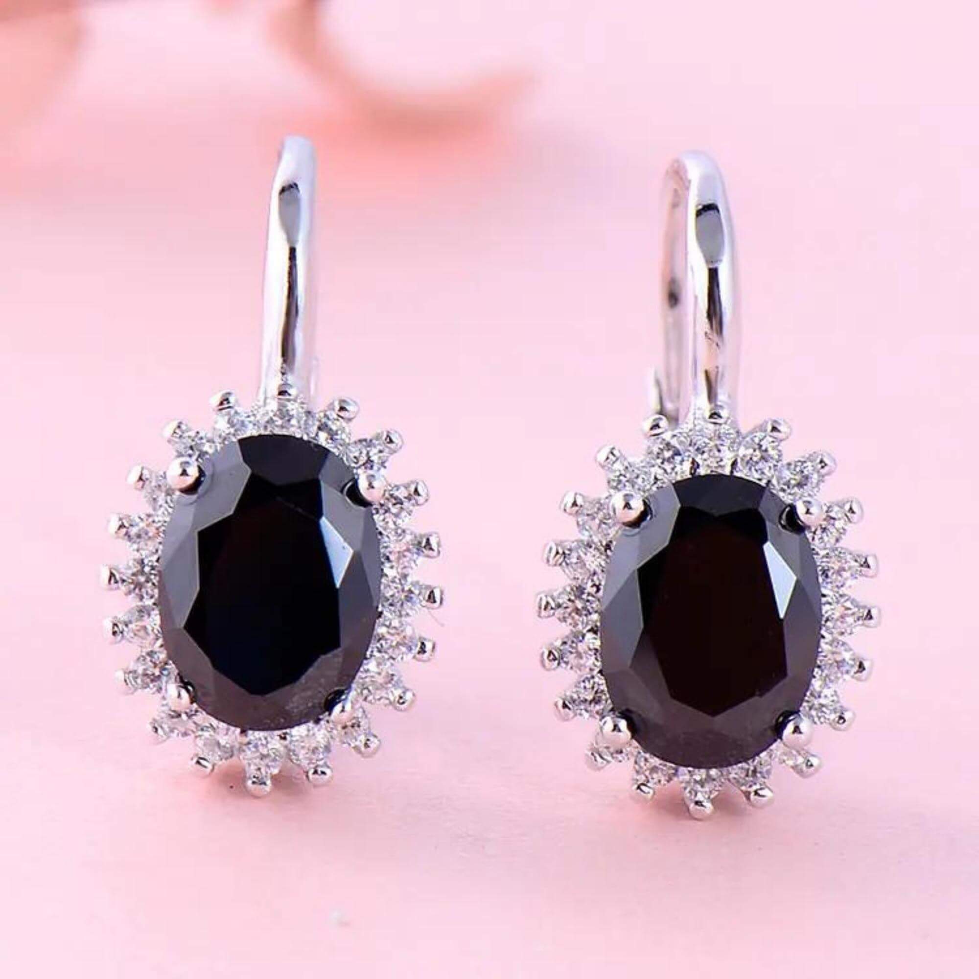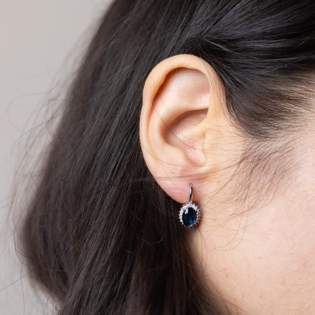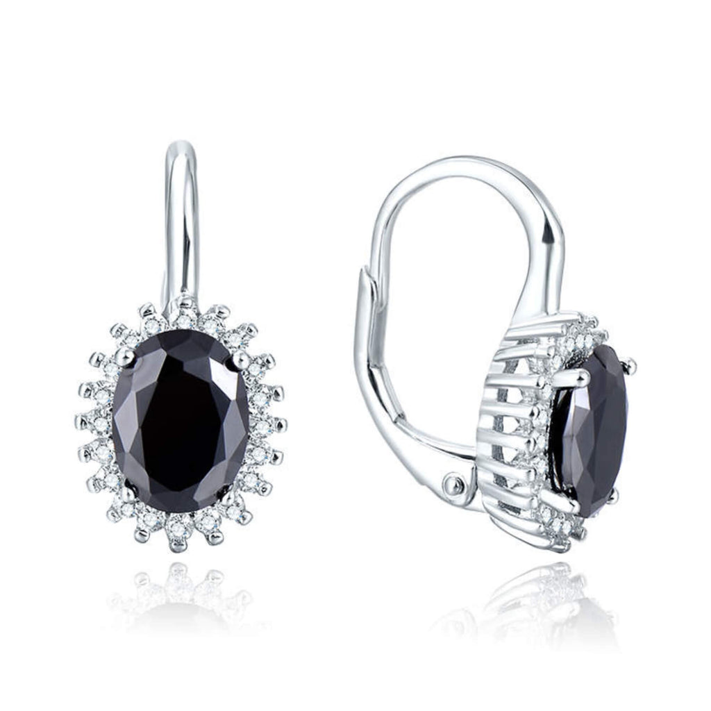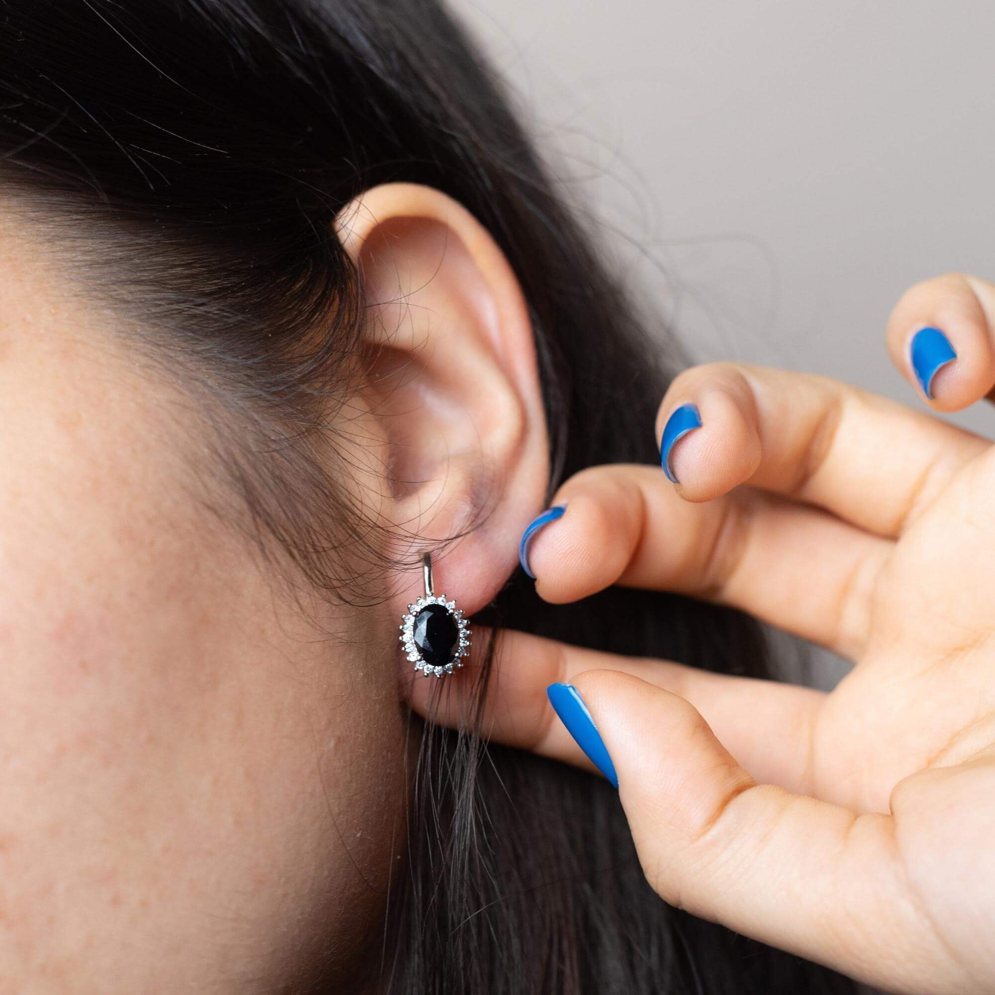 Silver earrings featuring an oval-cut crystal in blue or black, surrounded by smaller cubic zirconia gems. The contrast between the center stone and the frame gives the piece structure and color without being too bold.