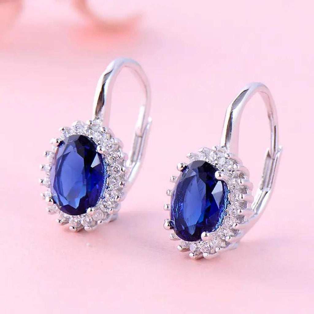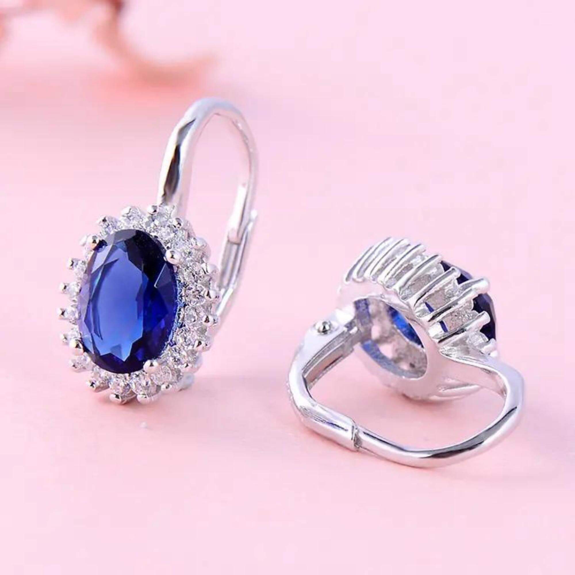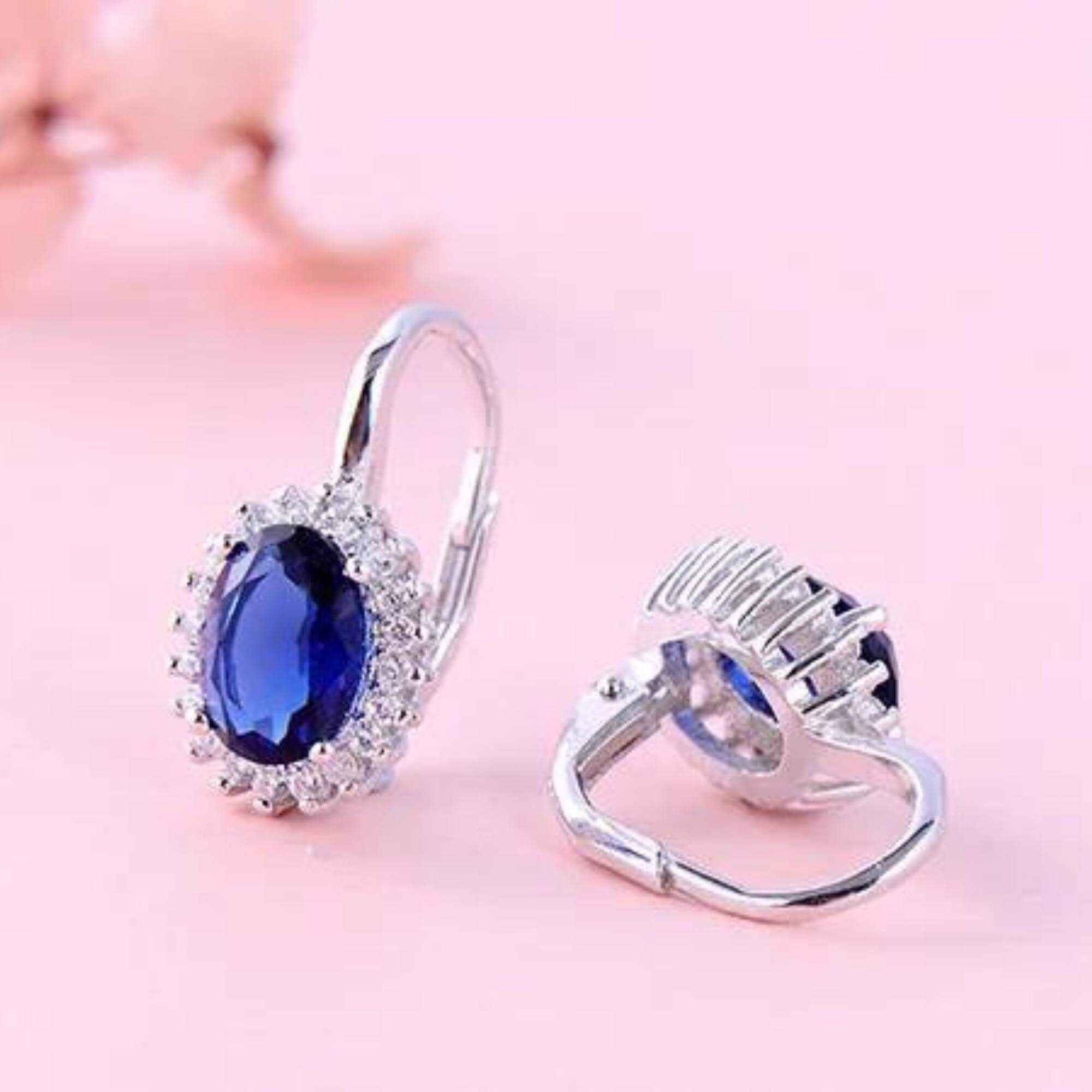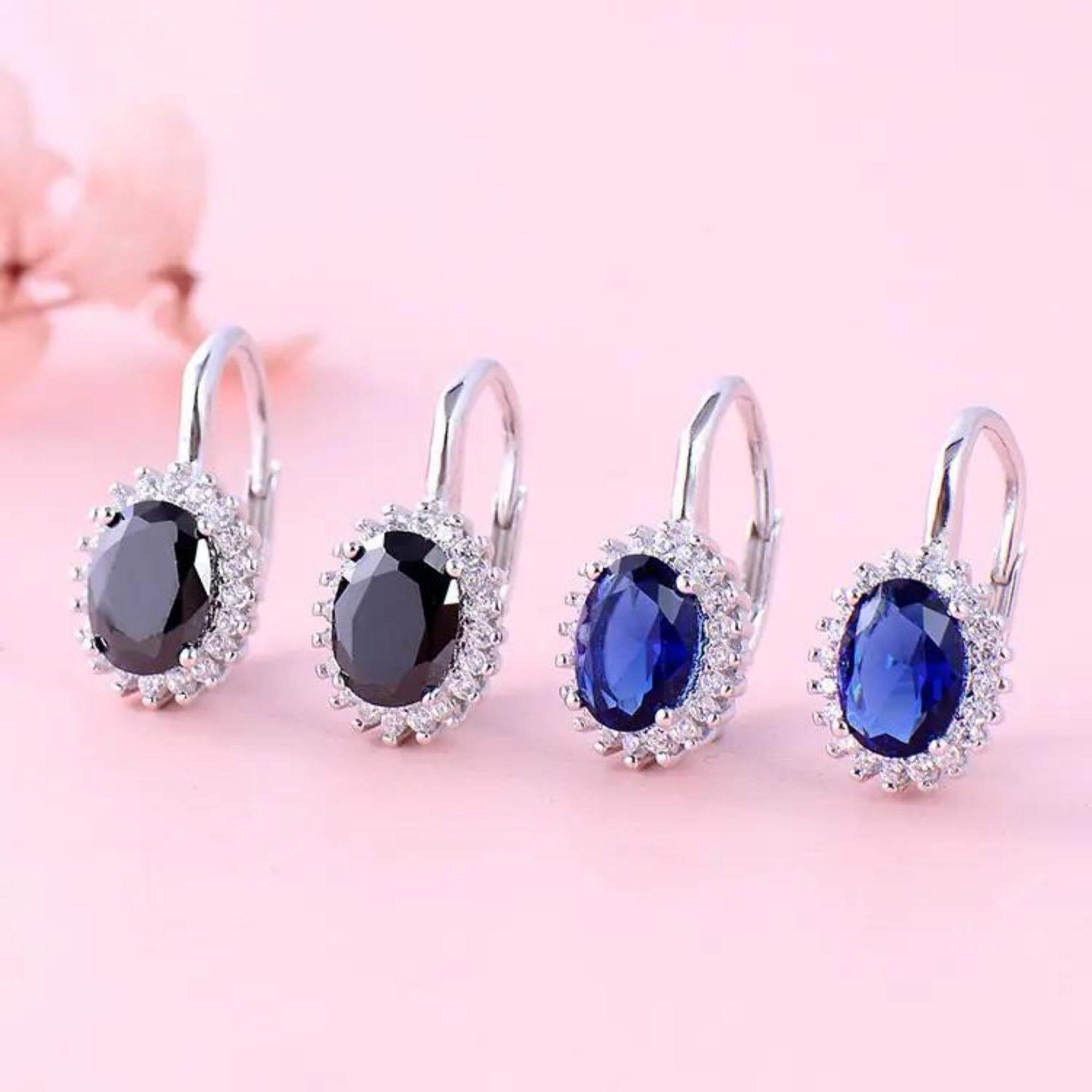 Silver earrings featuring an oval-cut crystal in blue or black, surrounded by smaller cubic zirconia gems. The contrast between the center stone and the frame gives the piece structure and color without being too bold.