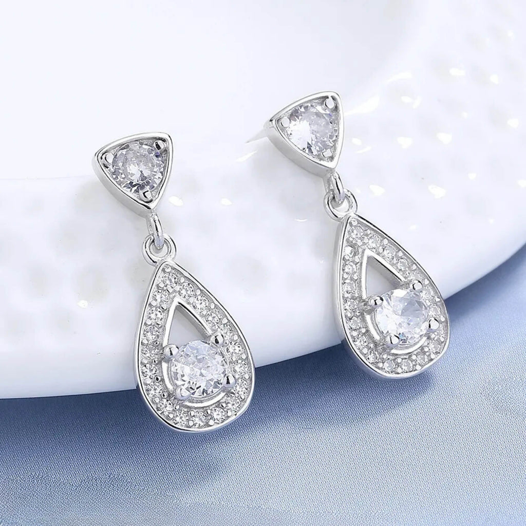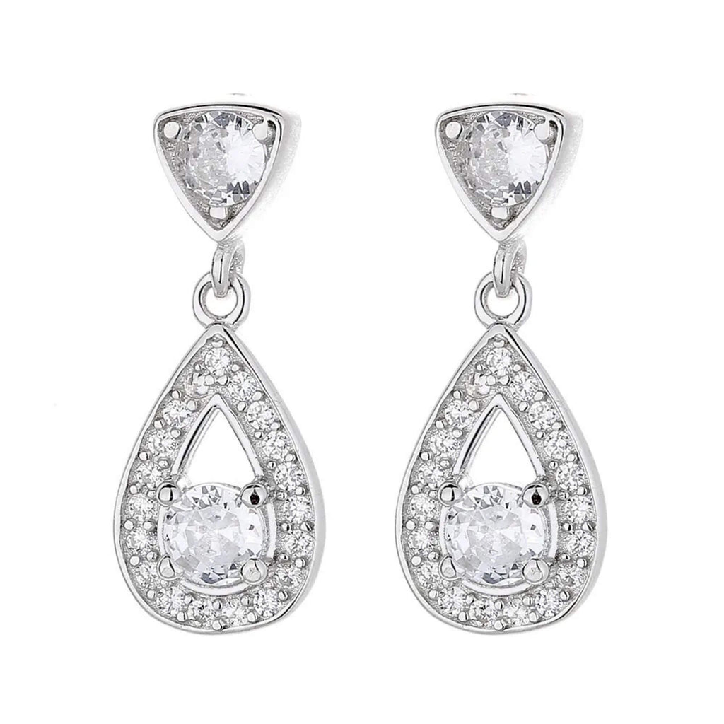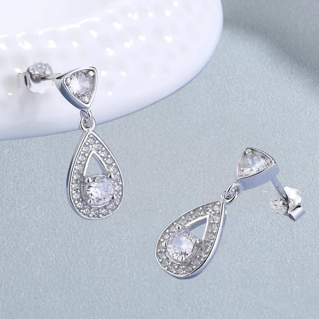 Silver drop earrings combining a triangular stud with a teardrop-shaped dangle, both accented with clear cubic zirconia stones. The pairing of shapes adds contrast without feeling too bold. A light, balanced design that brings a touch of sparkle to your look.