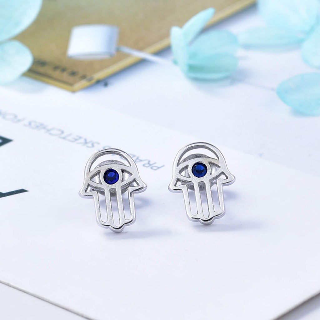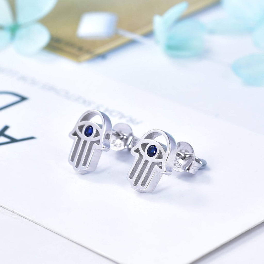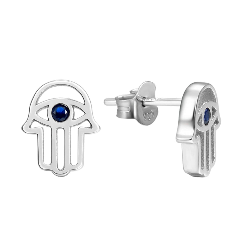 Shaped like tiny Hamsa palms, these silver earrings are rooted in tradition and carry the message of protection and good fortune. A bright blue crystal at the center adds color and a gentle reminder of positivity.