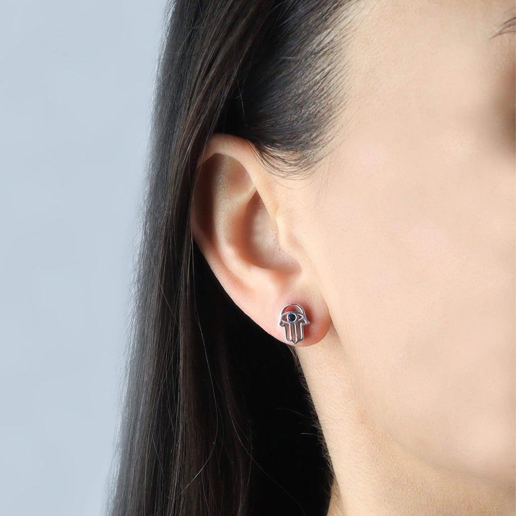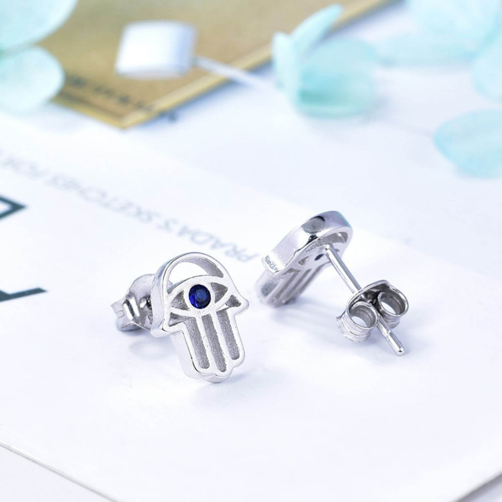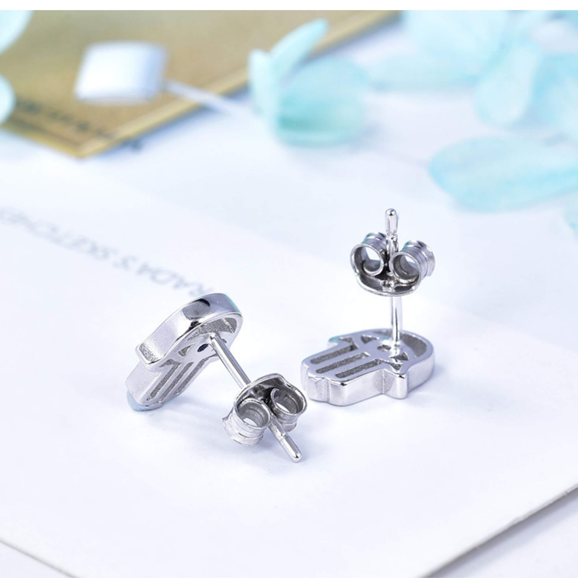 Shaped like tiny Hamsa palms, these silver earrings are rooted in tradition and carry the message of protection and good fortune. A bright blue crystal at the center adds color and a gentle reminder of positivity.