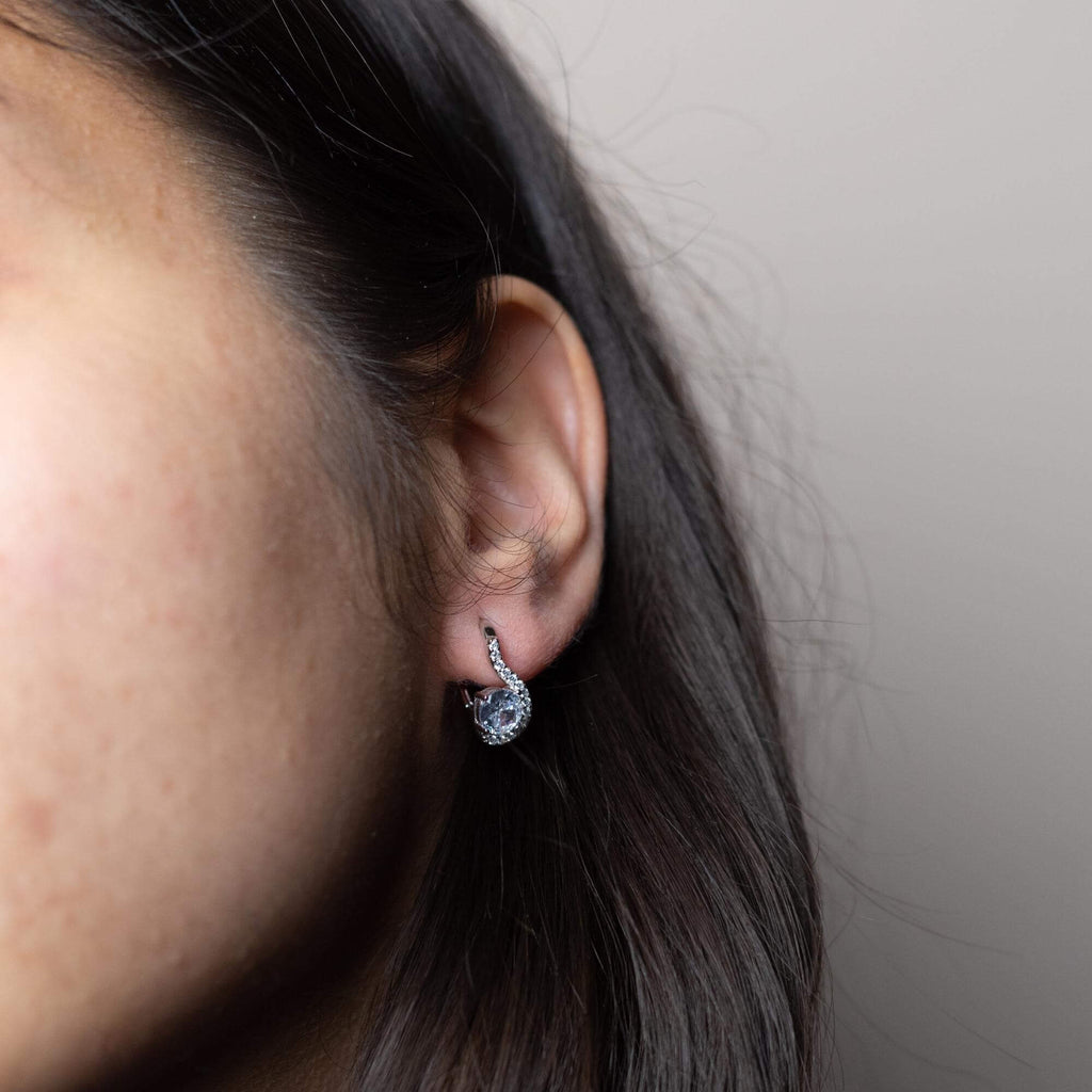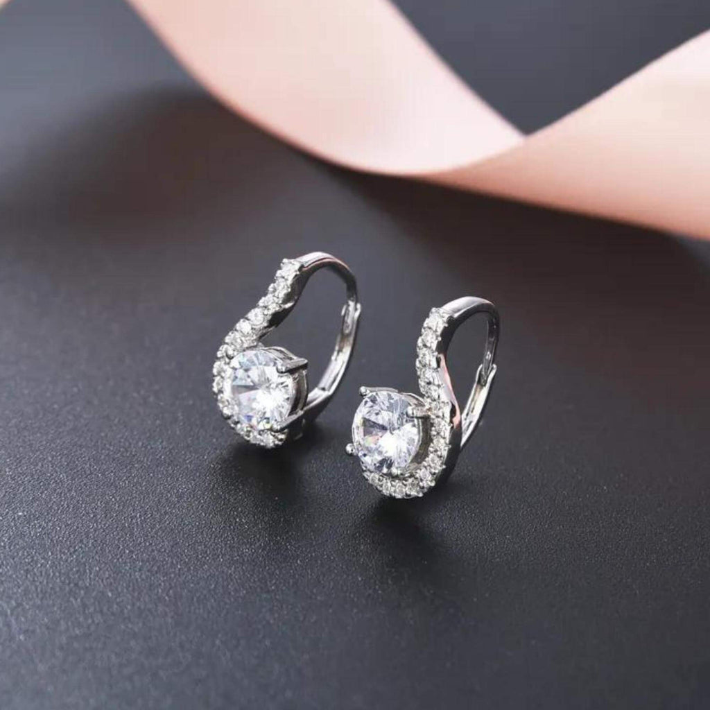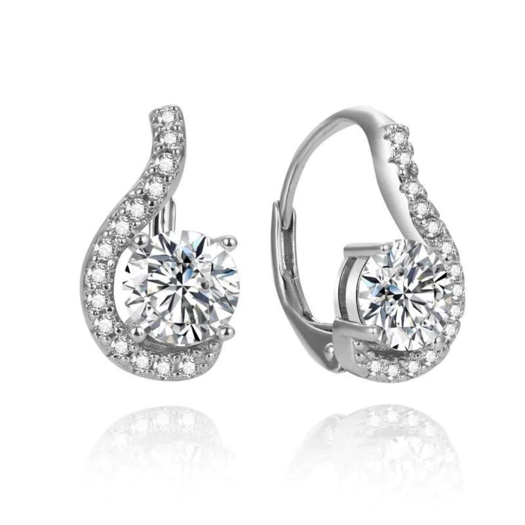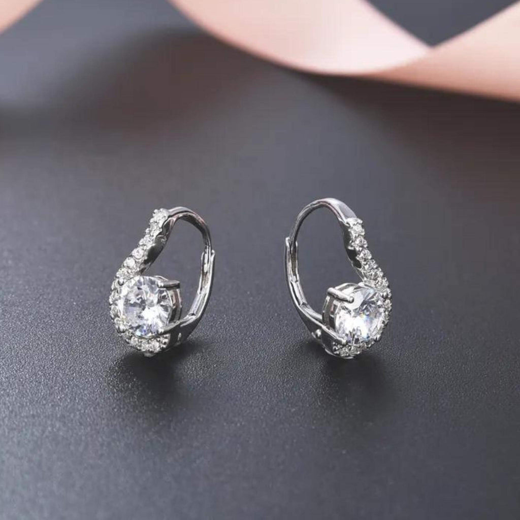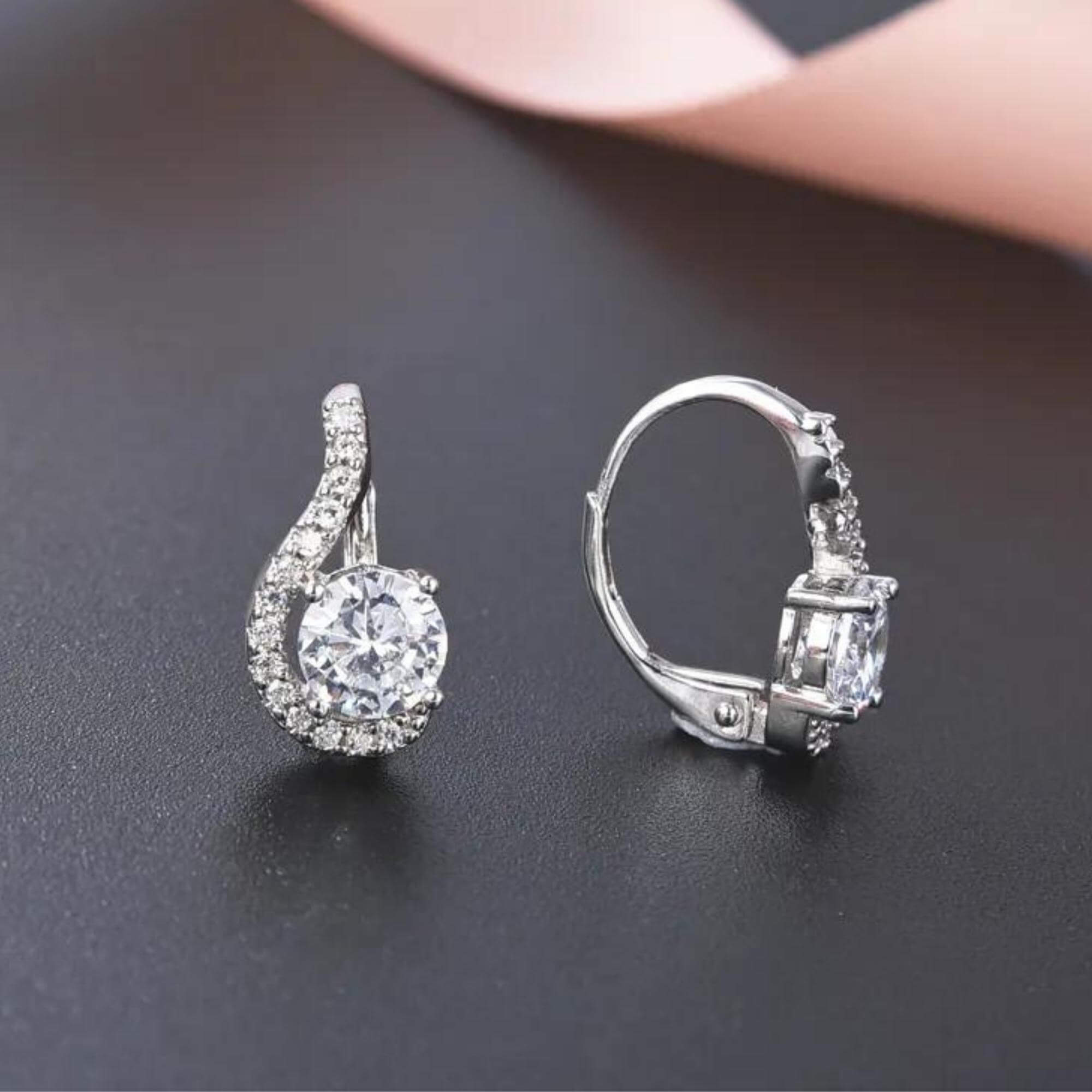 Silver earrings with a large round cubic zirconia, accented by an asymmetrical arc of smaller gemstones. A striking yet balanced design that is a perfect choice for formal occasions.
