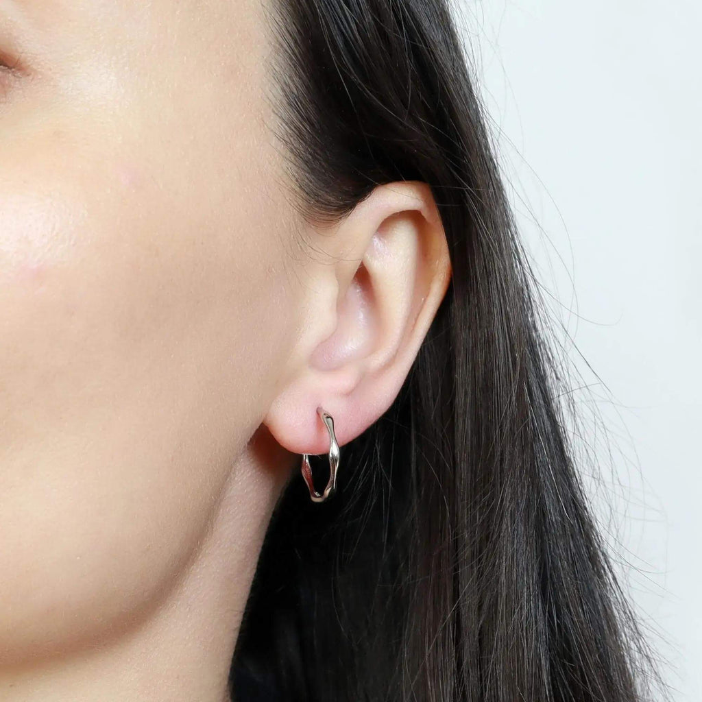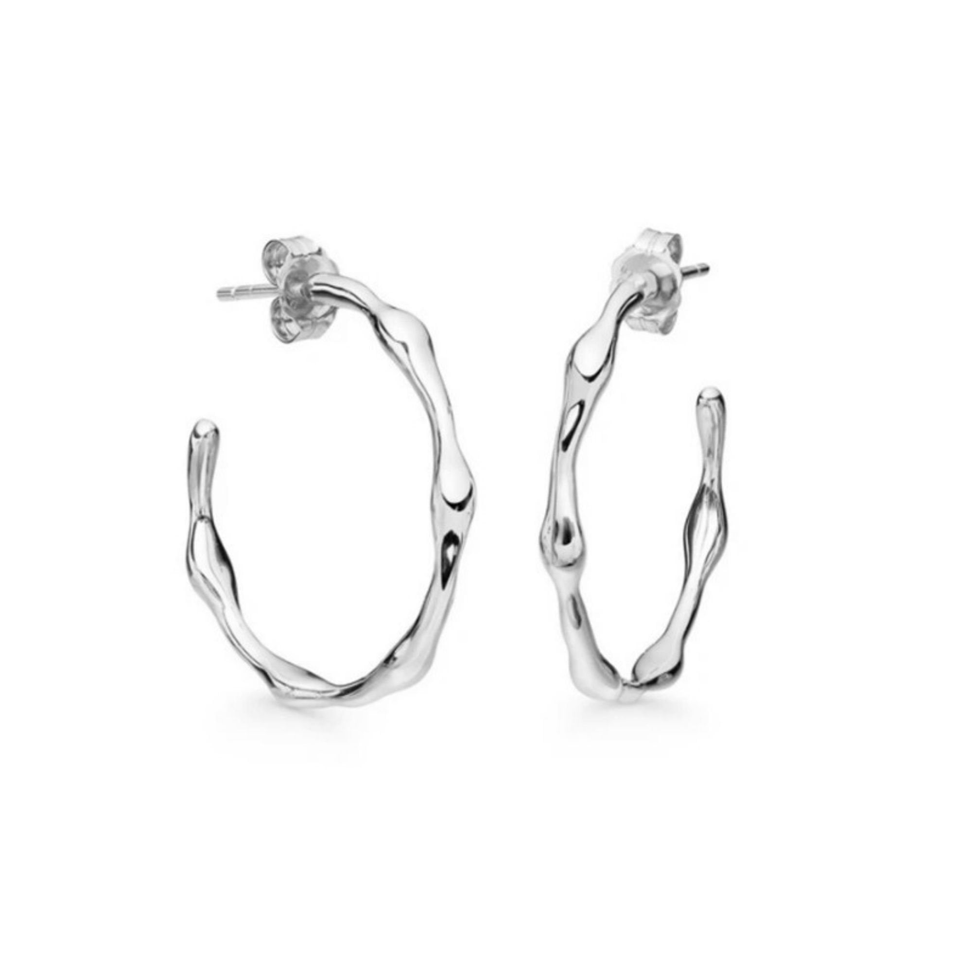 A pair of silver earrings that reimagines the hoop in a more subtle way. The curved shape and gleaming surface create a distinctive outline that feels fresh yet familiar. Comfortable and secure, they are built for everyday ease.