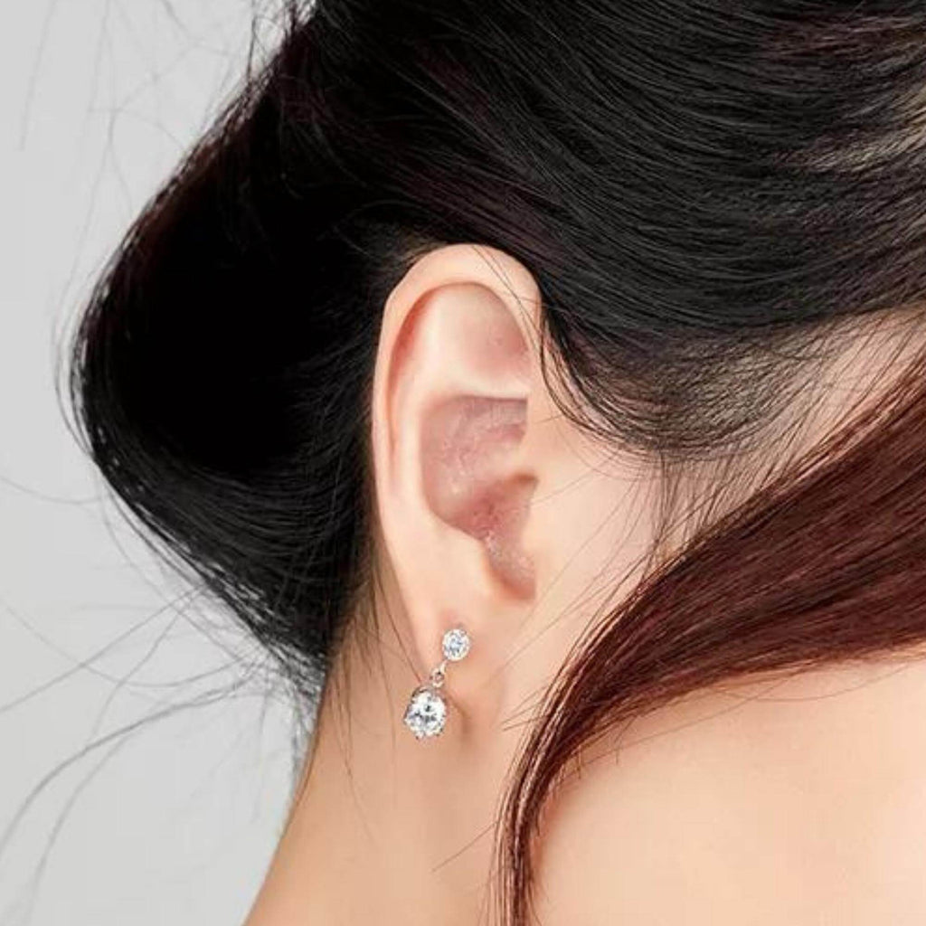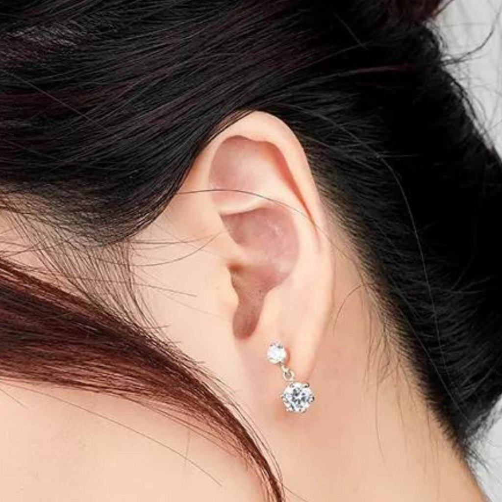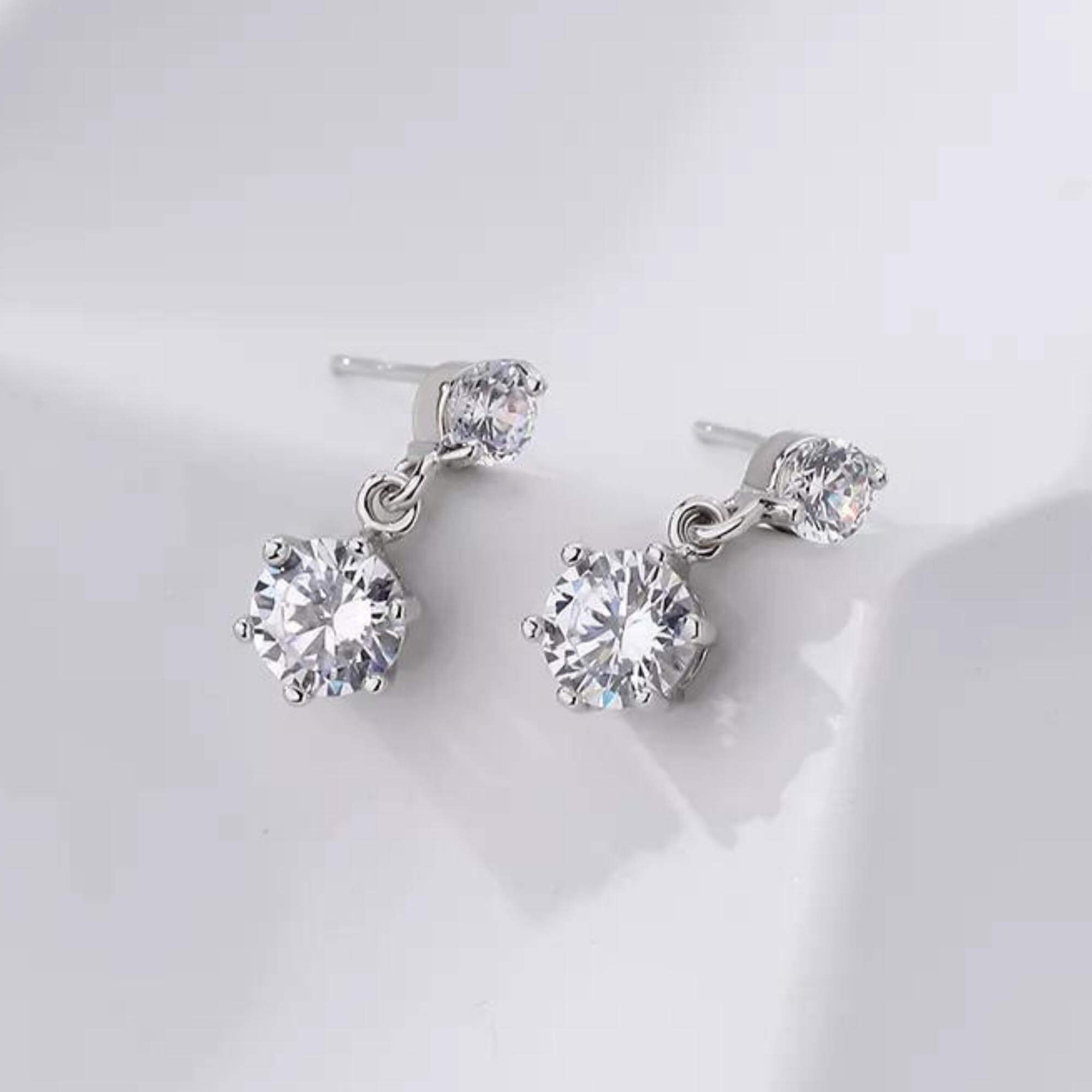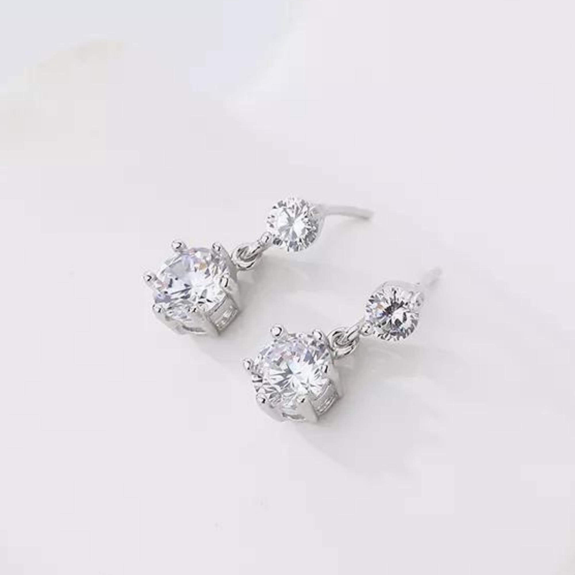 Silver drop earrings featuring two cubic zirconia stones. The smaller gem sits at the lobe, while the larger one hangs just below, adding a soft touch of sparkle. Lightweight and timeless, they are an easy and versatile choice for all types of outfits.