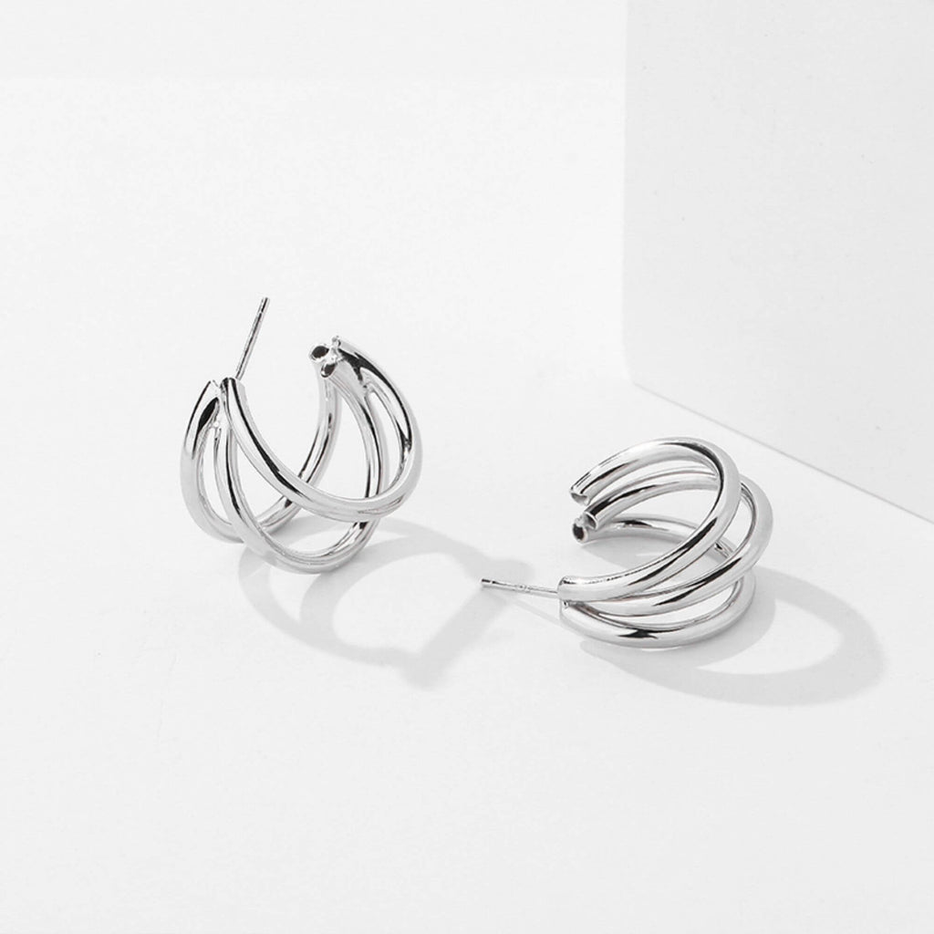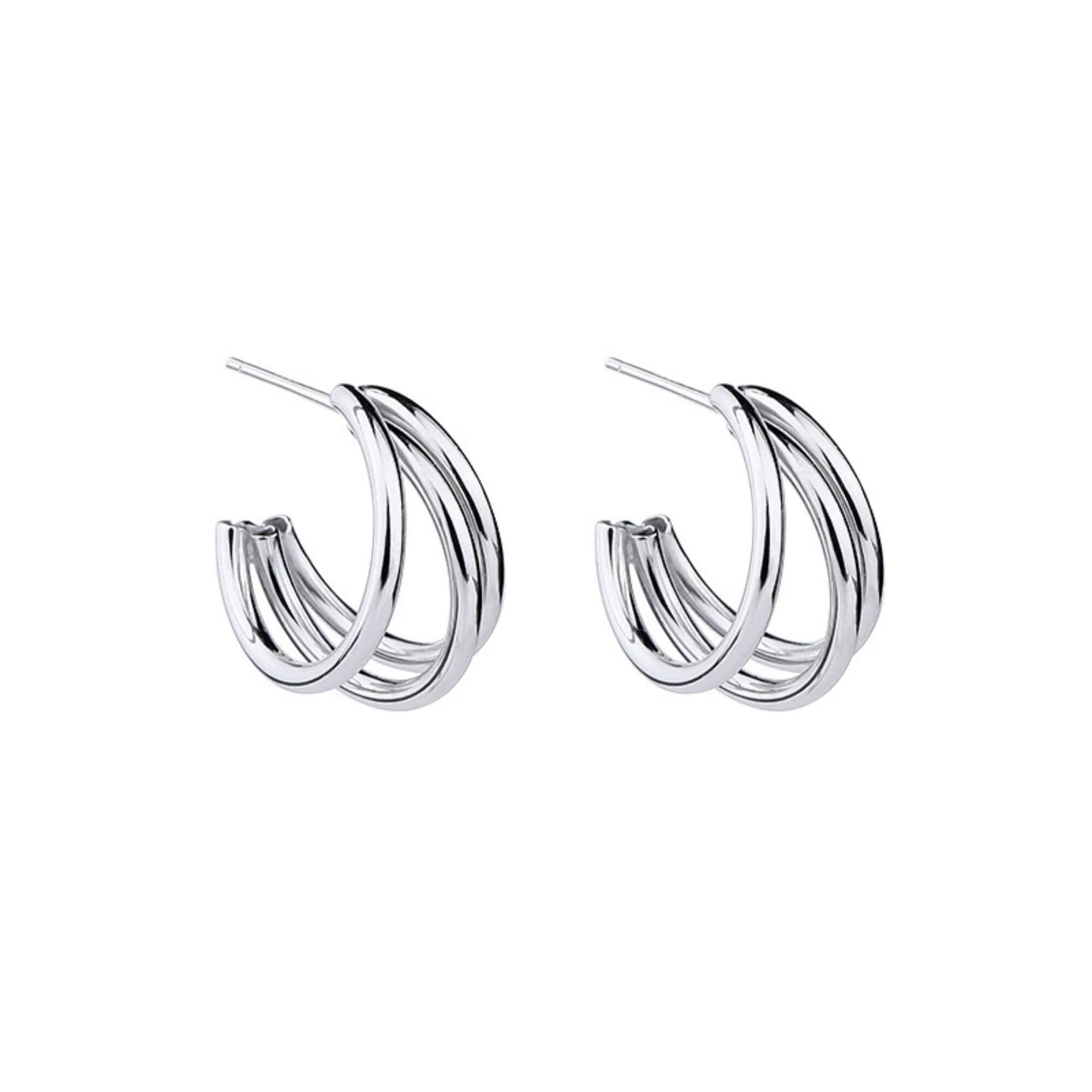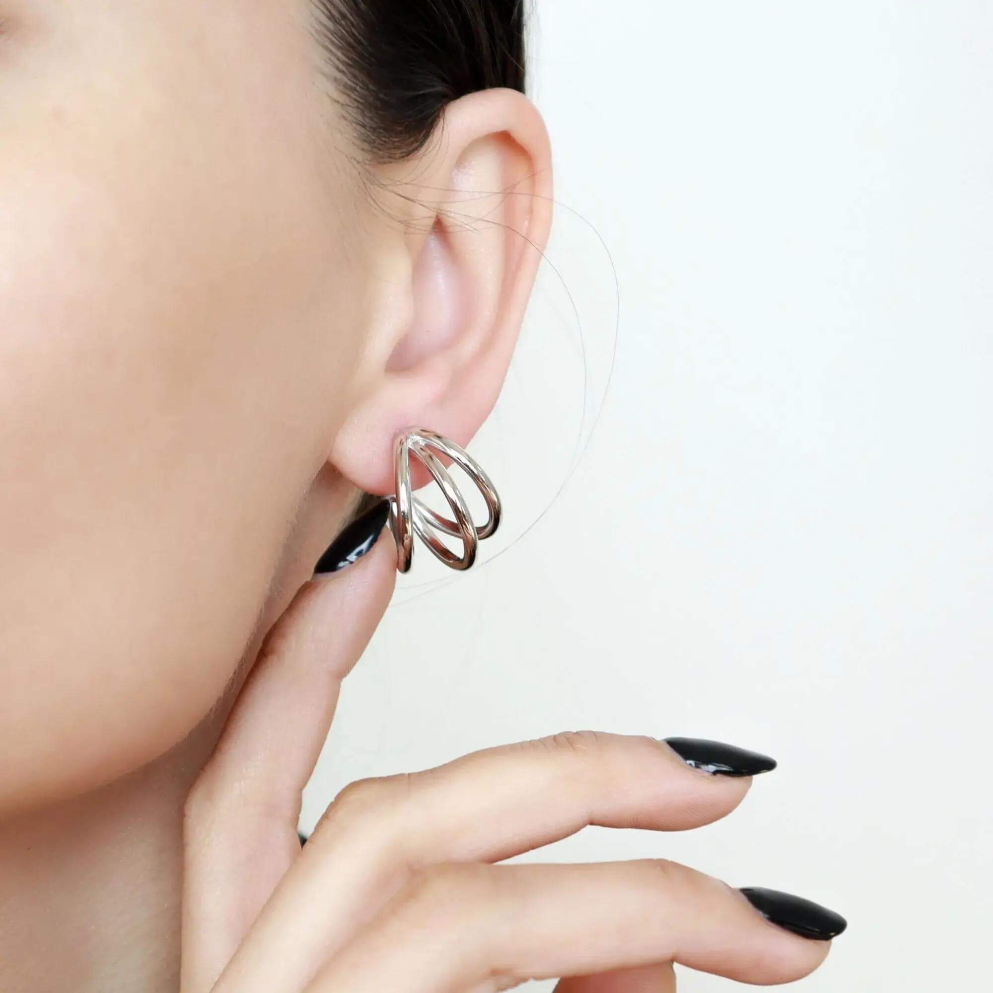 A pair of silver earrings made from three open half-hoops arranged to create a layered and dimensional design. Distinct and modern, this style will add personality to even the simplest outfit.