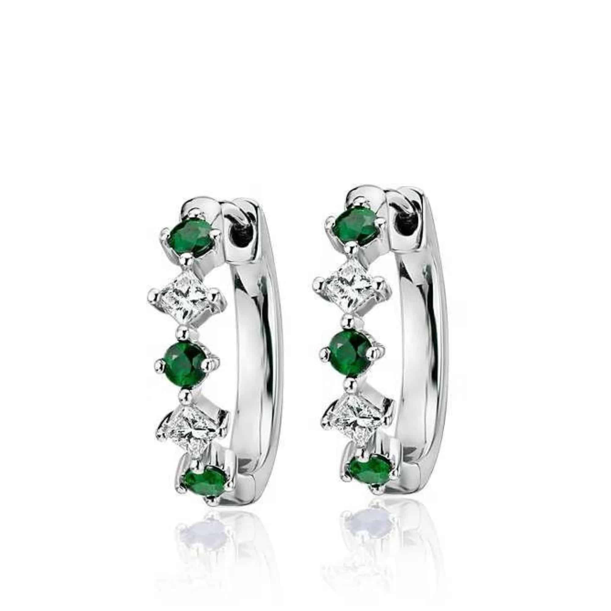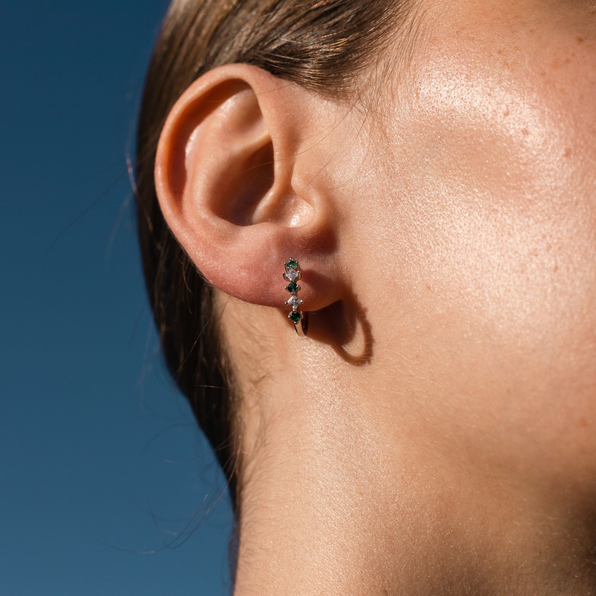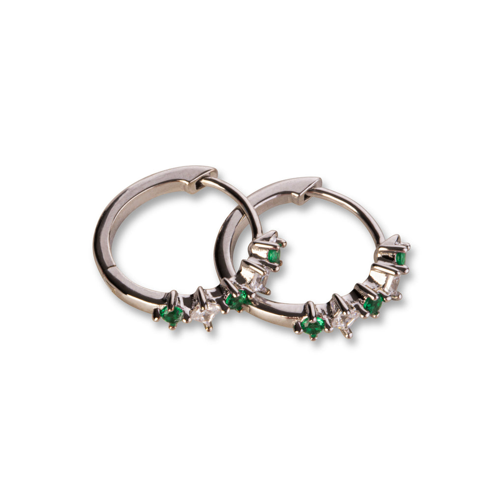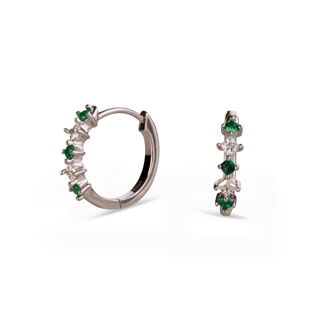 Silver hoop earrings featuring a pattern of alternating green and clear cubic zirconia gemstones in round and princess cuts. The mix of shapes and color creates a fresh, contemporary look while staying true to a classic silhouette. A great choice for adding color and structure to your everyday style.